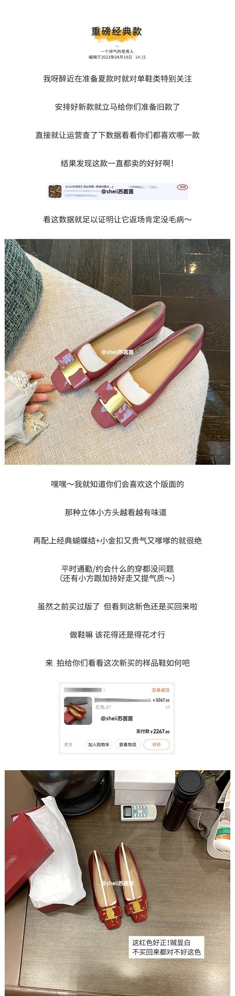 [Sheii Su Yinyin] 신임 감독 ~ 스퀘어 헤드 가죽 보우 골드 버튼 얕은 입 플랫 슈즈 여성 통근 신발스토어 가기