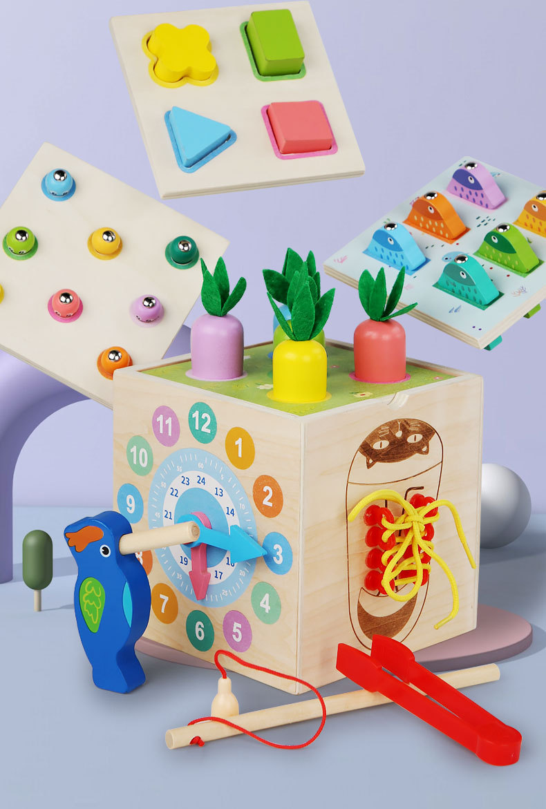 몬테소리 장난감 0-3세 8-in-1 조기교육 박스 다기능 낚시, 곤충 잡기, 당근 뽑기, 동전 던지기, 공 던지기 박스 목표 박스 장난감스토어 가기