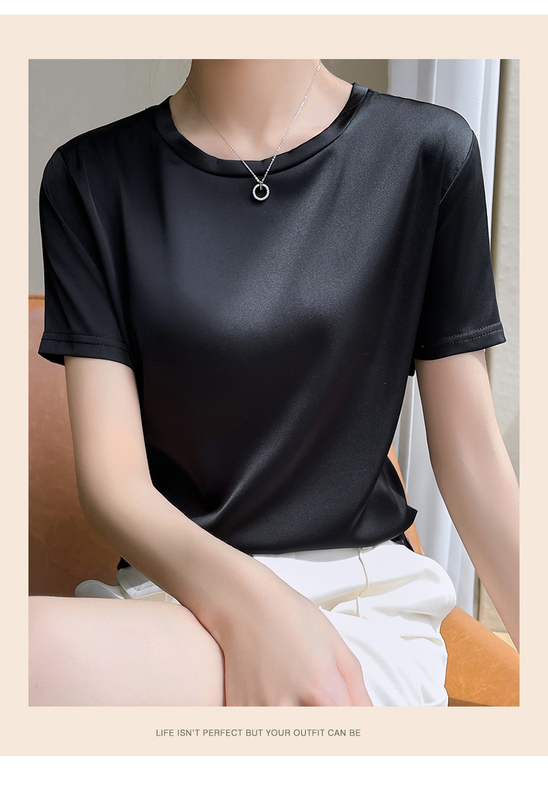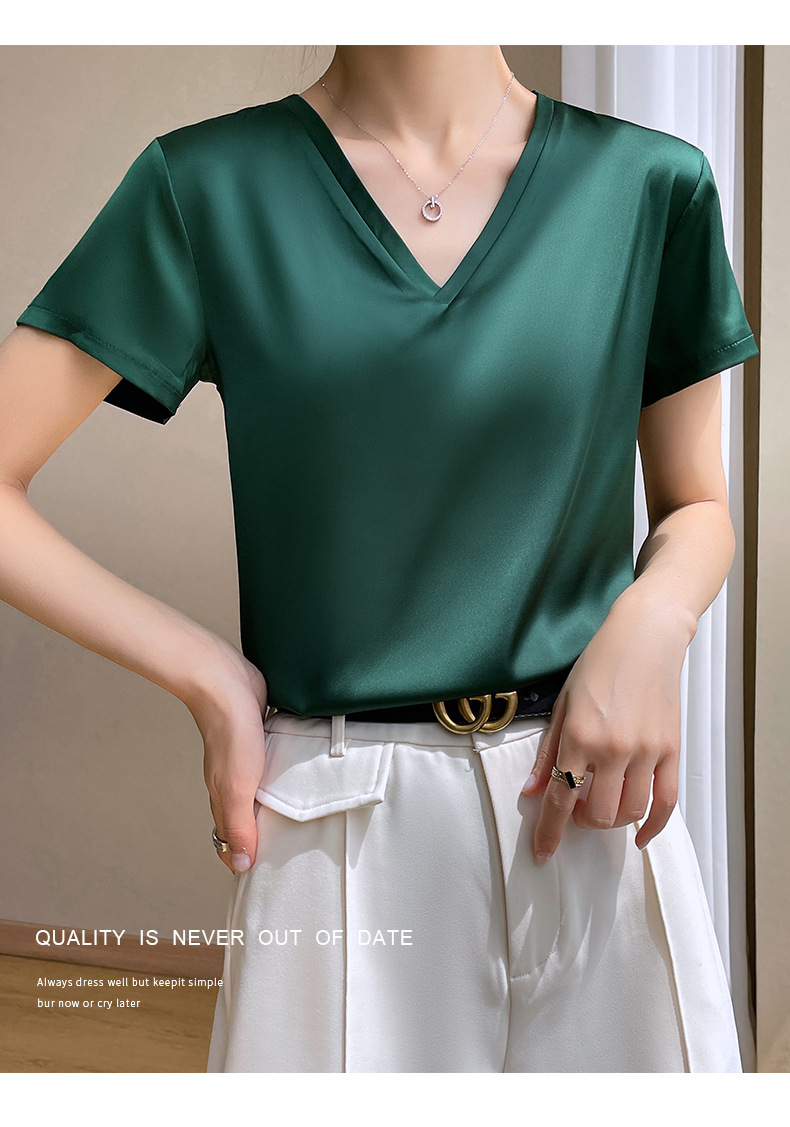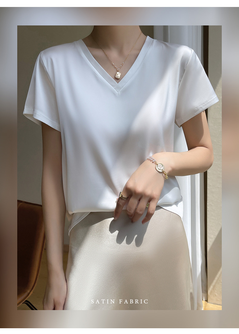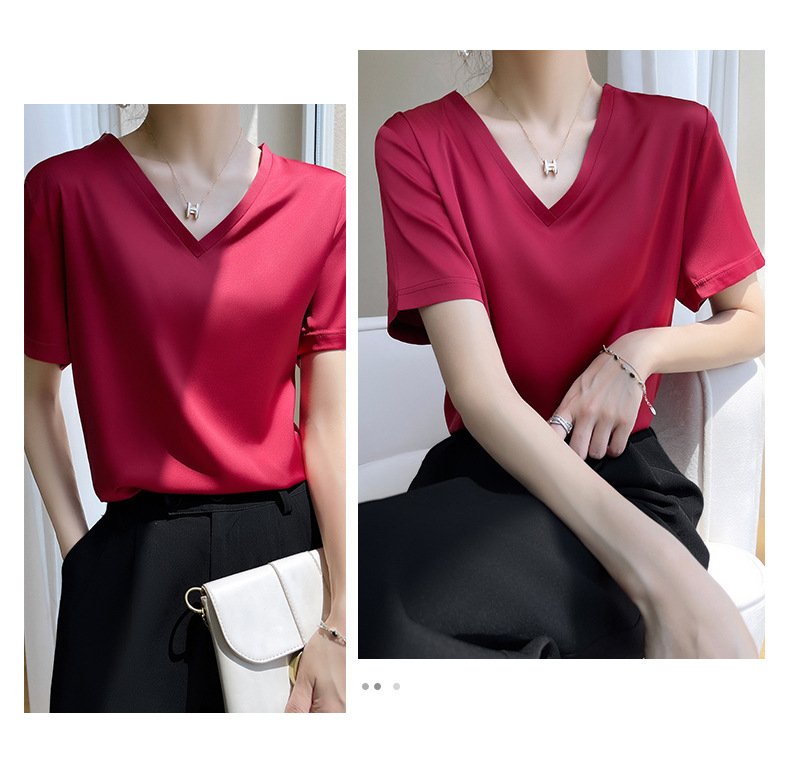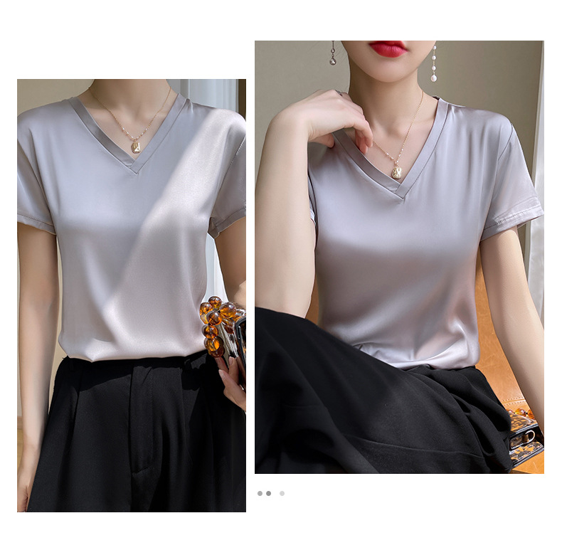 모조 실크 새틴 반팔 2023 여름 여성의 새로운 느슨한 V-넥 단색 심플 슬라이딩 멋진 질감 티셔츠 탑스토어 가기