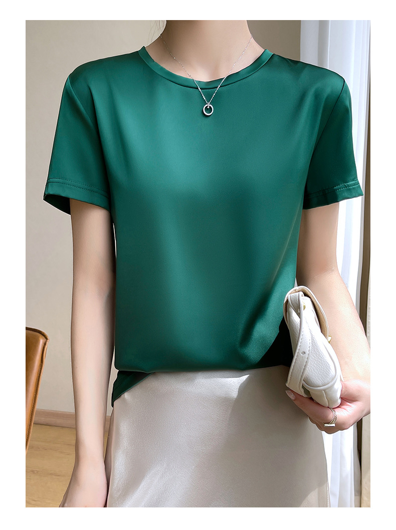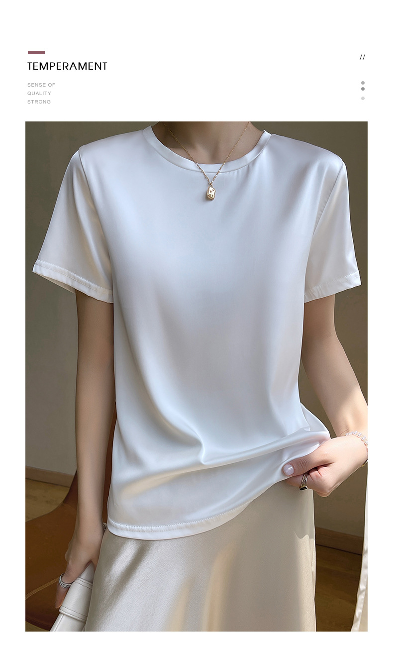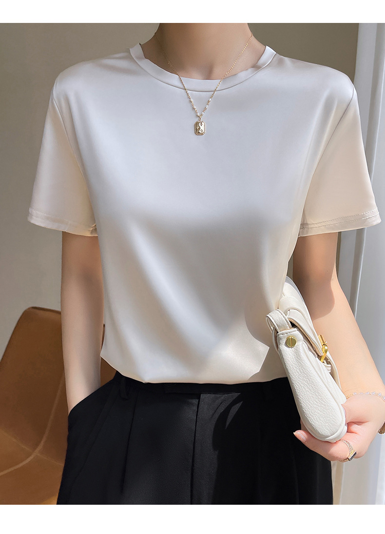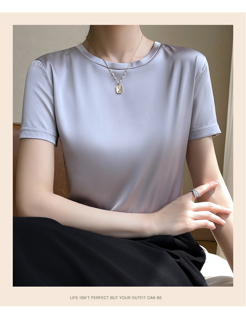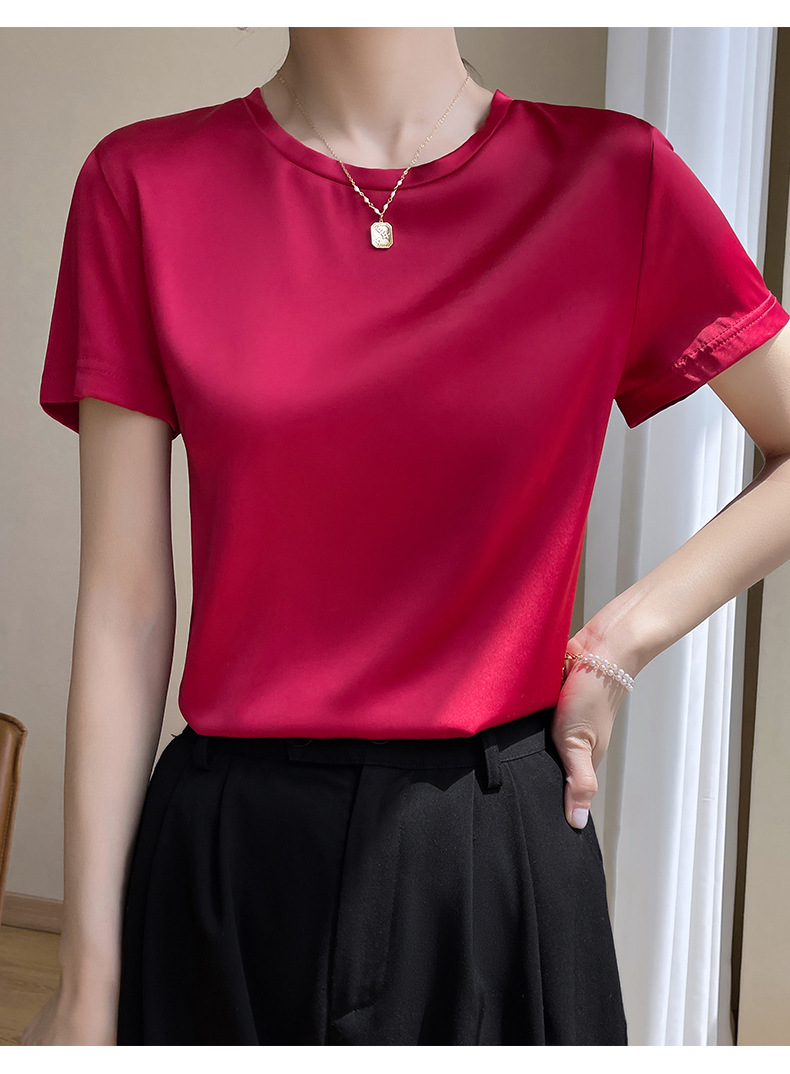 모조 실크 새틴 반팔 2023 여름 여성의 새로운 느슨한 V-넥 단색 심플 슬라이딩 멋진 질감 티셔츠 탑스토어 가기