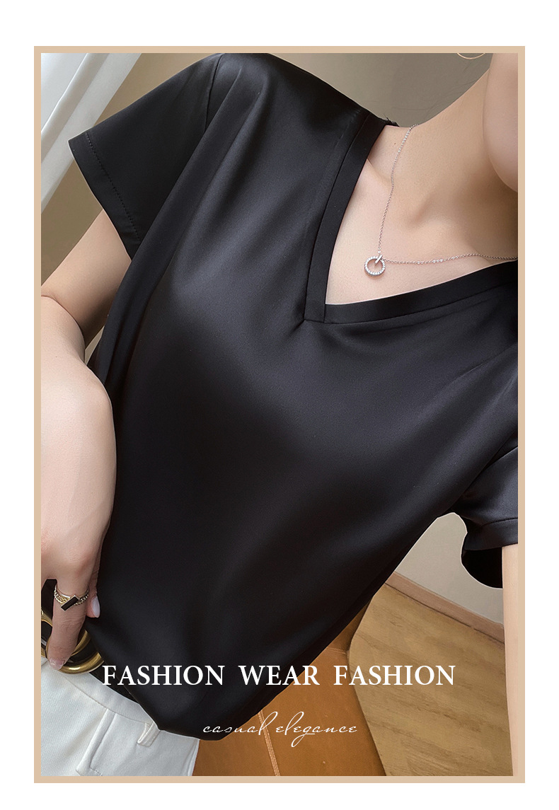 모조 실크 새틴 반팔 2023 여름 여성의 새로운 느슨한 V-넥 단색 심플 슬라이딩 멋진 질감 티셔츠 탑