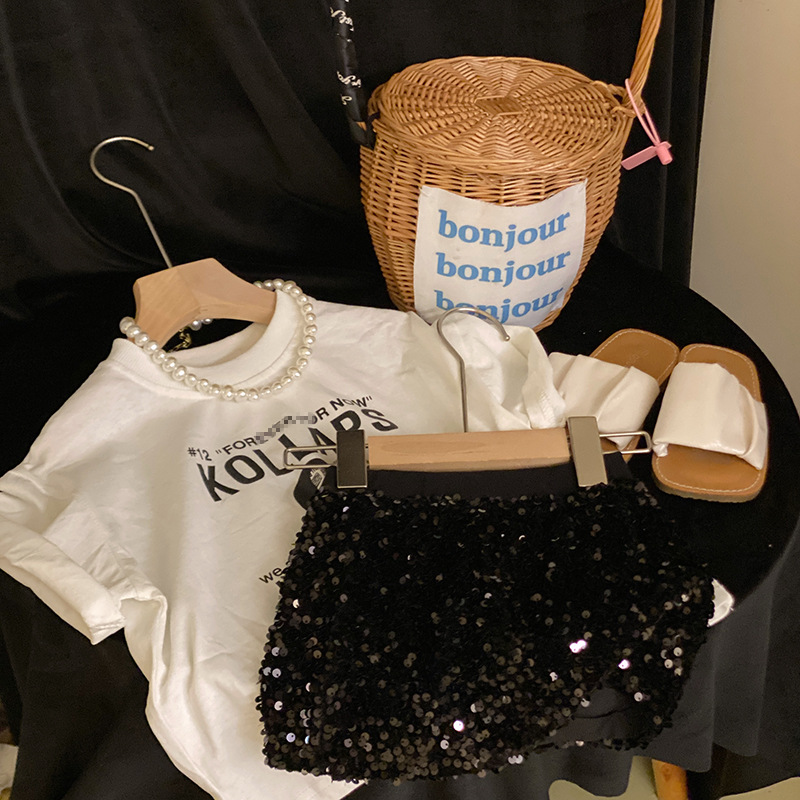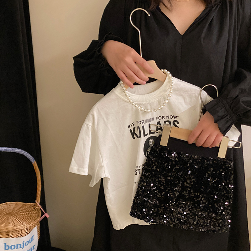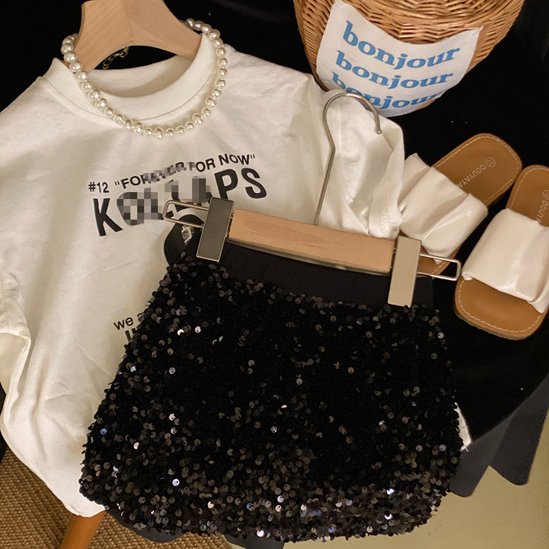 한국 스타일 아동복 2023 여름 새 여아 유행 편지 반팔 티셔츠 사이버 연예인 스팽글 스커트 세트 유행스토어 가기