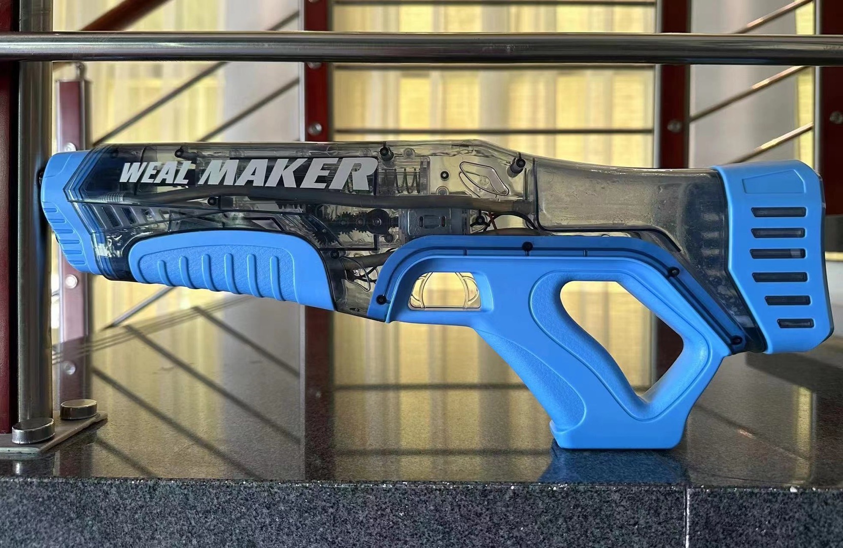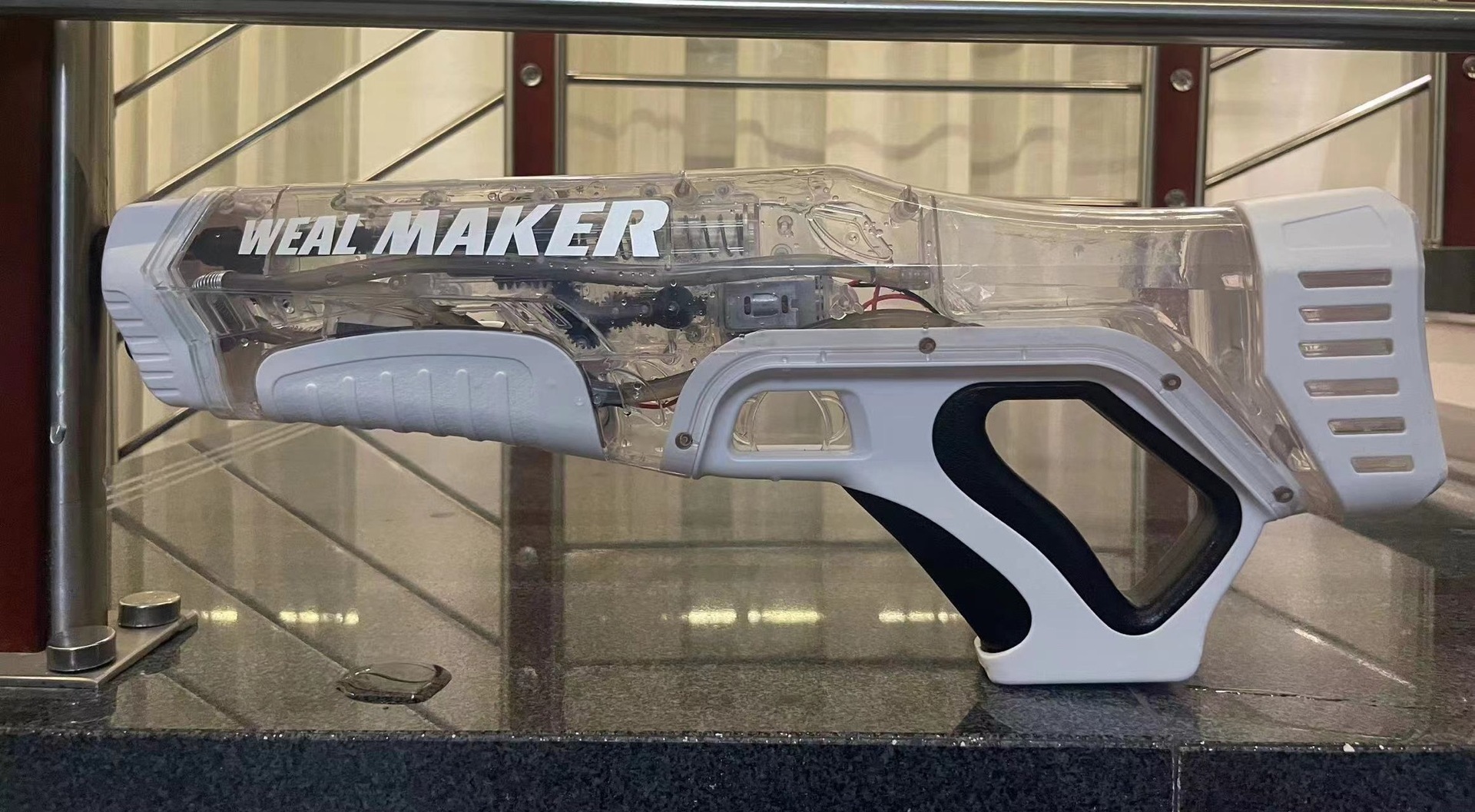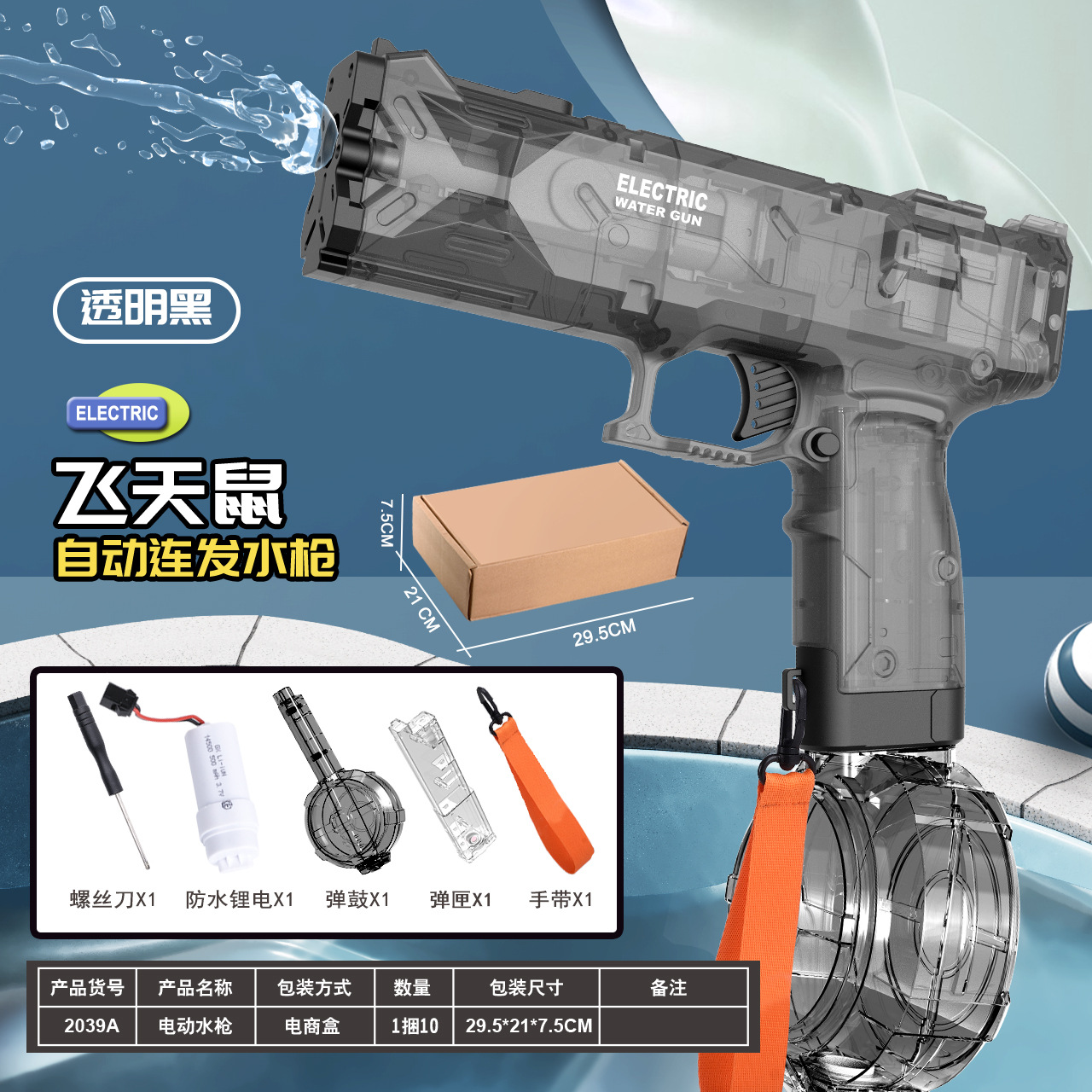 【英文邮购盒】(无护目镜):水枪*1,弹鼓*1,弹夹*1,锂电套装*1
