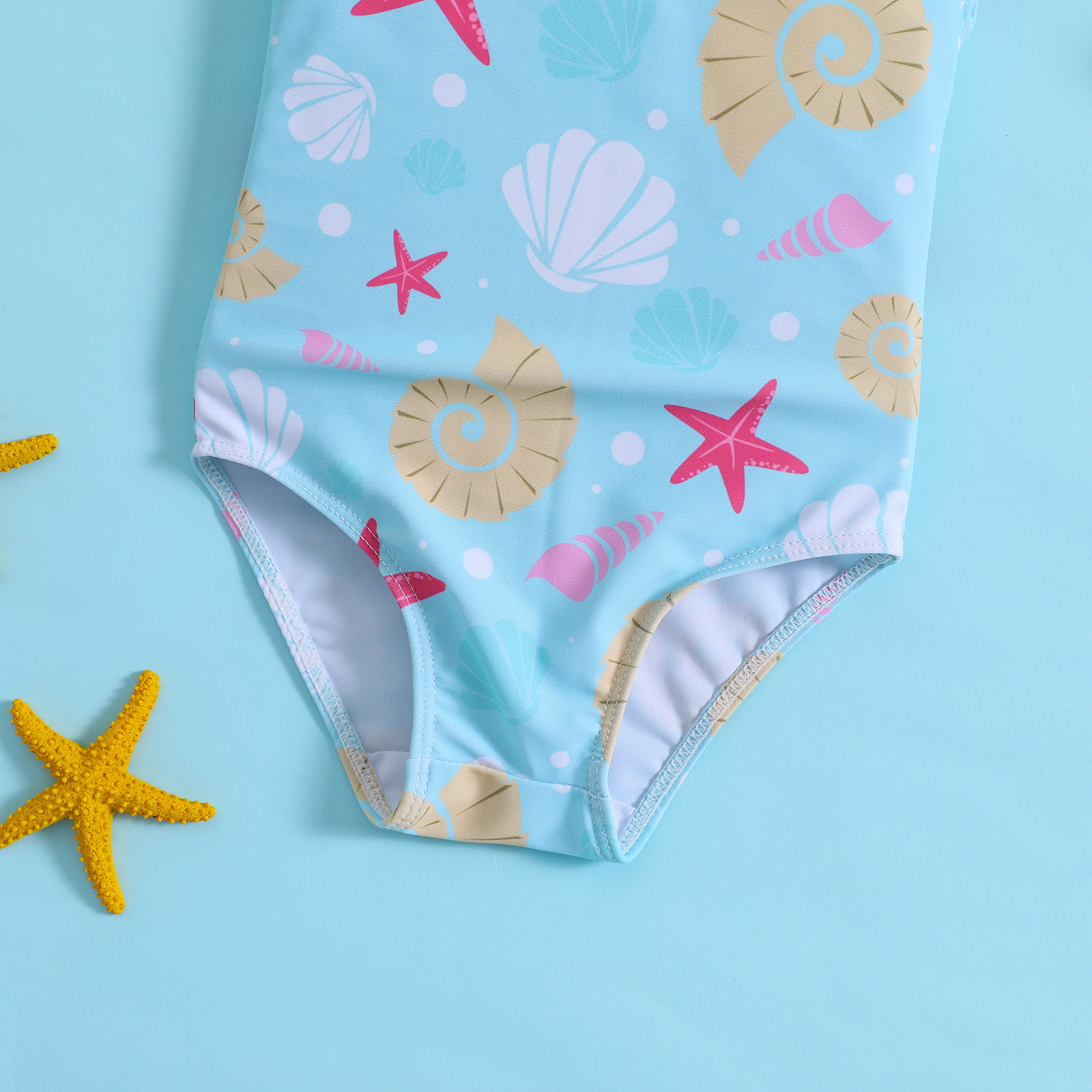 어린이와 아기 소녀를위한 국경 간 대외 무역 불가사리 껍질 인쇄 결합 연꽃 잎 활 수영복스토어 가기