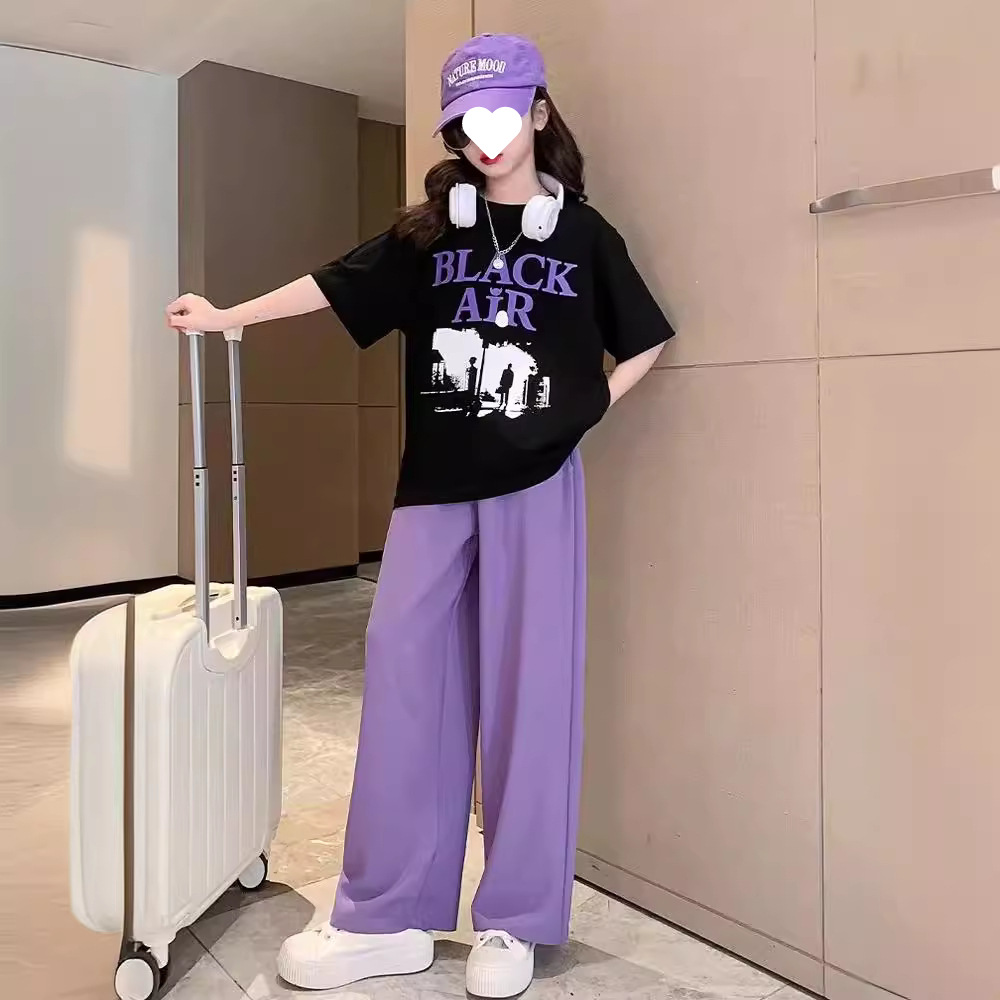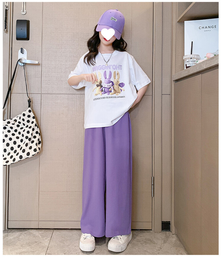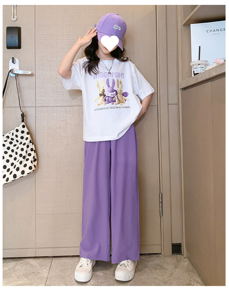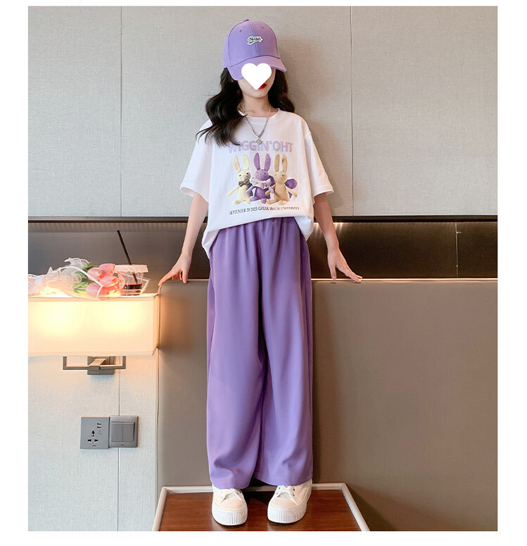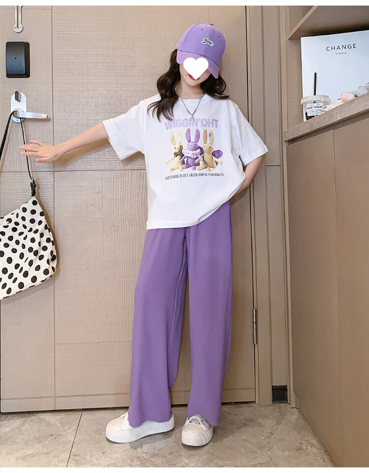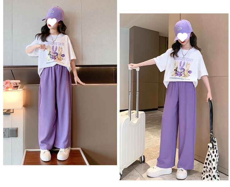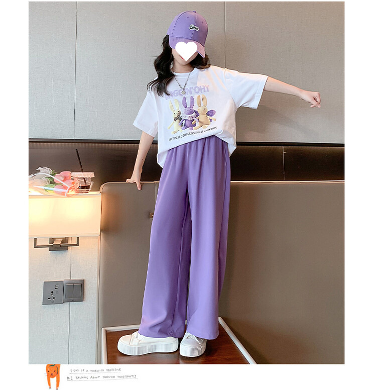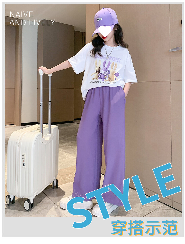 아동복 여름 착용 스포츠 세트 2023 새로운 어린이 소녀 만화 반 소매 티셔츠 와이드 레그 팬츠 투피스 유행스토어 가기