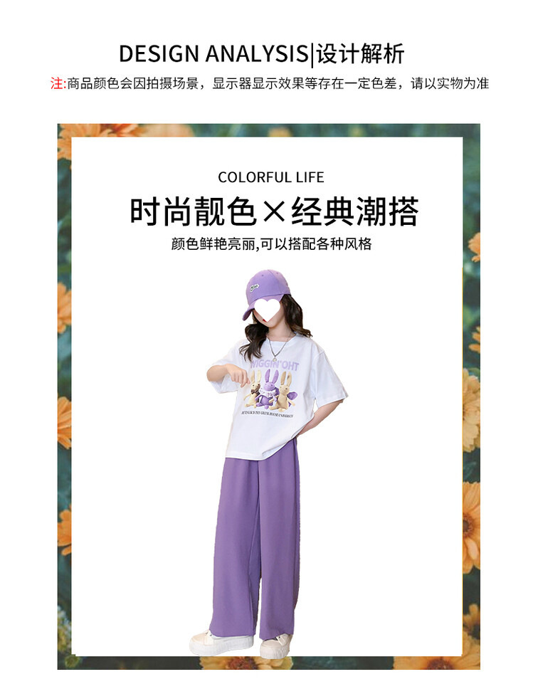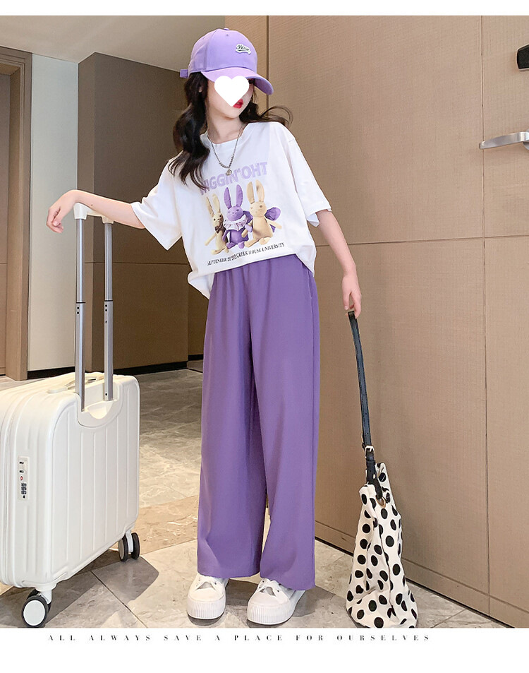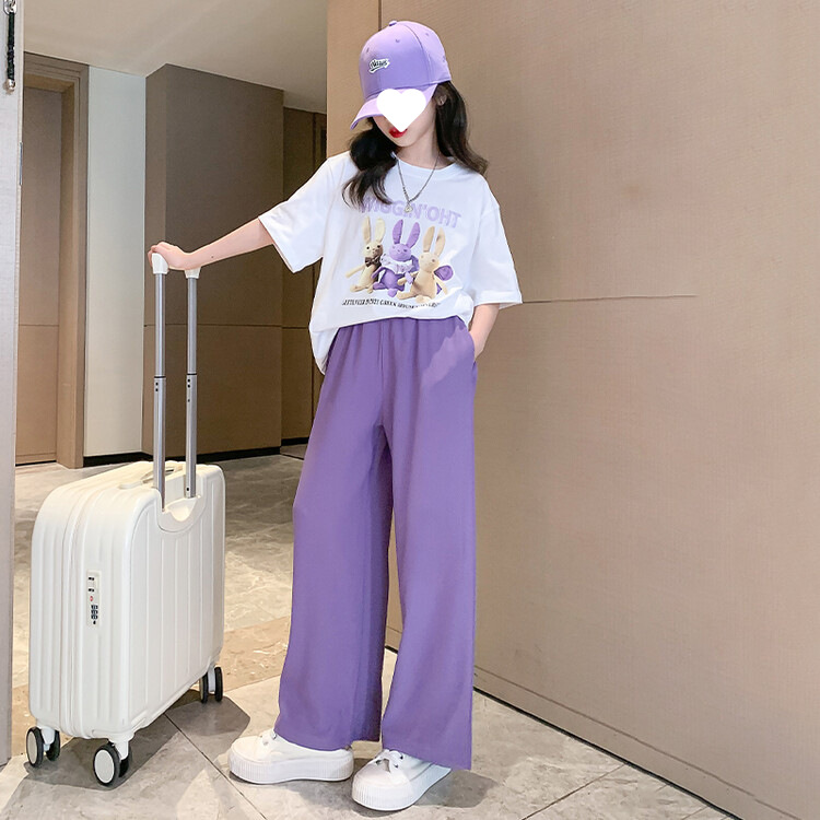 아동복 여름 착용 스포츠 세트 2023 새로운 어린이 소녀 만화 반 소매 티셔츠 와이드 레그 팬츠 투피스 유행
