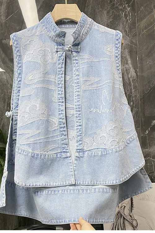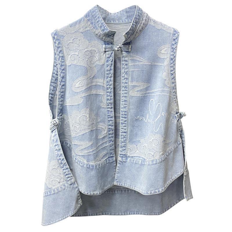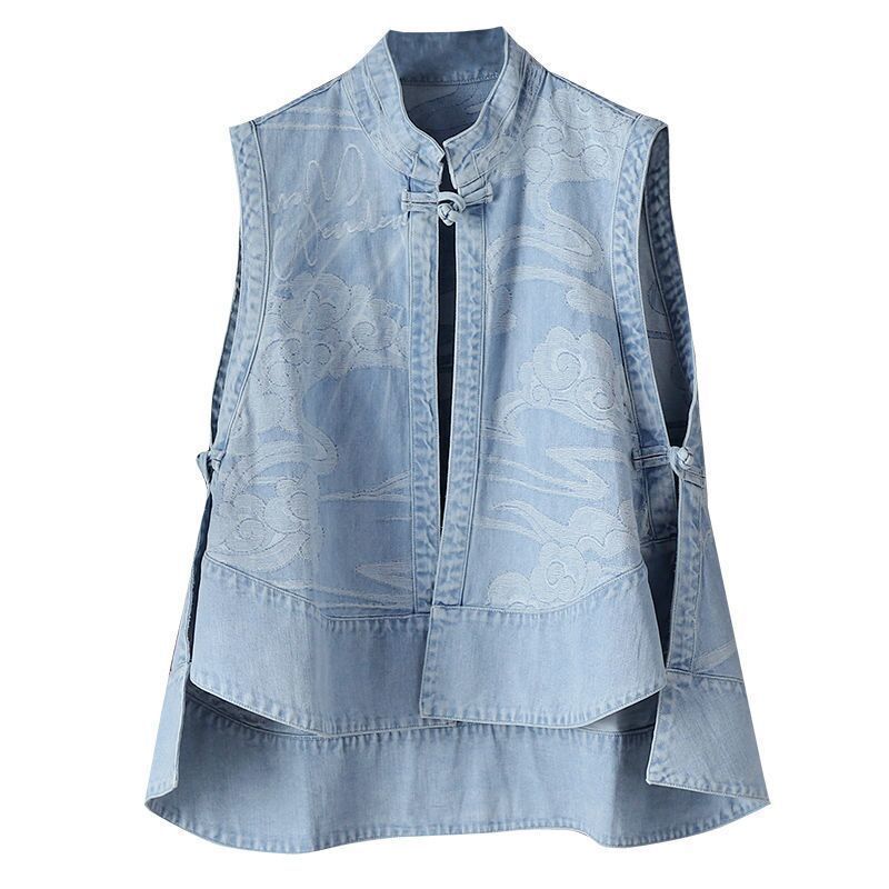 여성을위한 국가 스타일 데님 조끼 봄, 가을 새로운 느슨한 얇은 민족 스타일 중국 스타일 버클 조끼 카디건 재킷