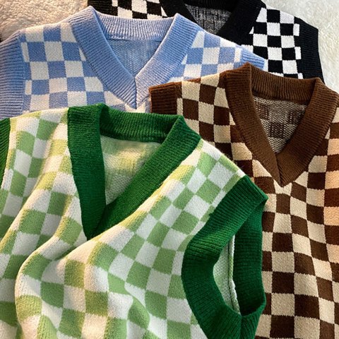 봄과 가을 2022 새로운 조끼 니트 여성용 바둑판 V-넥 탑 게으른 스타일 외부 스웨터 재킷스토어 가기
