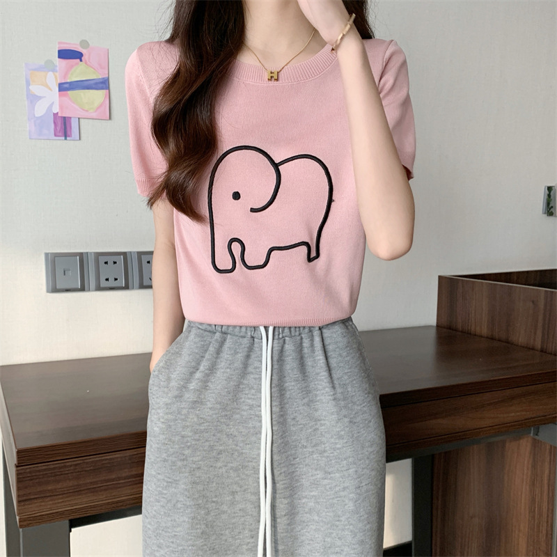 여름 새 티셔츠 느슨한 모든 매치 반팔 라운드 넥 자수 코끼리 얇은 아이스 실크 니트 셔츠 탑 여성용