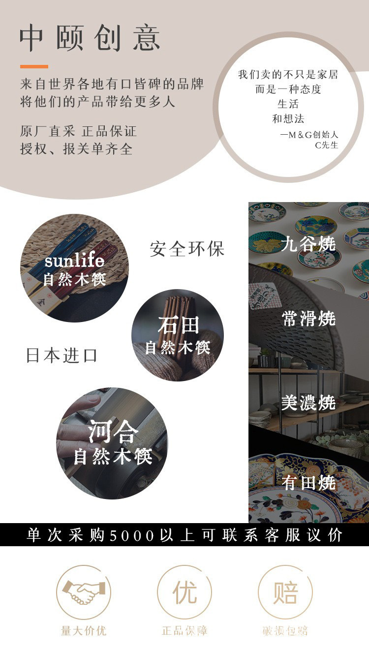 本公司提供全链路代理进口业务,可提供井泽、BLOOM、KAKUNI、Awasaka、光洋陶器、浜陶、和蓝、常滑烧、九谷烧、萩烧、高桑金属等数十种品牌的产品册来供挑选,详情可联络客服。