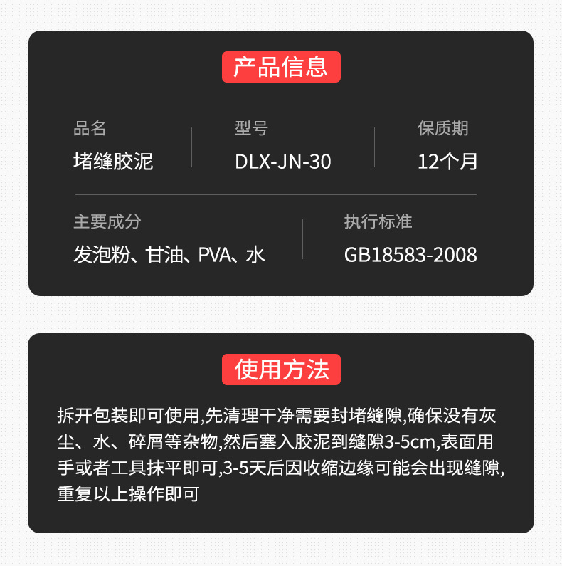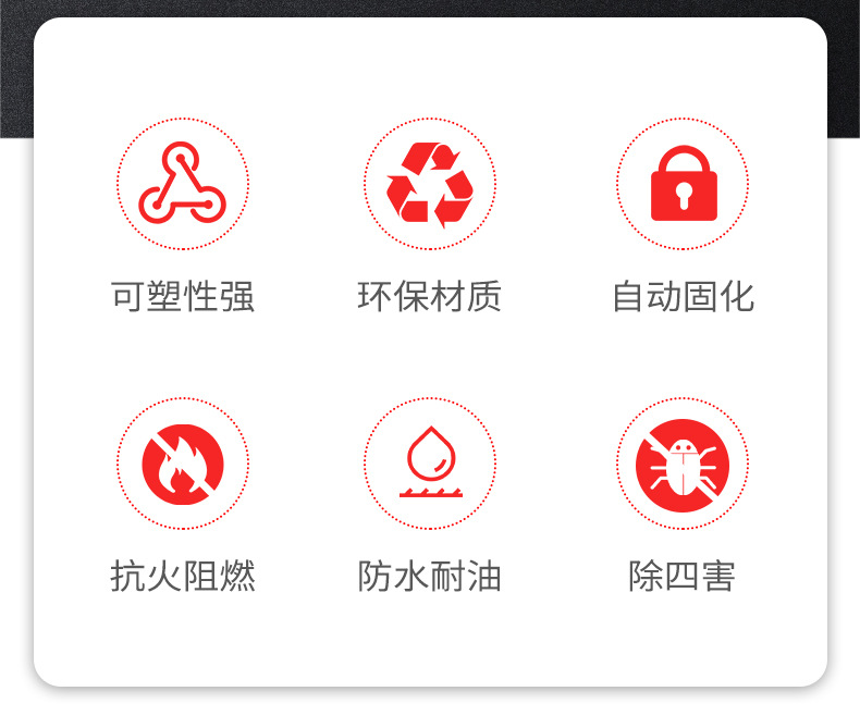 6. 施工方便:通常易于操作和涂抹,可以适应不同形状和尺寸的缝隙。