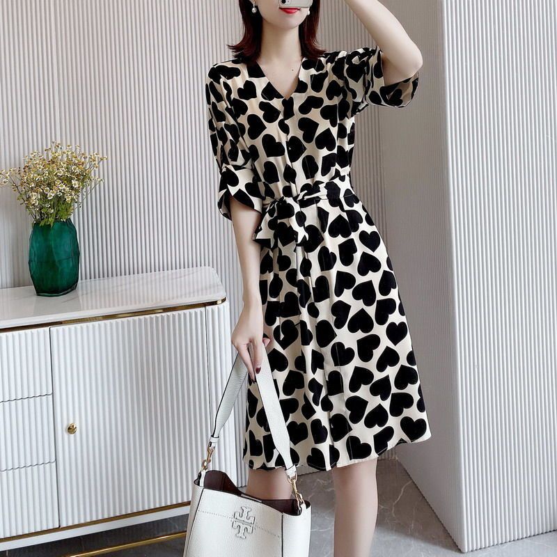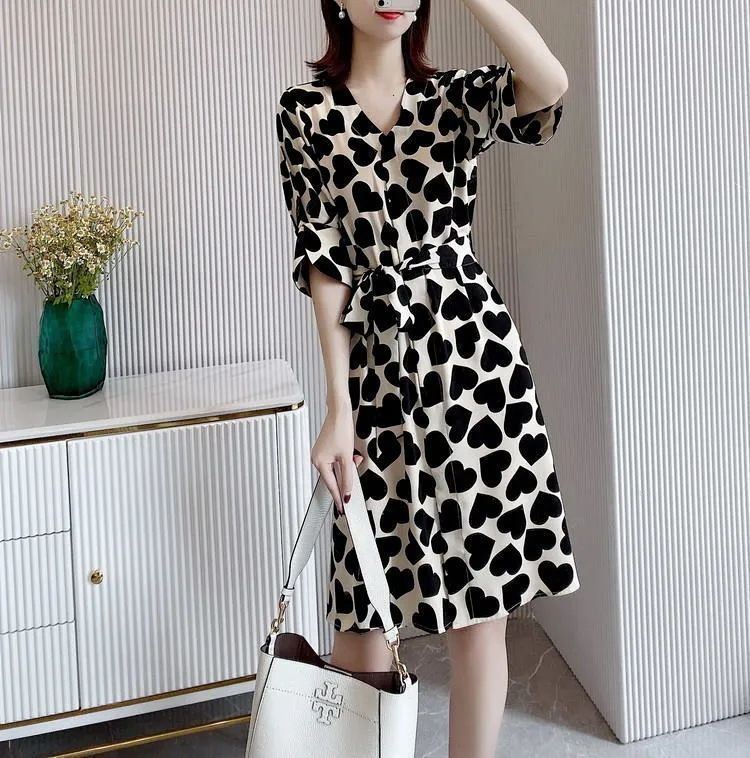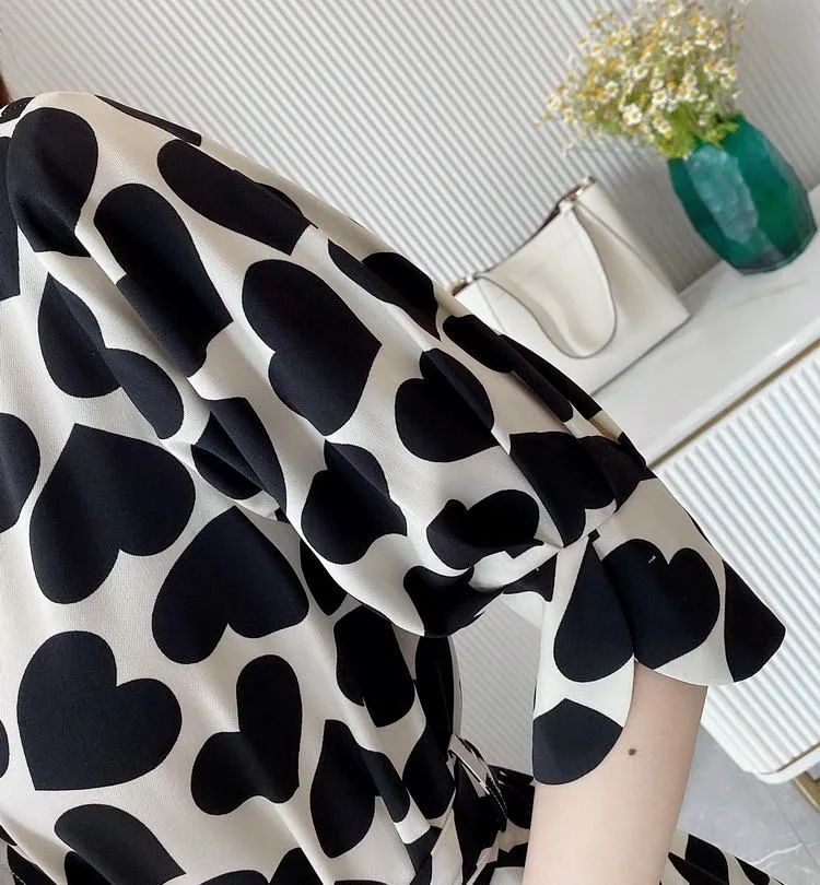 하트 프린트 쉬폰 원피스 여성 여름 신상 브이넥 퍼프 소매 우아한 레이스업 2024 인기 스커트스토어 가기