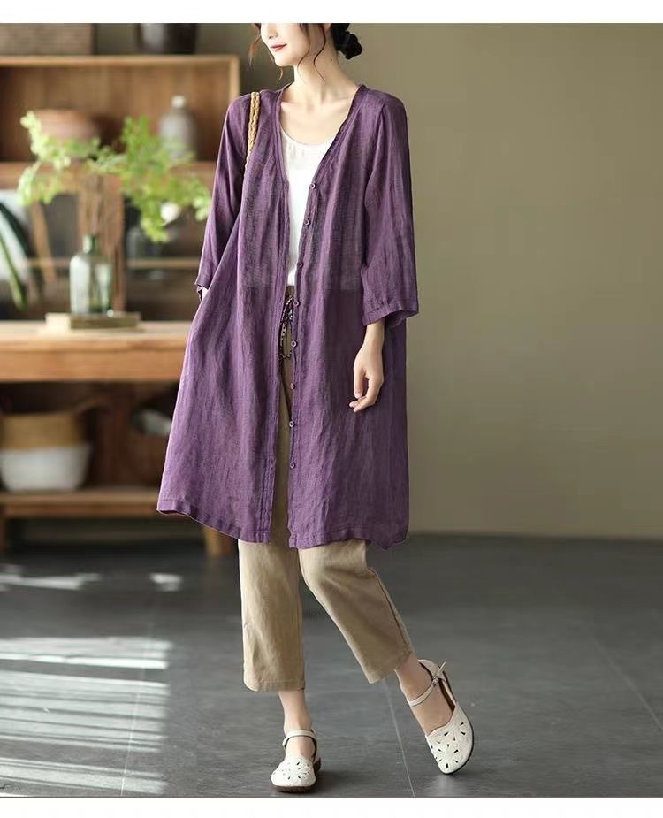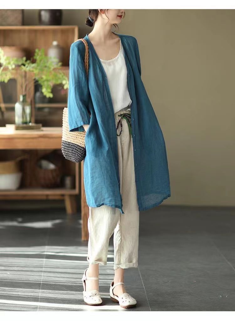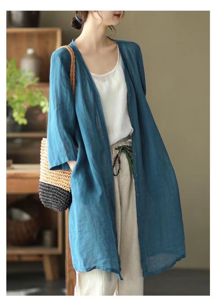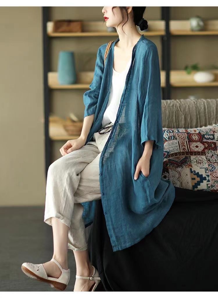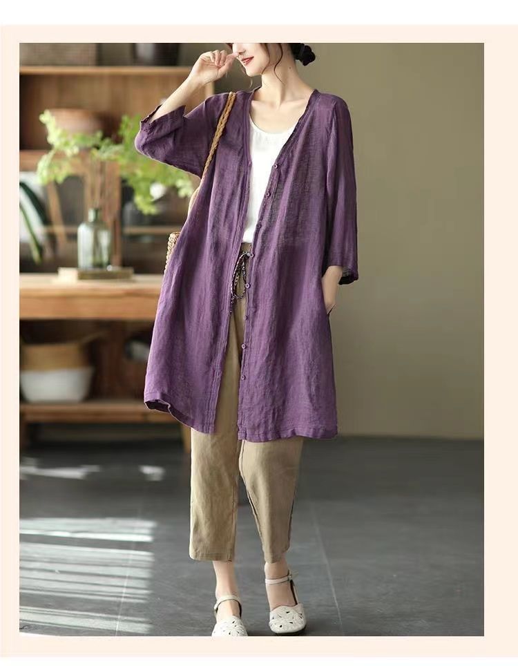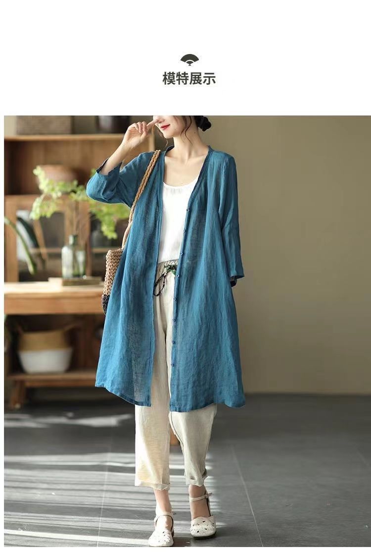 2025 여름 가을 신상 레트로 코튼 린넨 중간 길이 가디건 여성용 루즈핏 예술적 대형 사이즈 캐주얼 에어컨 셔츠 아우터스토어 가기