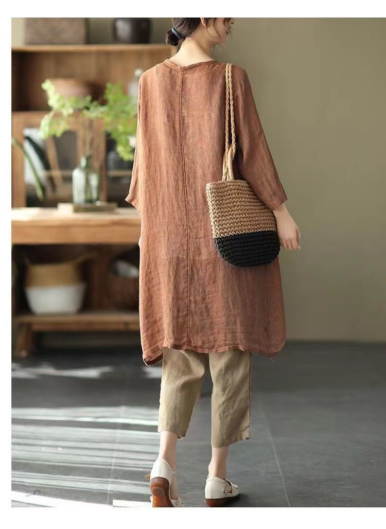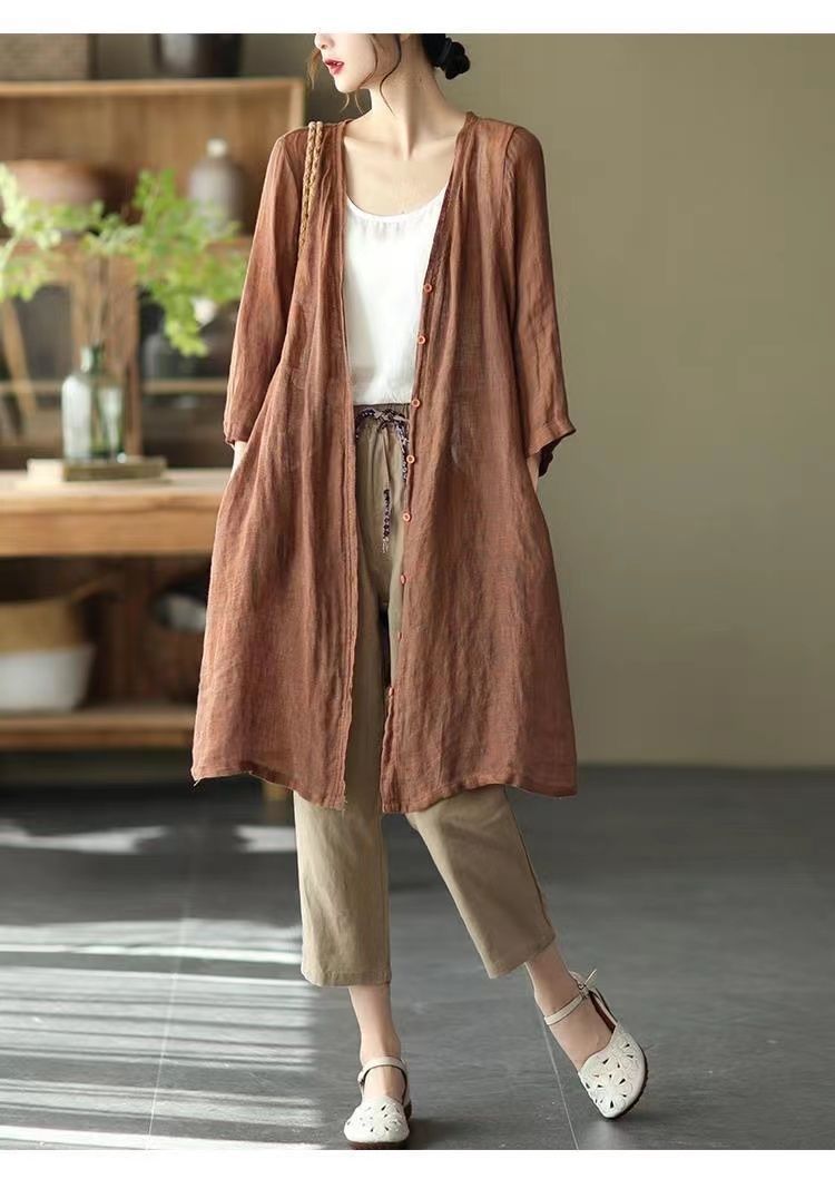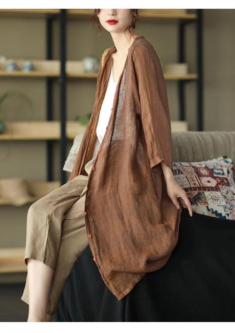 2025 여름 가을 신상 레트로 코튼 린넨 중간 길이 가디건 여성용 루즈핏 예술적 대형 사이즈 캐주얼 에어컨 셔츠 아우터
