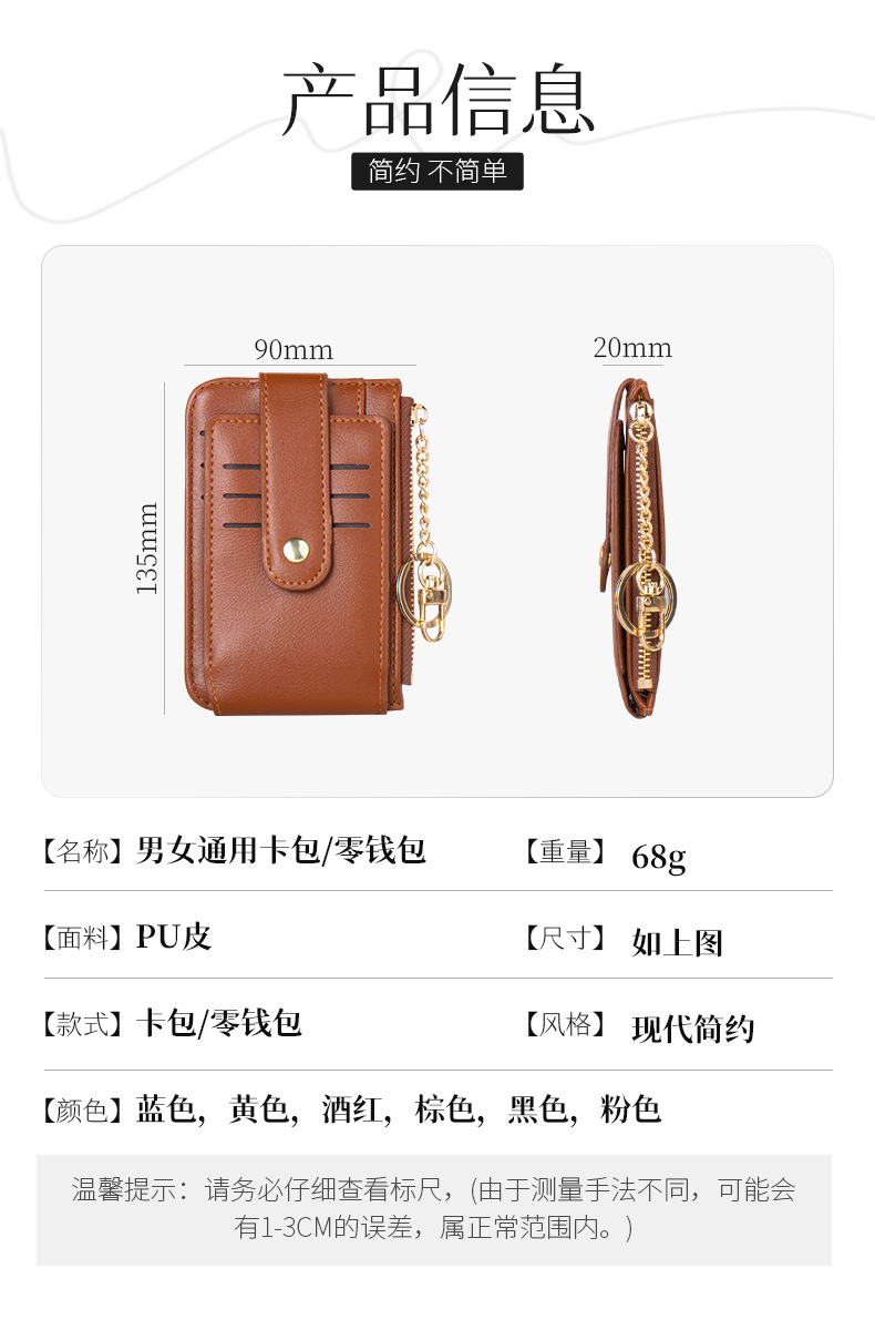 고급스러운 심플한 단색 학생용 다중 카드 슬롯 지퍼 카드 지갑 동전 지갑 여성용 짧은 지갑