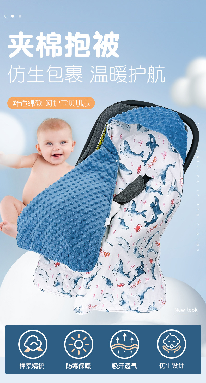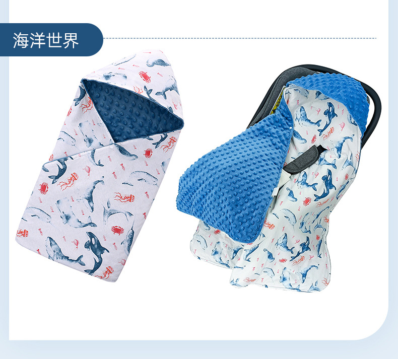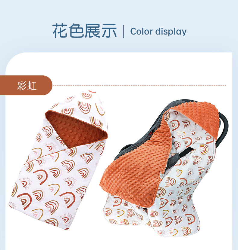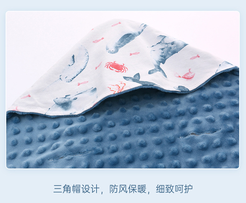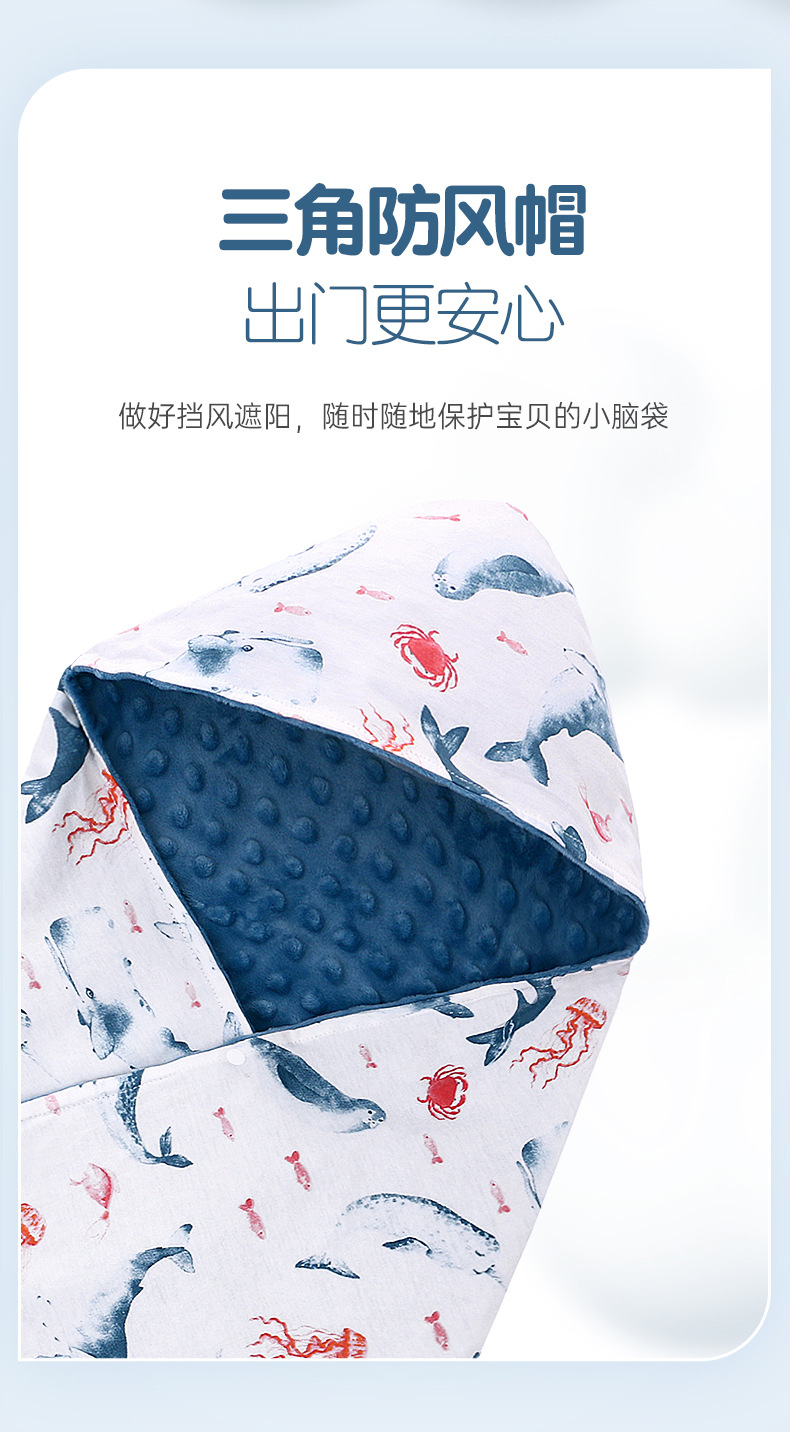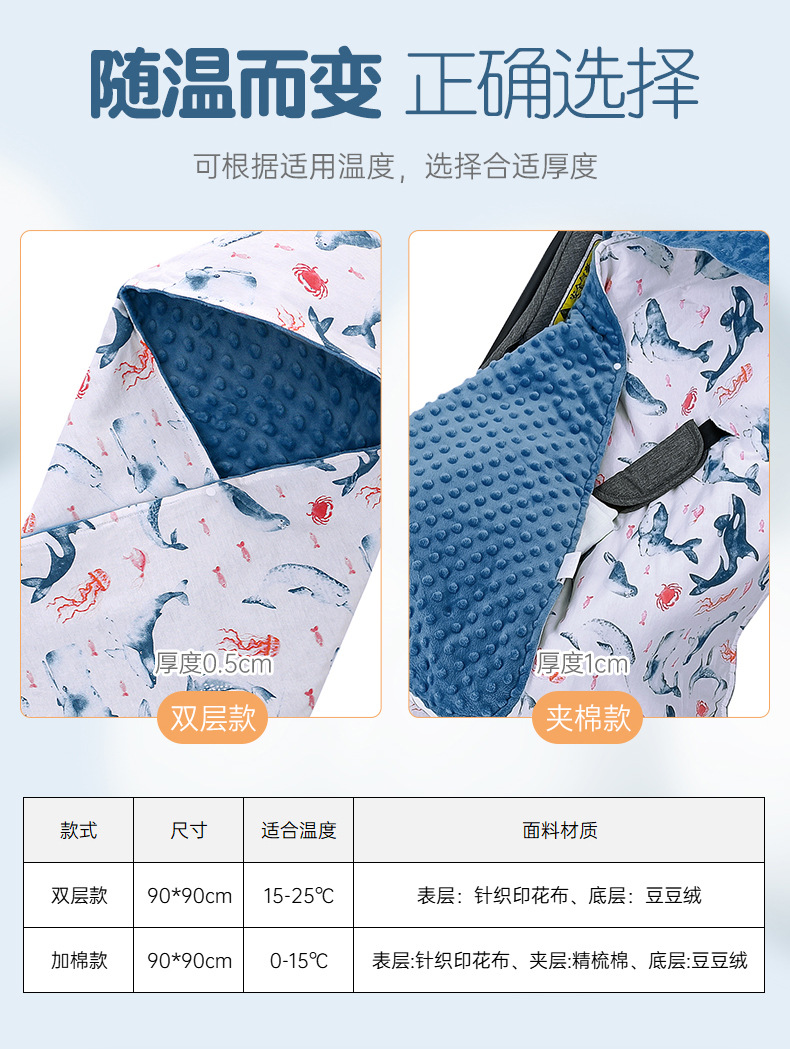正反面都可以使用都一款婴儿包被,三角帽设计,室内室外均可使用,特色:有锁孔设计,在婴儿车或者安全座椅都可以固定,有双层以及夹棉2种款式均可挑选,非常柔软舒适