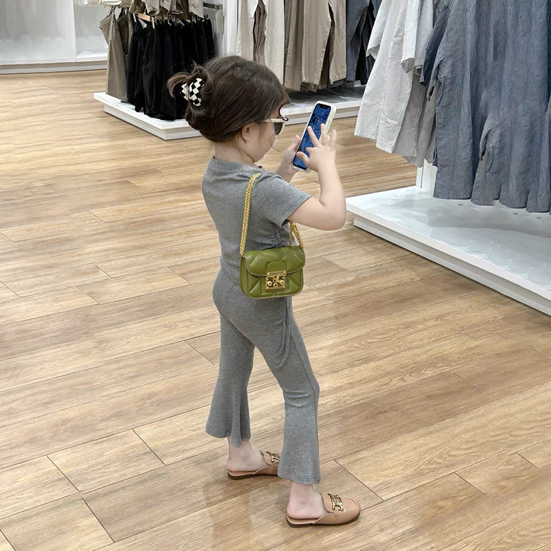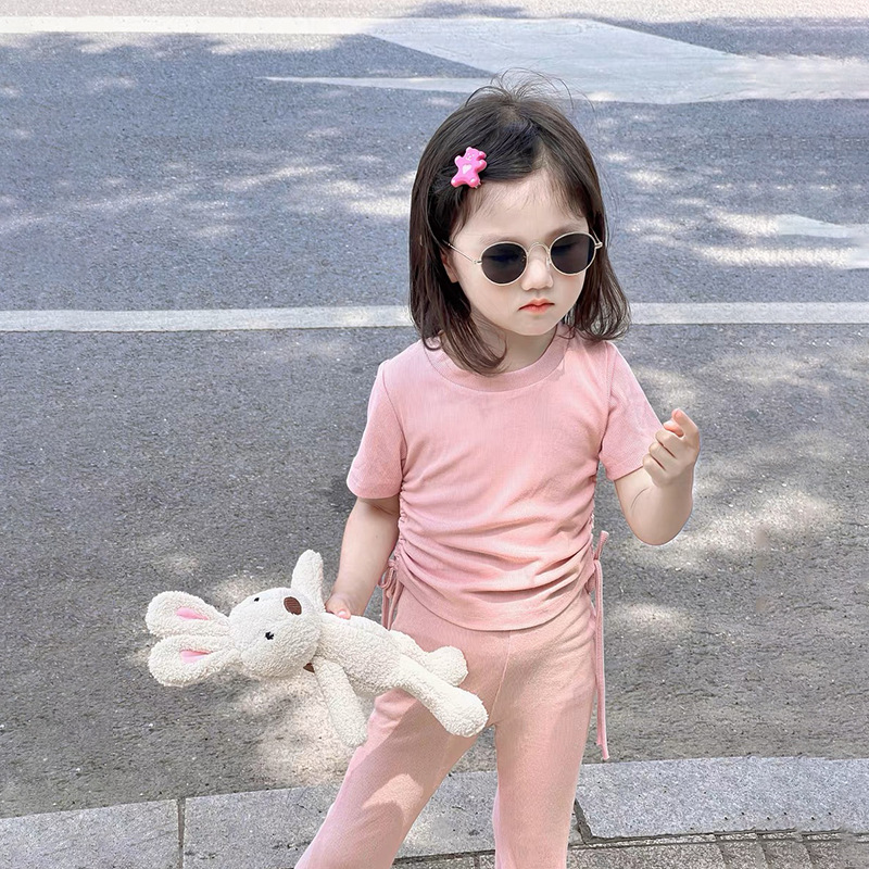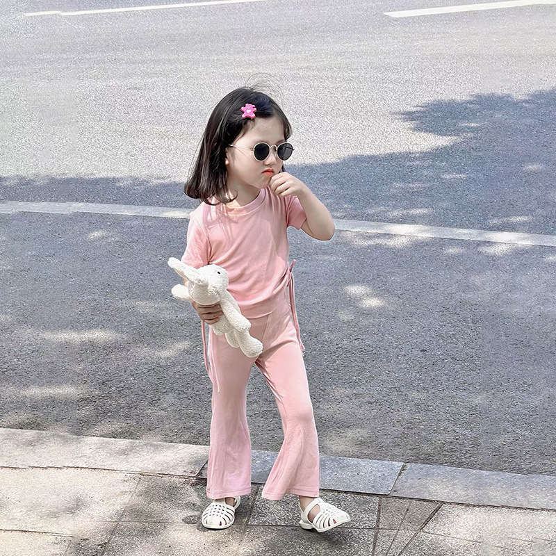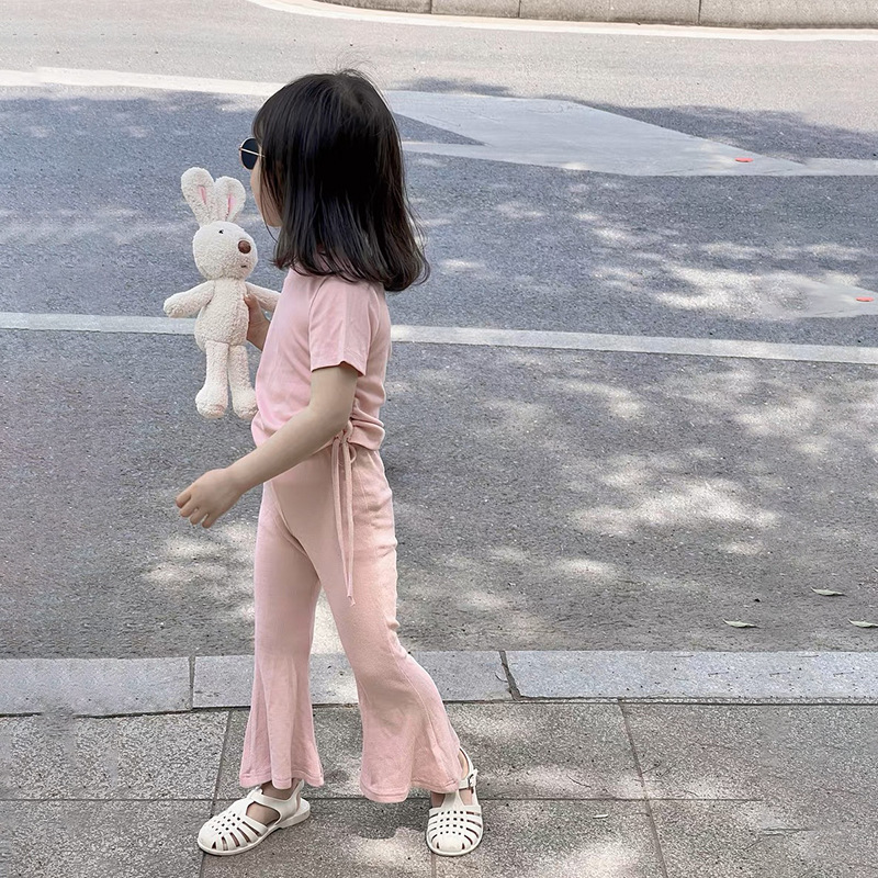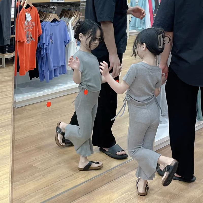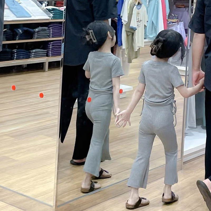 아동 의류 2023 여름 새로운 소녀 패션 단색 짧은 소매 라운드 넥 탑 캐주얼 플레어 팬츠 세트 패션스토어 가기