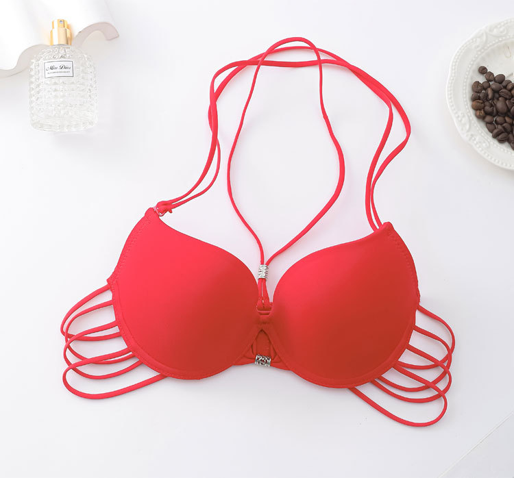 공장 재고 작은 가슴 두꺼운 푸시 업 브라 광택 추적없는 목 벨트 성적인 아름다움 백리스 속옷 패션 소녀