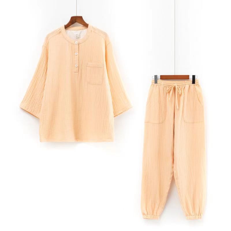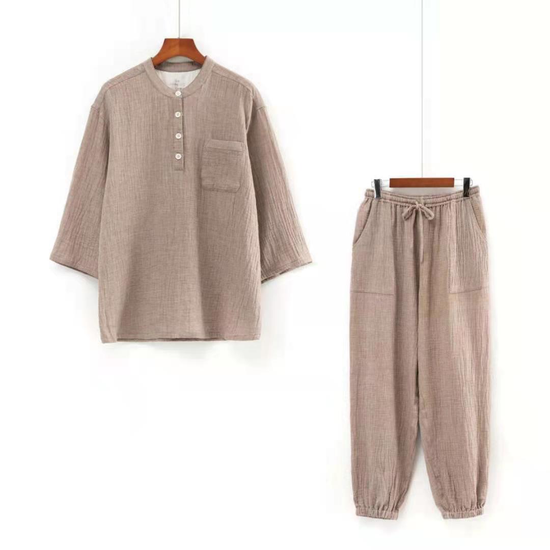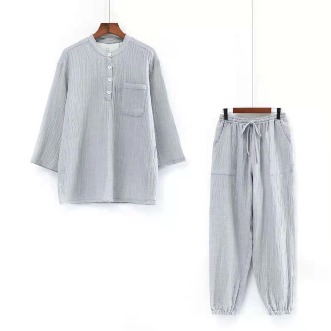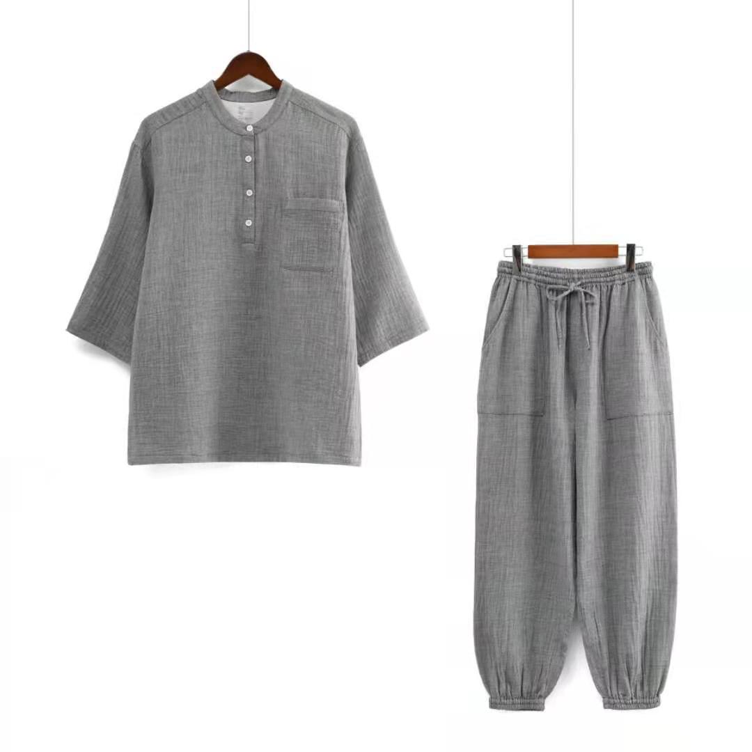 남성과 여성을위한 자른 소매 잠옷 더블 크레이프 통 바지 유행 캐주얼 느슨한 세트 아웃웨어