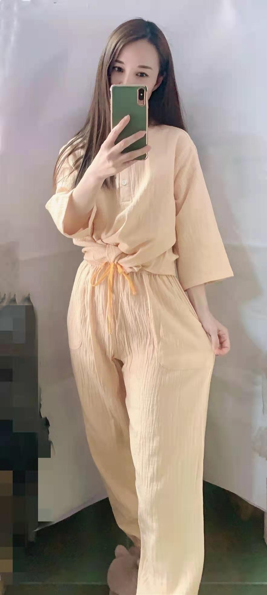 남성과 여성을위한 자른 소매 잠옷 더블 크레이프 통 바지 유행 캐주얼 느슨한 세트 아웃웨어스토어 가기