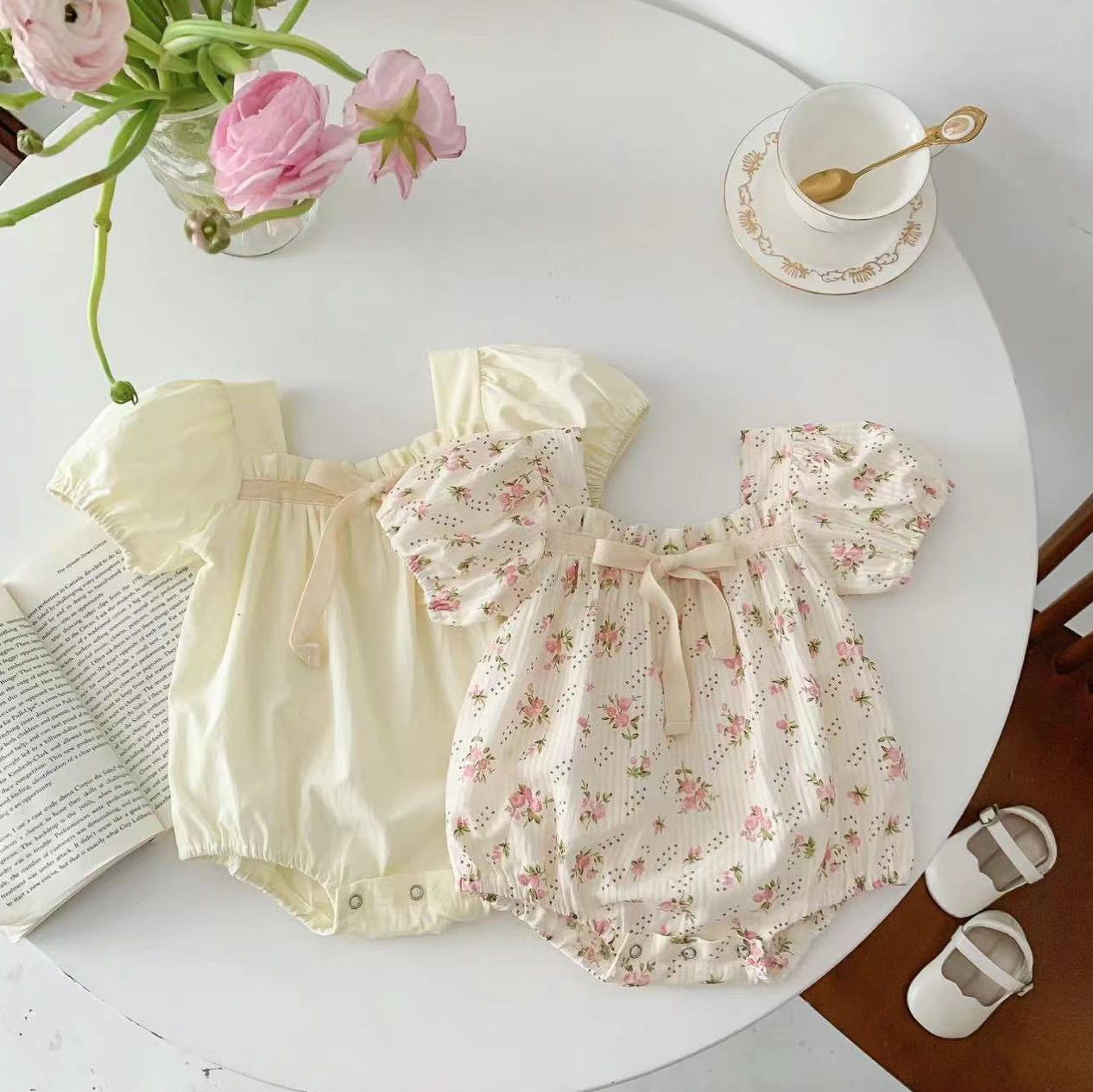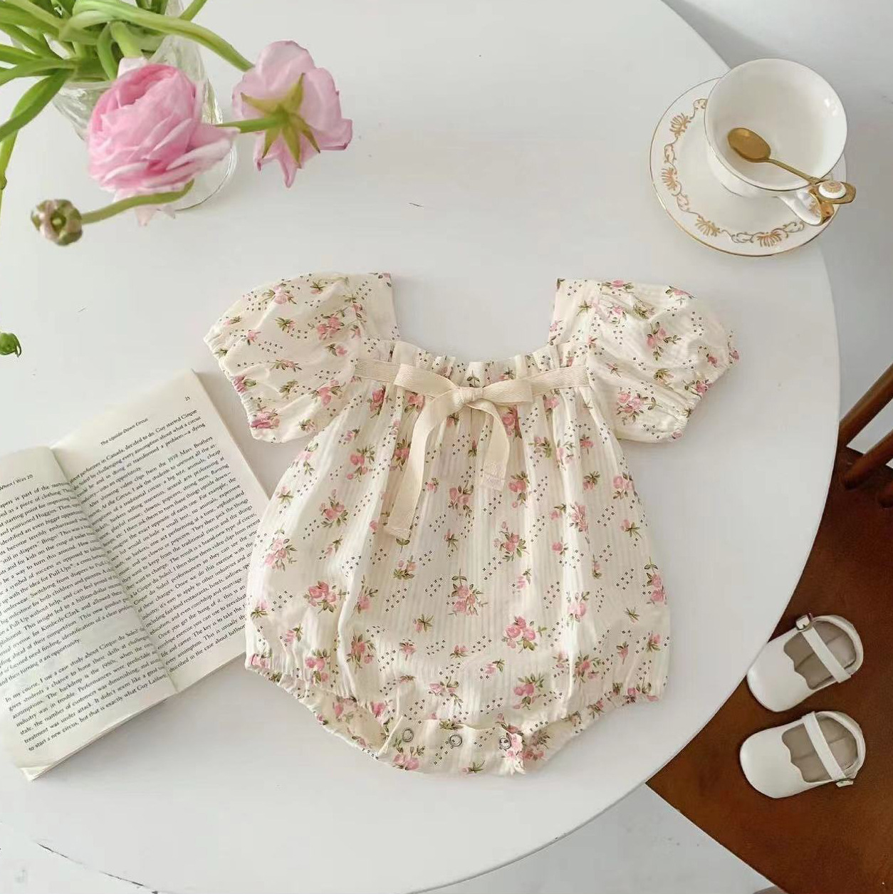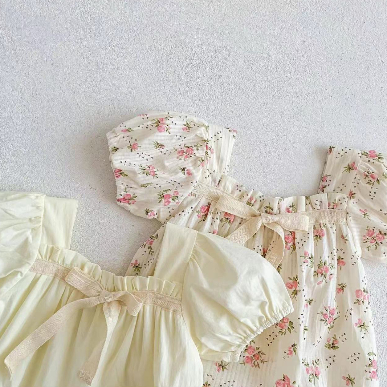 2023 여름 아기 어린이 원피스 세트 작은 꽃 활 아기 소녀 버블 슬리브 Hayak 가방 뚱뚱한 옷 등산 세트스토어 가기