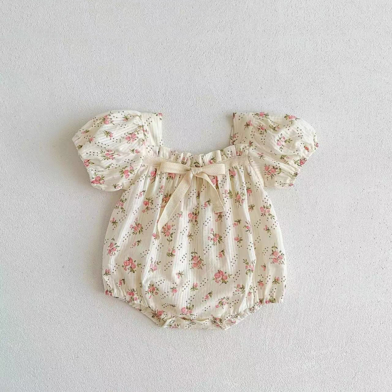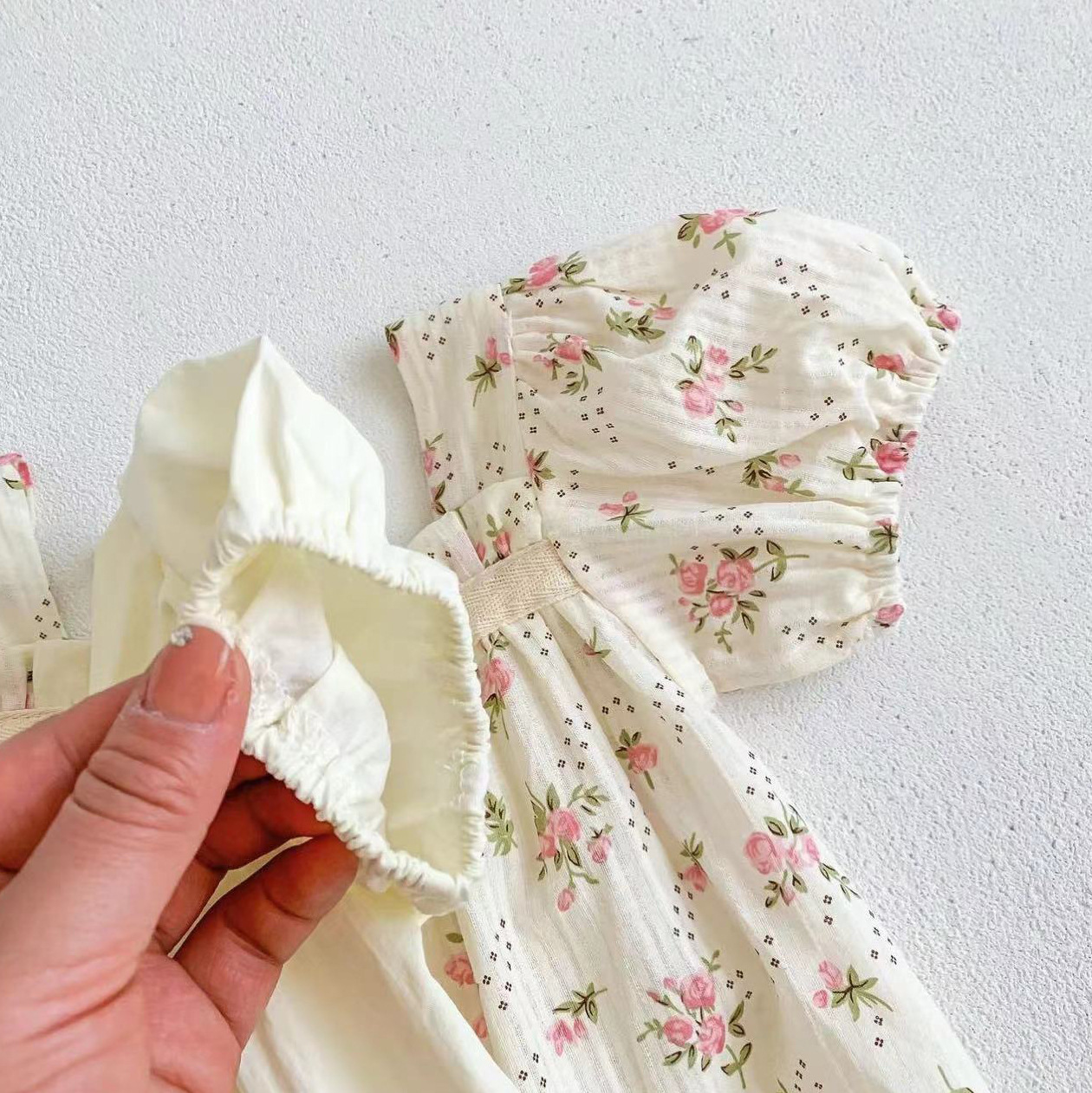 2023 여름 아기 어린이 원피스 세트 작은 꽃 활 아기 소녀 버블 슬리브 Hayak 가방 뚱뚱한 옷 등산 세트