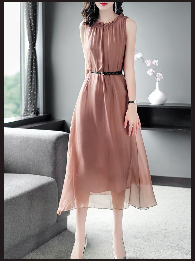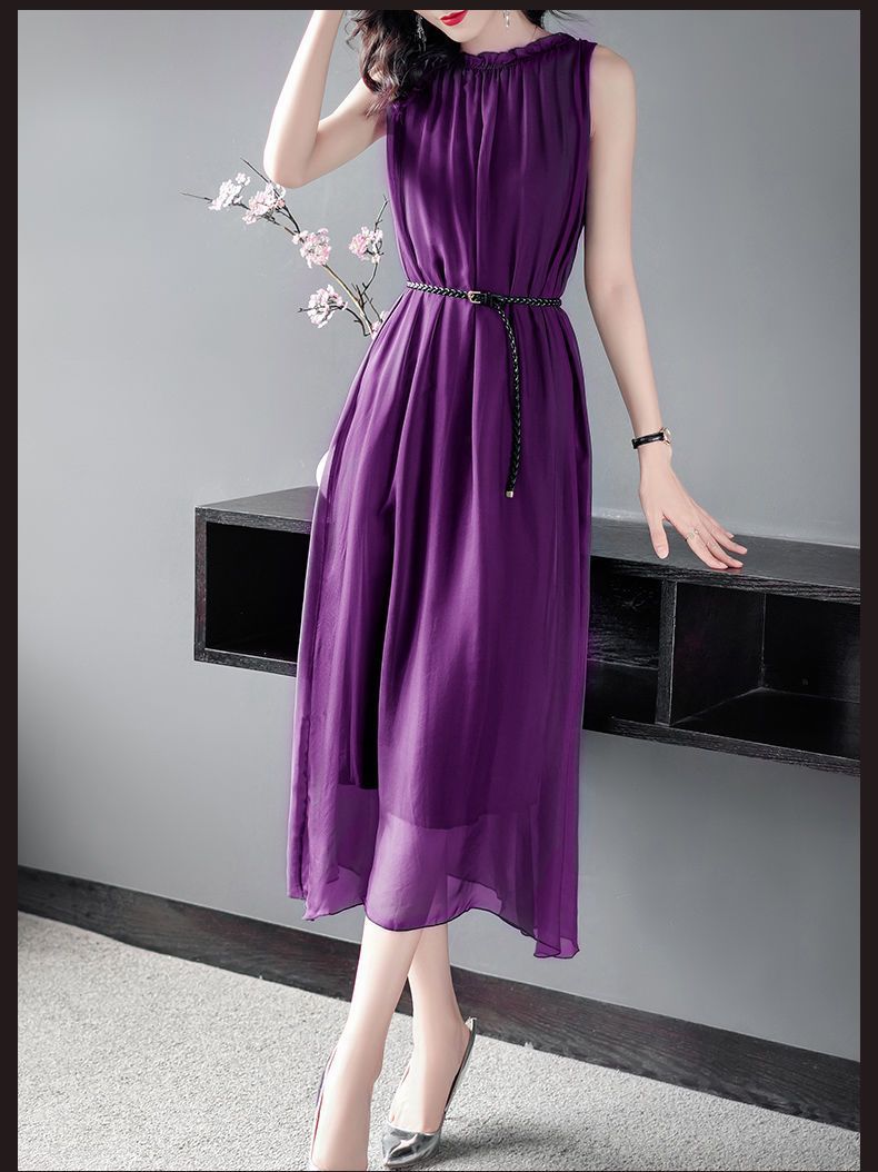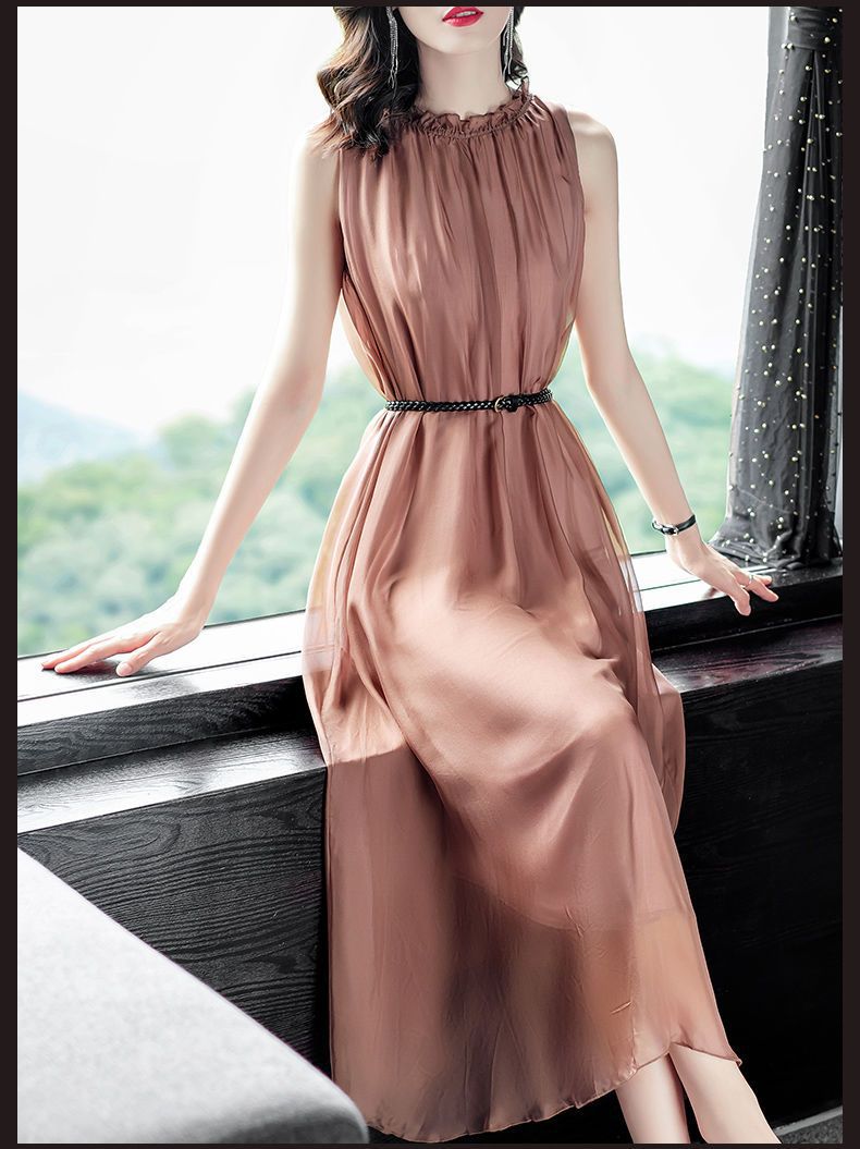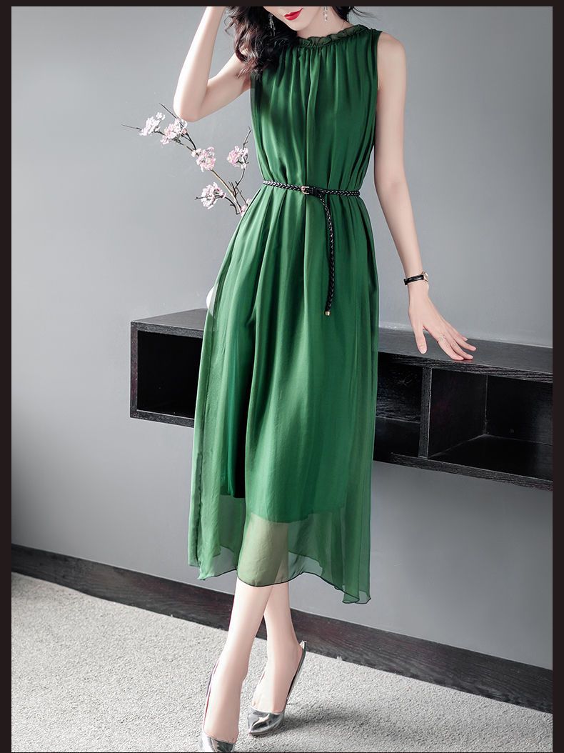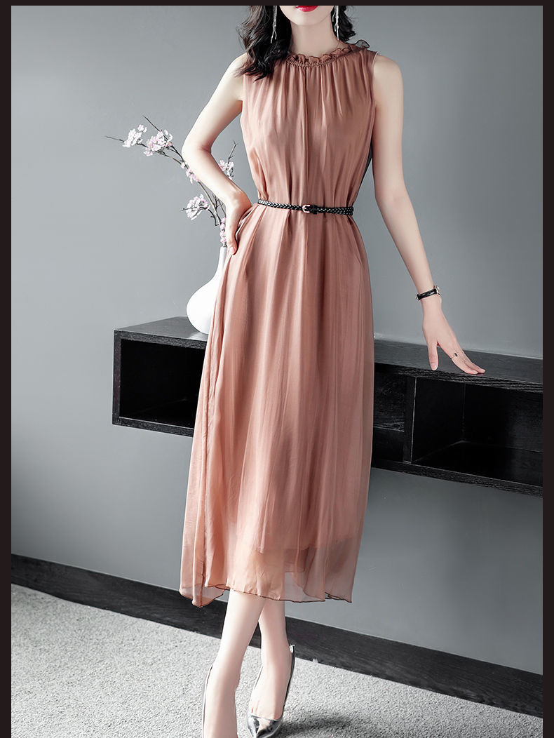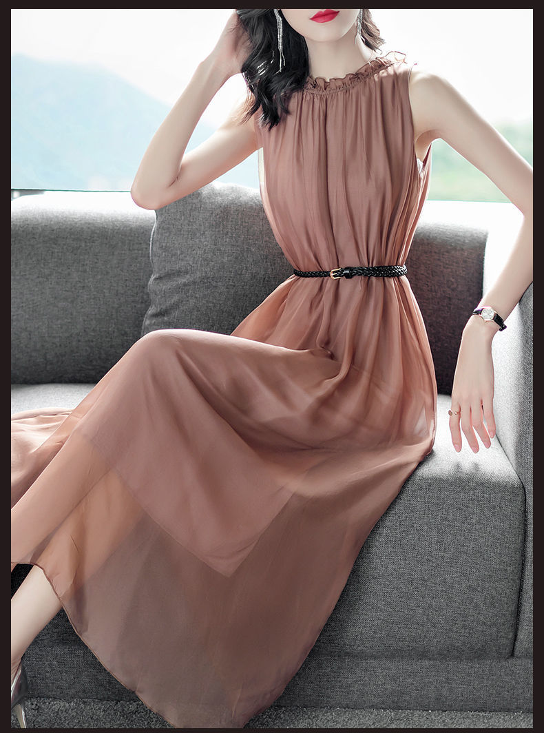단색 쉬폰 원피스 여성 2024 여름 신상 허리라인 강조 우아한 슬림핏 중간 길이 민소매 원피스 트렌디
