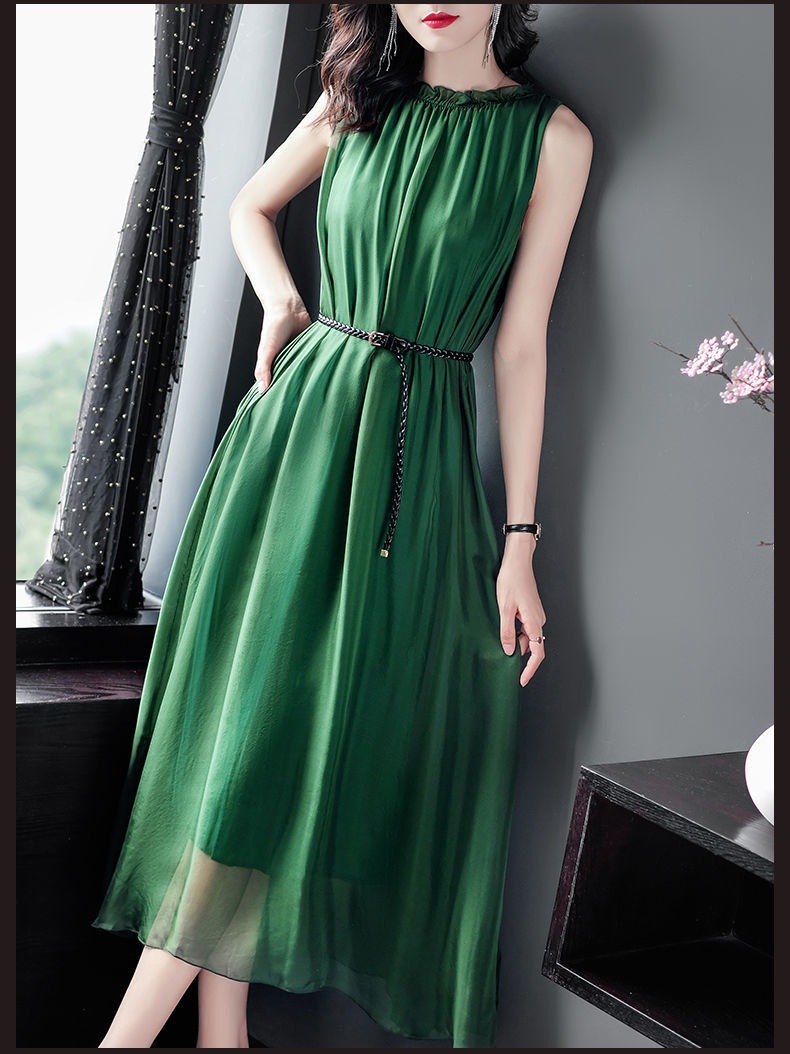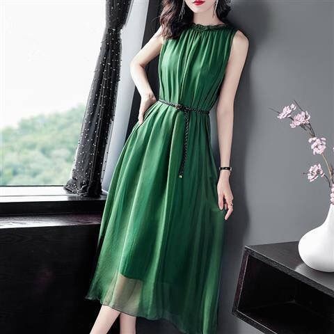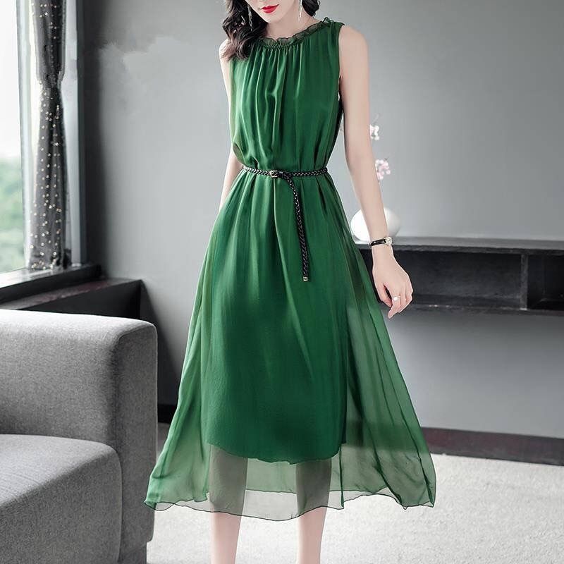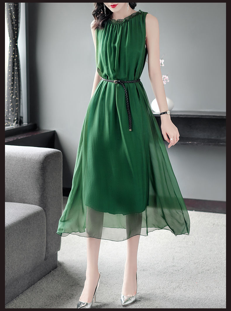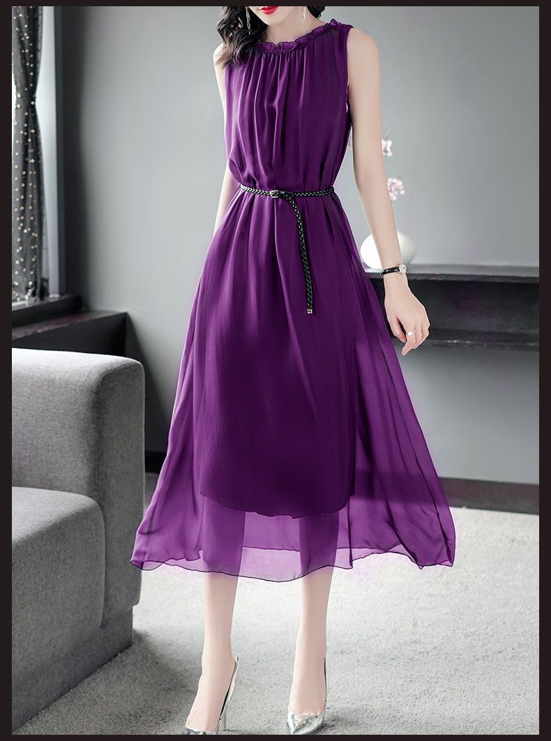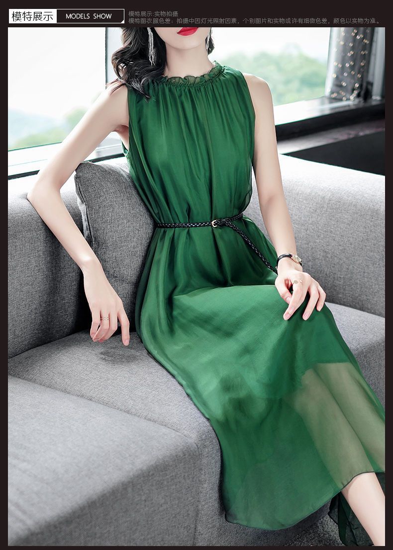 단색 쉬폰 원피스 여성 2024 여름 신상 허리라인 강조 우아한 슬림핏 중간 길이 민소매 원피스 트렌디