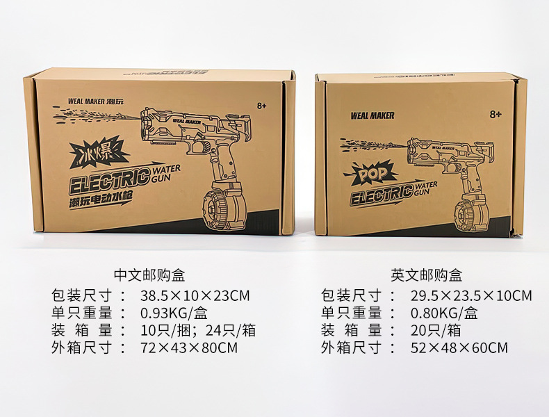 本产品具备相关认证(3C/质检报告/EN71/ASTM/CE/CPC/CPSIA/10P等证书),冰爆水枪中英文包装尺寸不同: