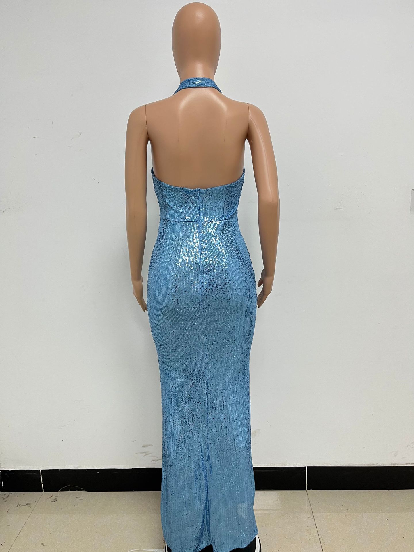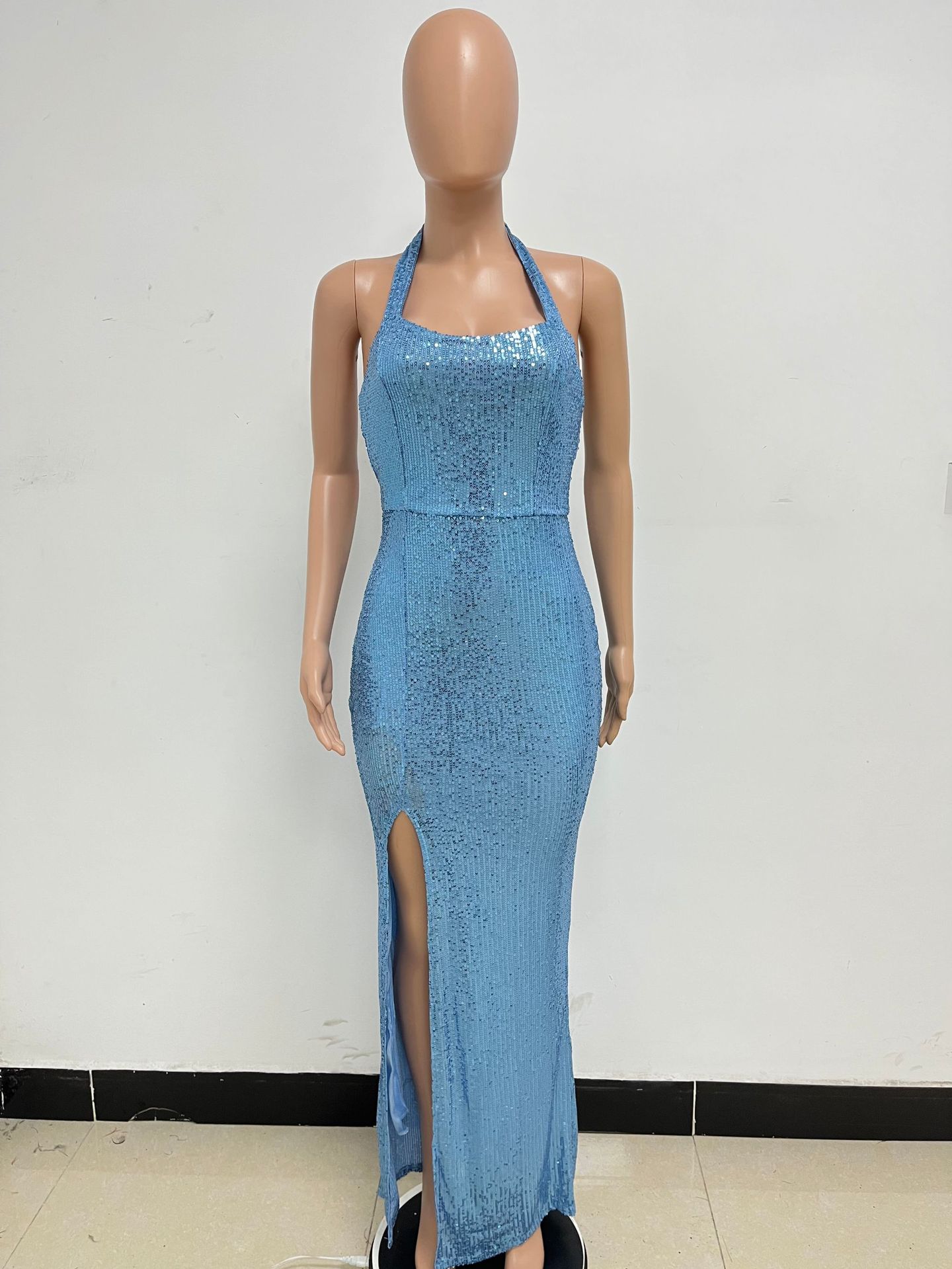 유럽과 미국의 2025 새로운 여성 홀터넥 슬릿 드레스 봄과 가을 하이 엔드 크로스 보더 프렌치 스팽글 슬림 롱 스커트스토어 가기