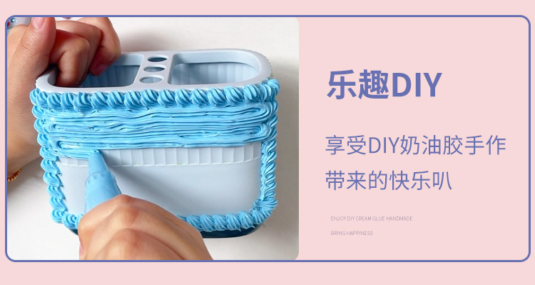 此款产品非成品需DIY手工制作,材料包内含一个收纳盒,12个配件,1小包马卡龙珠子,2支50ml奶油胶(一支白色胶和一支同款色系胶),2个随机裱花嘴