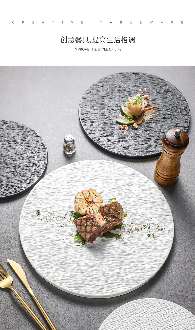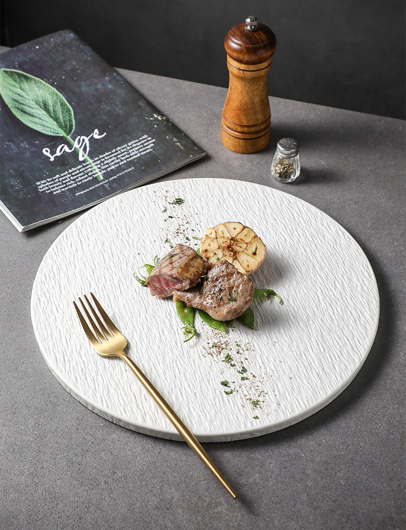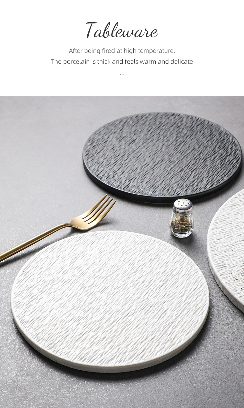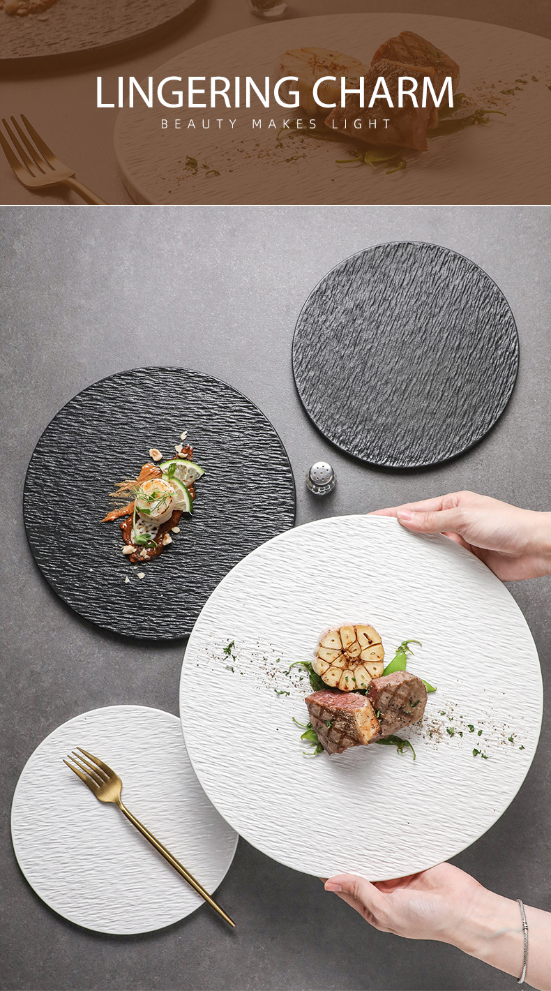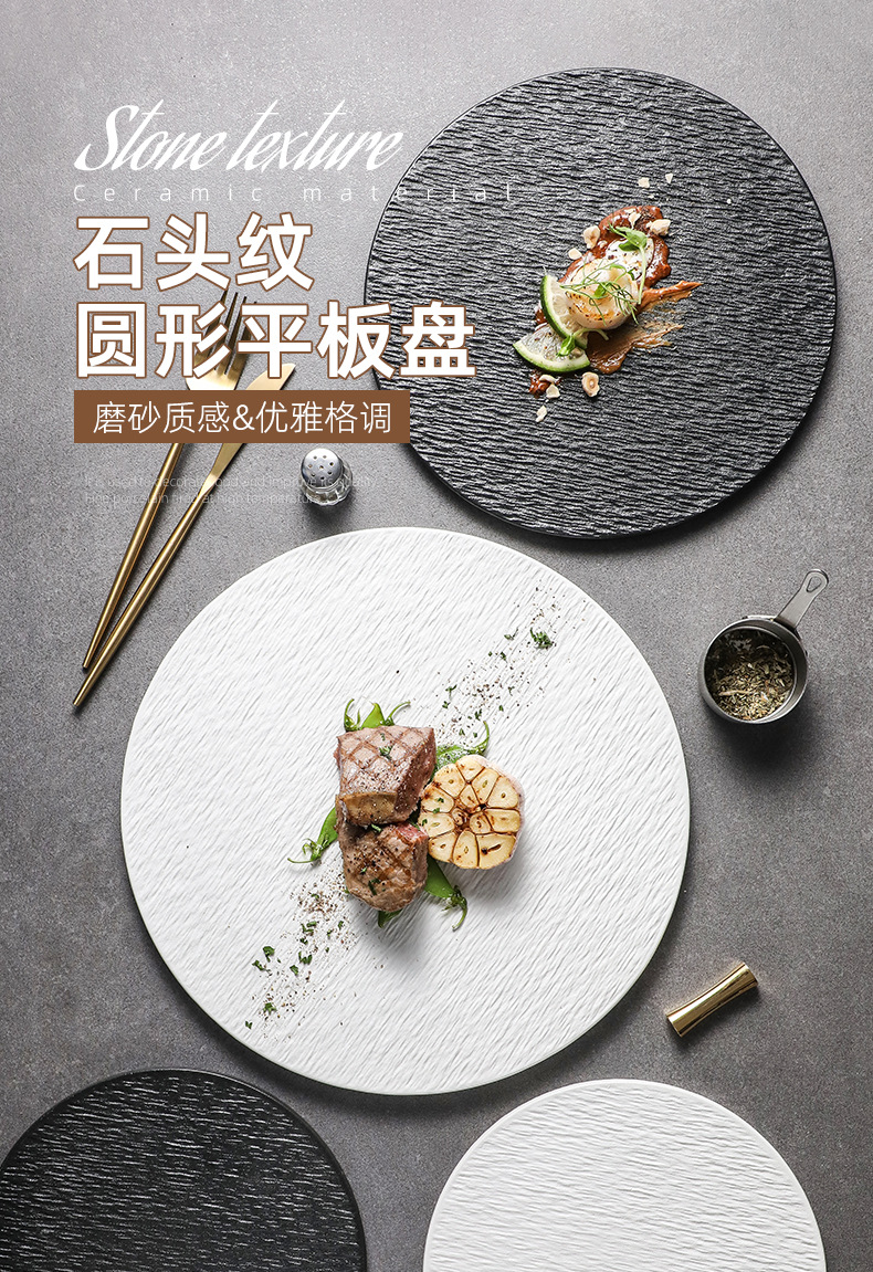 솔리드 컬러 록 패턴 세라믹 웨스턴 푸드 플레이트 플랫 플레이트 라운드 케이크 플레이트 스테이크 플레이트 일본 레스토랑 플레이트