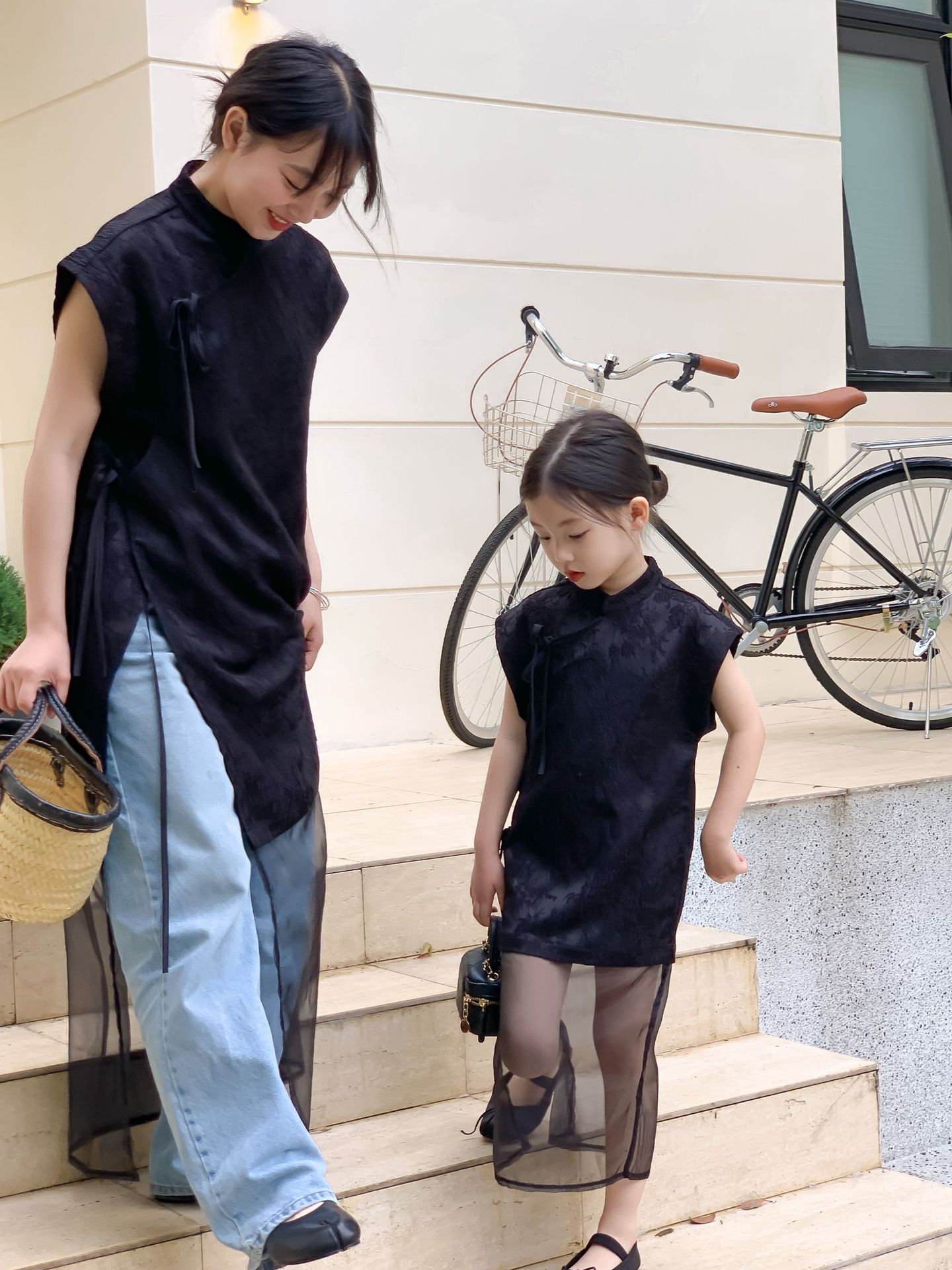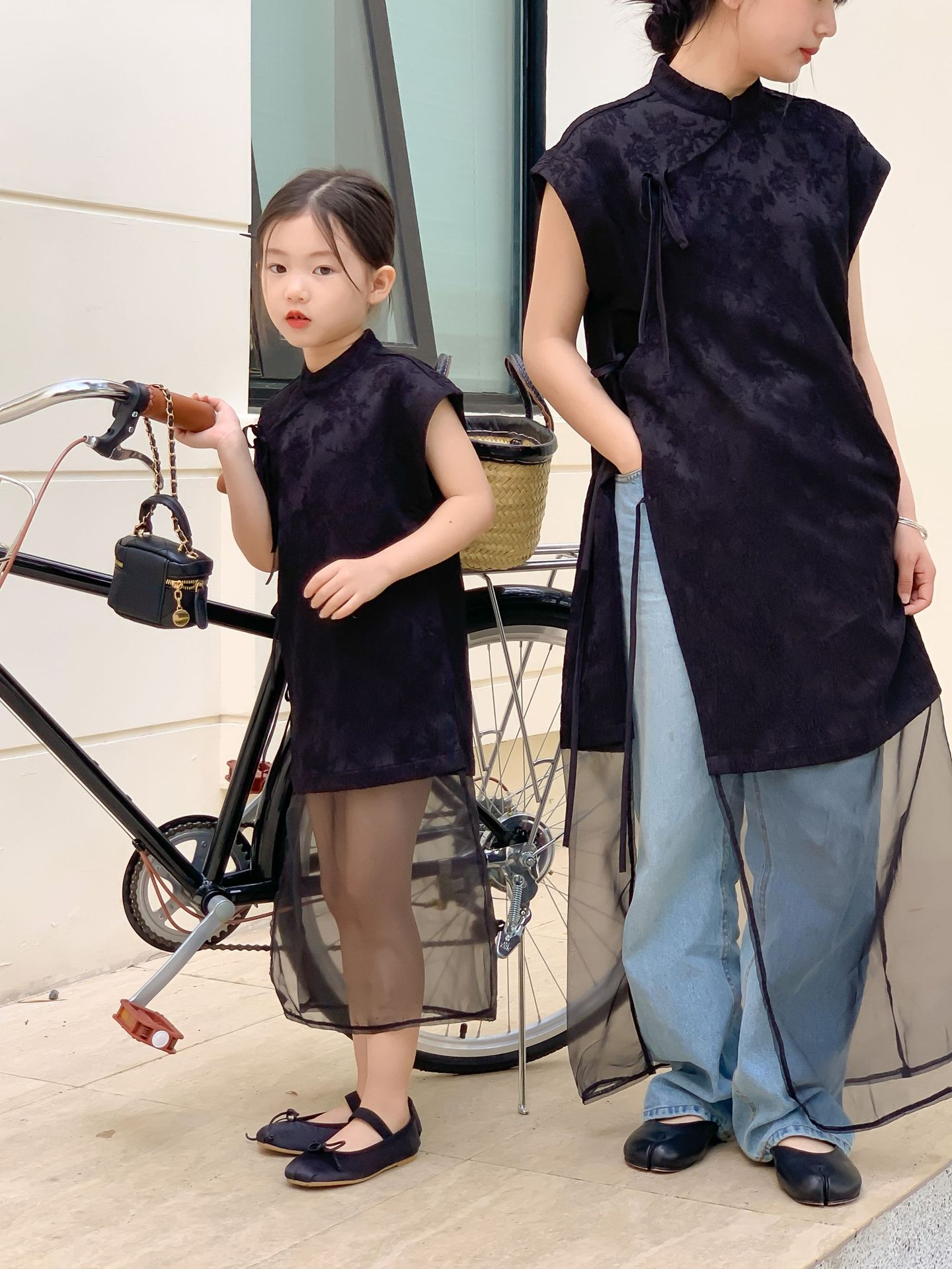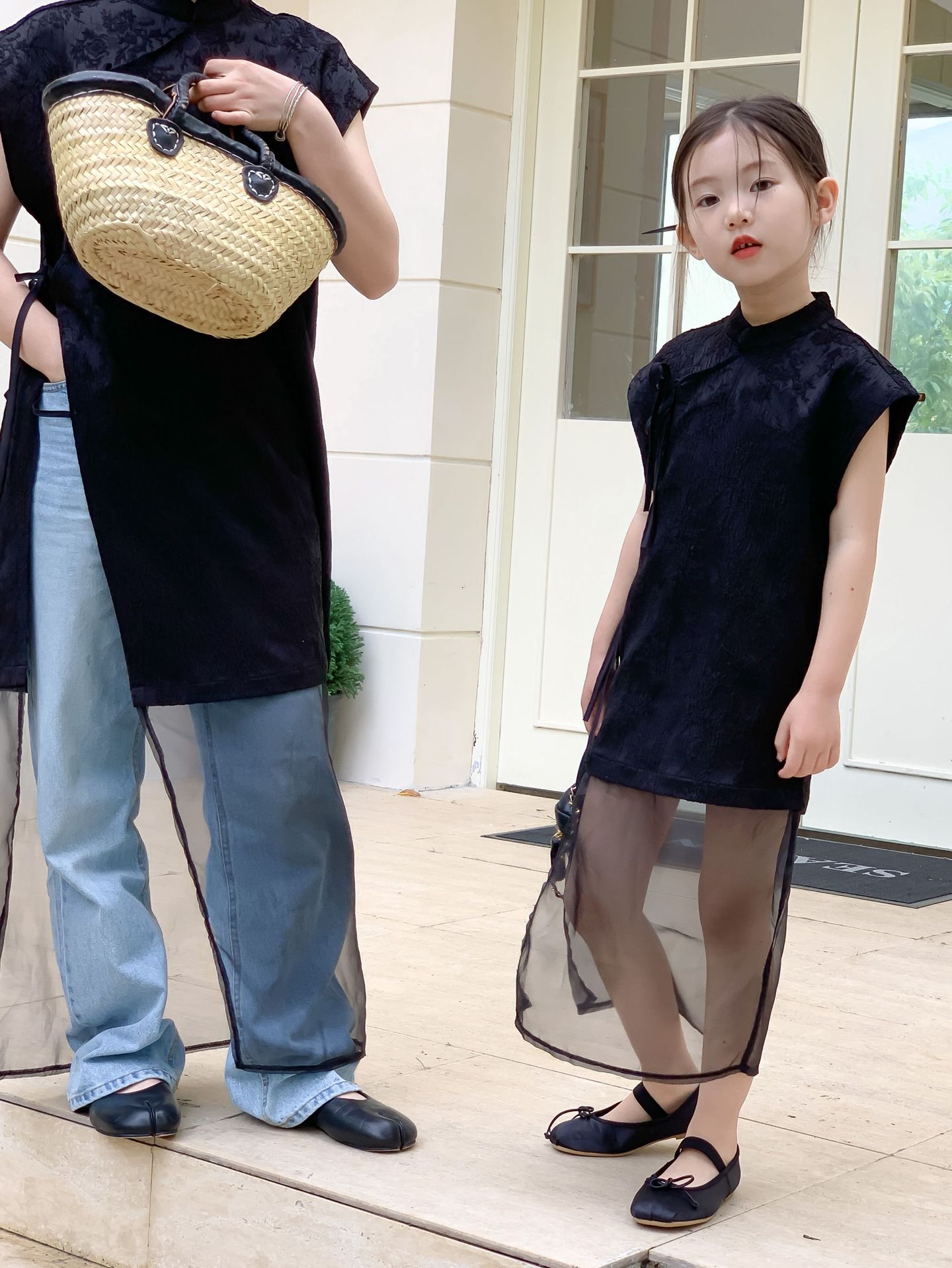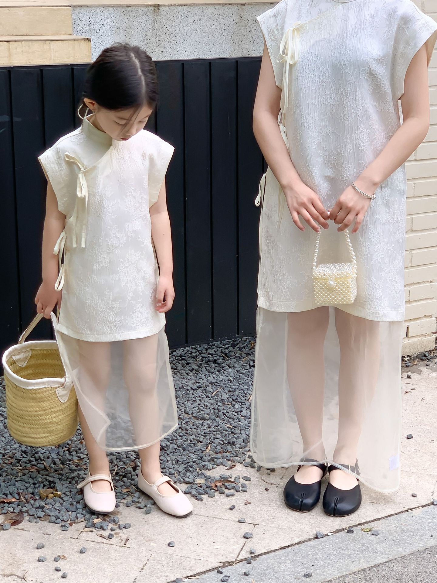 한국식 부모-자식 원피스 2023 여름 새로운 어린이 중국식 치파오 원피스 패션 거즈 메쉬 바느질 원피스