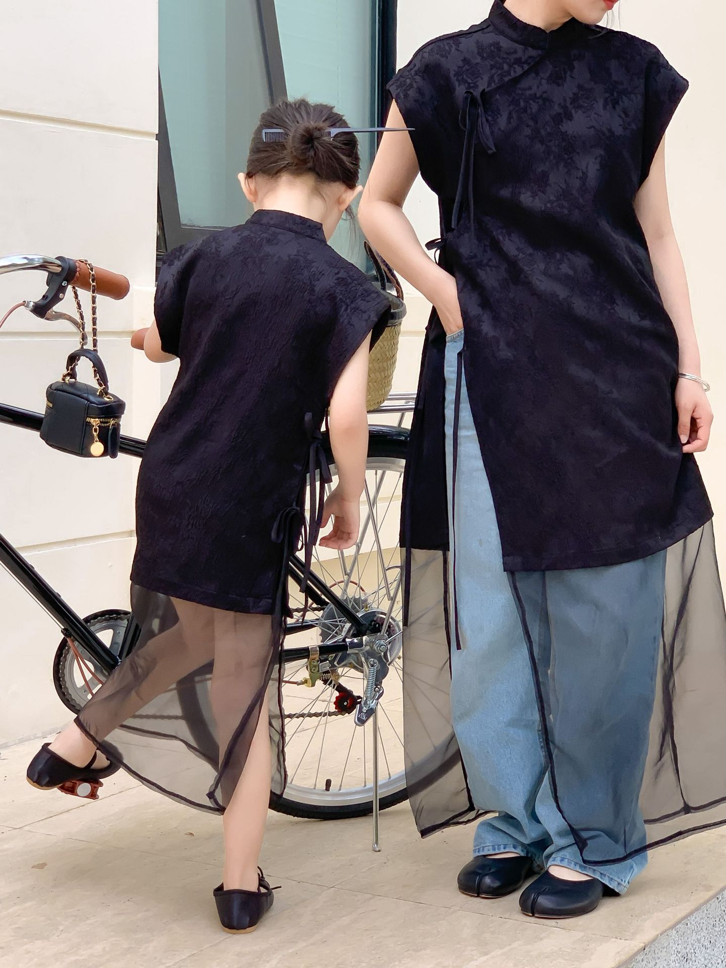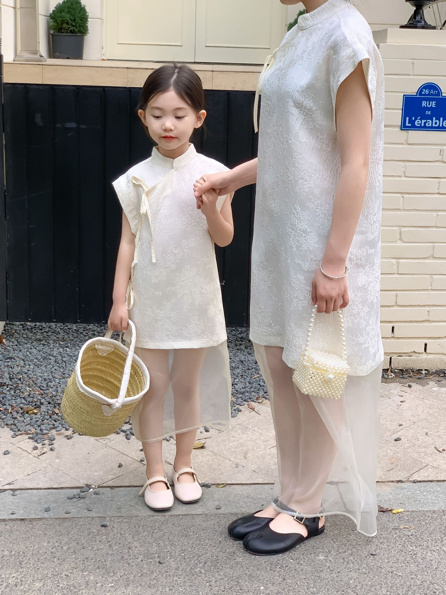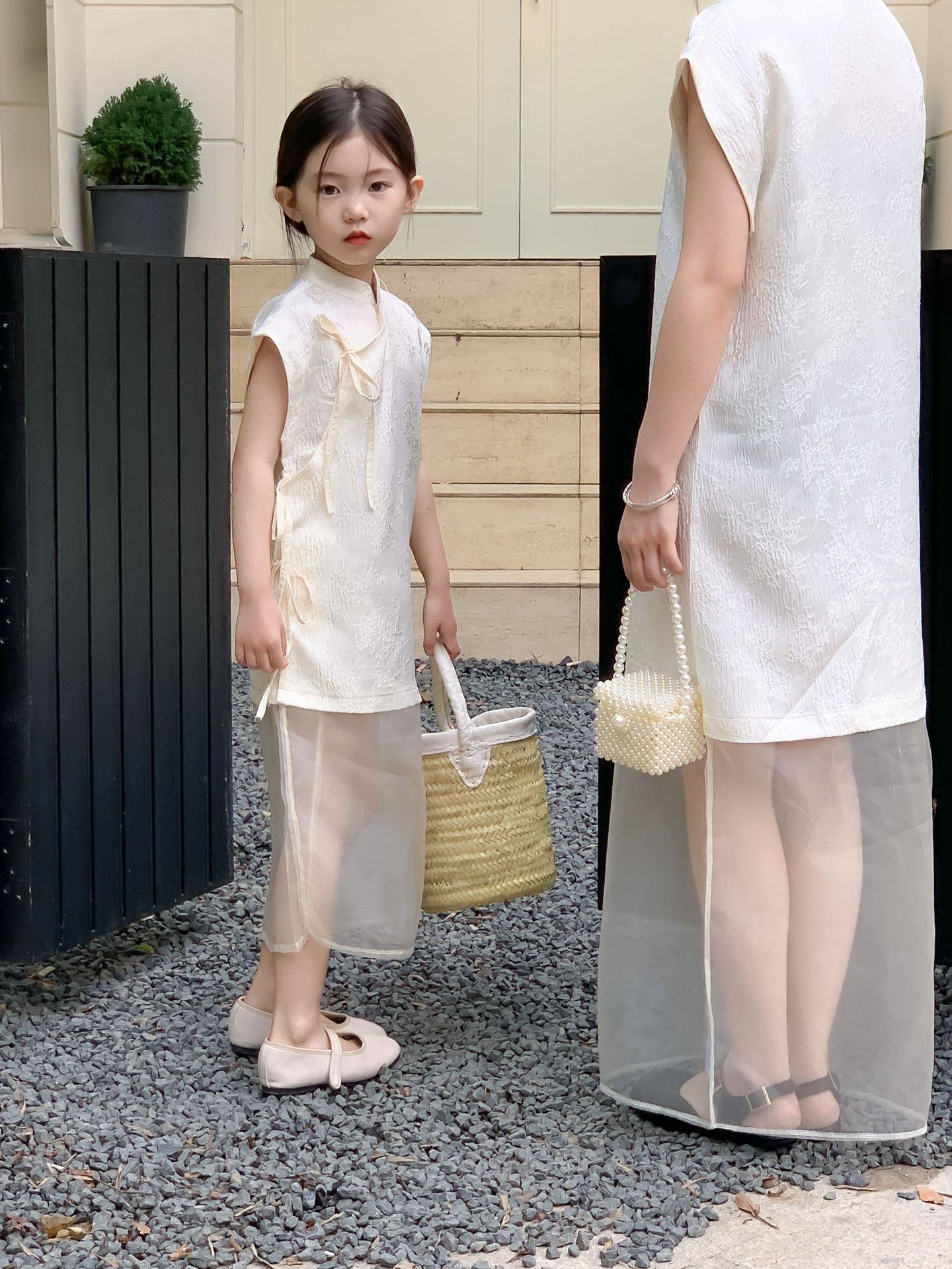 한국식 부모-자식 원피스 2023 여름 새로운 어린이 중국식 치파오 원피스 패션 거즈 메쉬 바느질 원피스