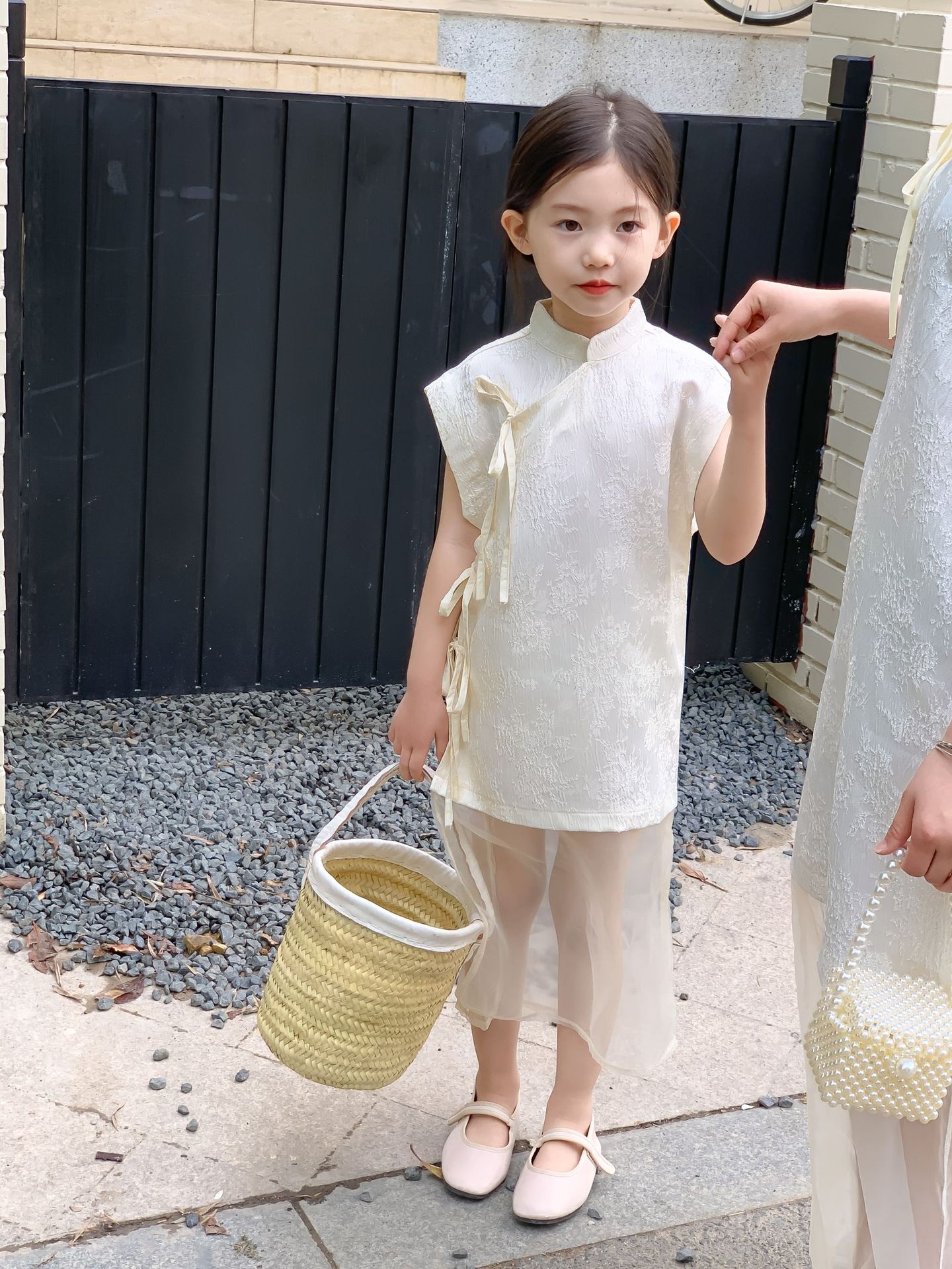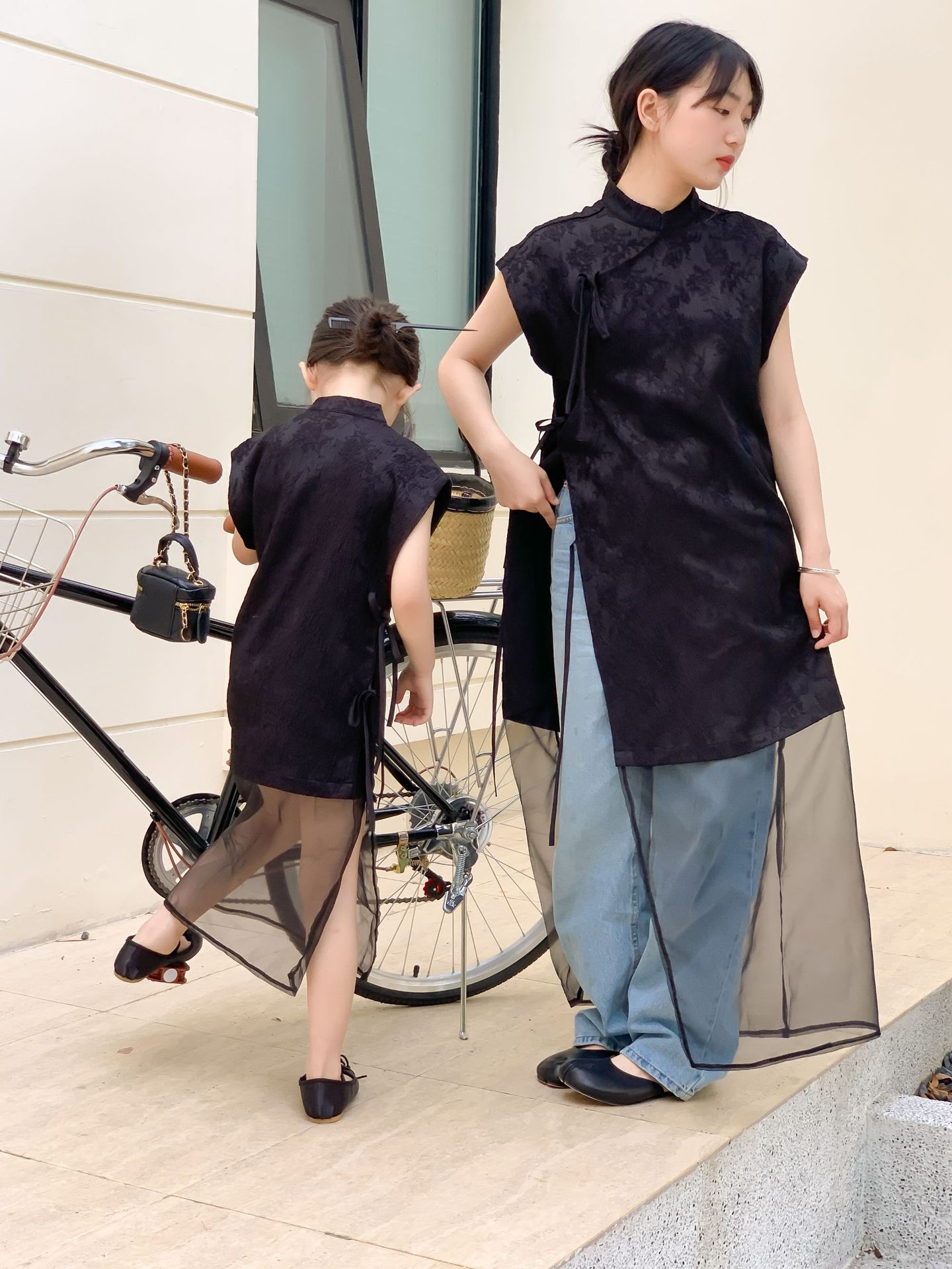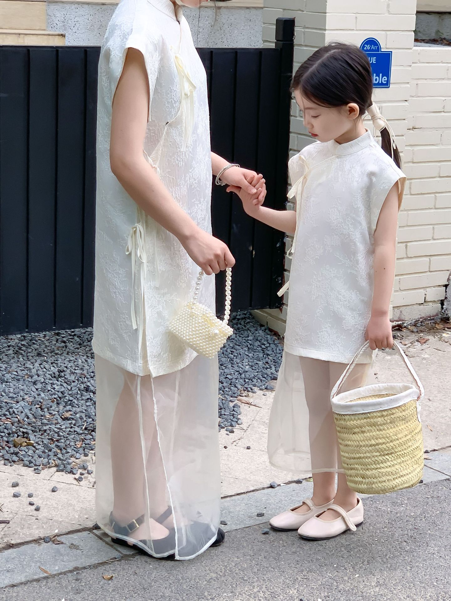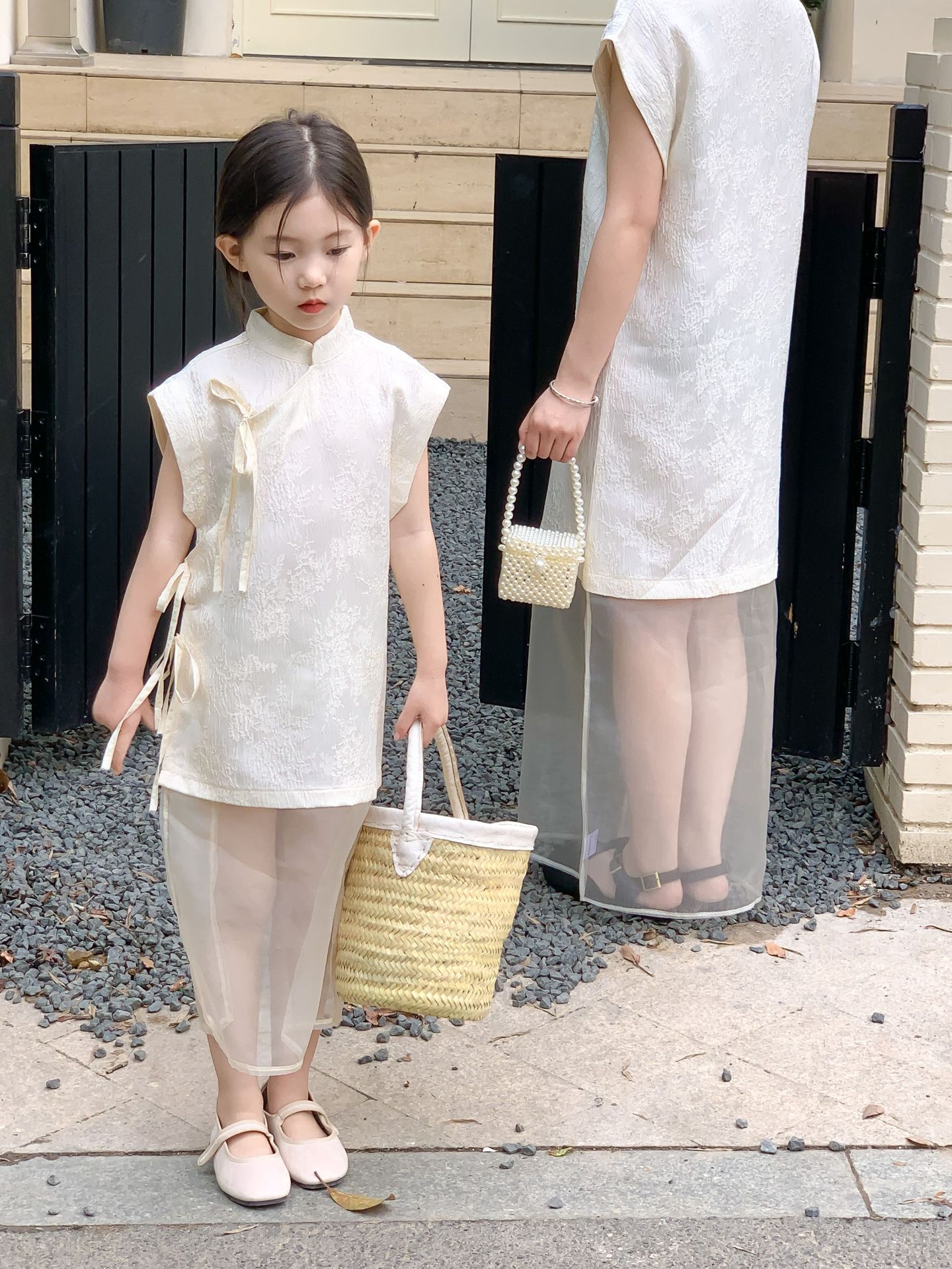 한국식 부모-자식 원피스 2023 여름 새로운 어린이 중국식 치파오 원피스 패션 거즈 메쉬 바느질 원피스