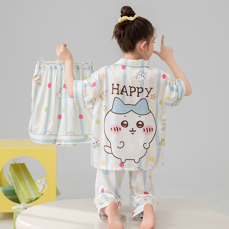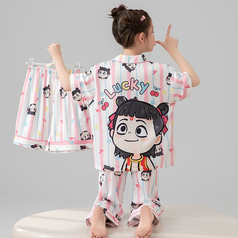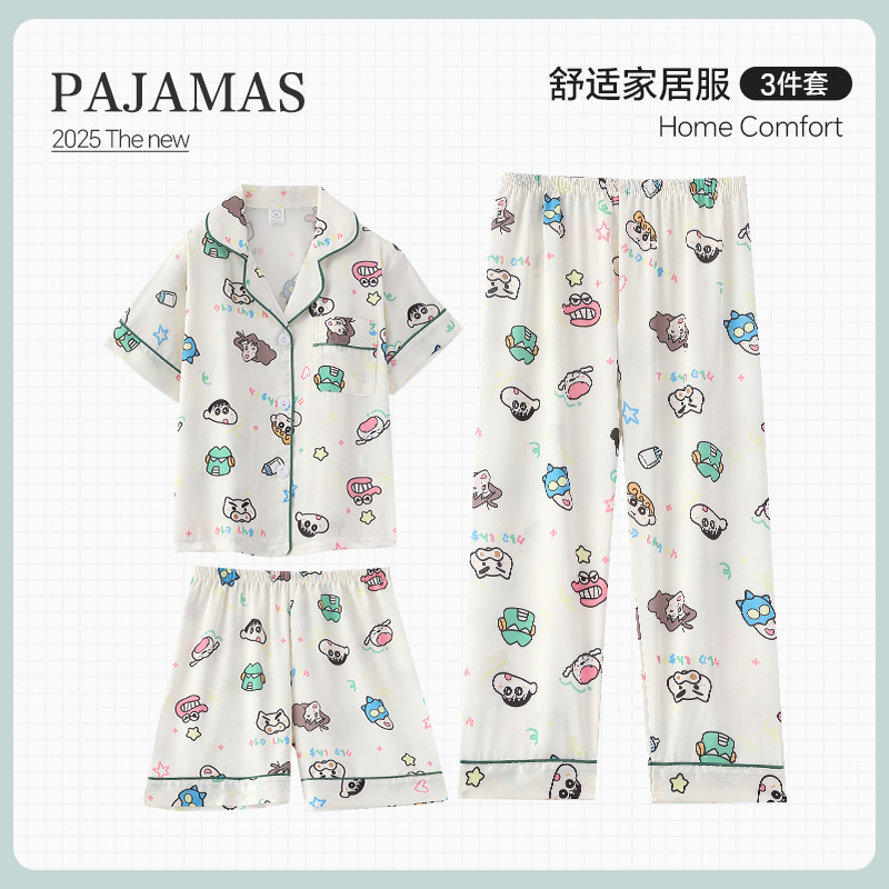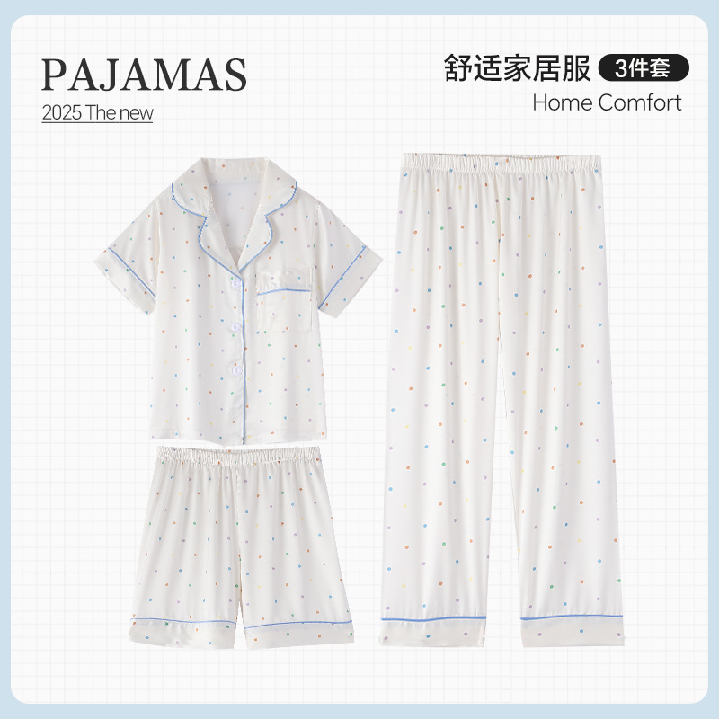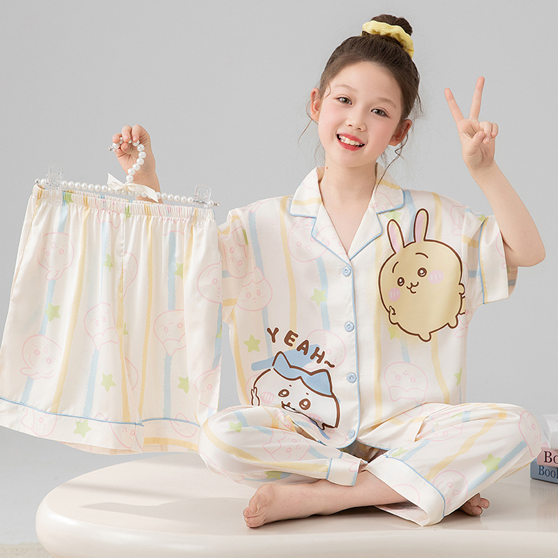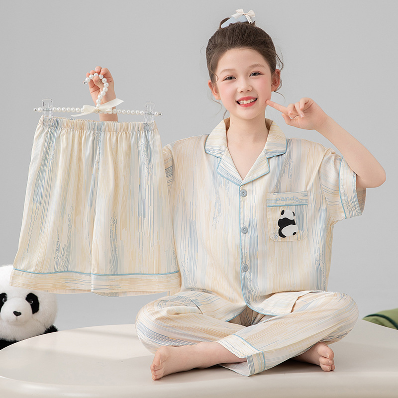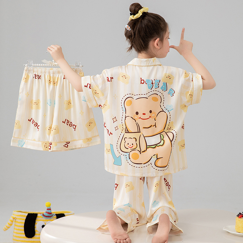 어린이 잠옷 여름 얼음 실크 얇은 3 피스 세트 여아 반팔 바지 큰 아이와 여자를위한 서양 스타일 가정 의류
