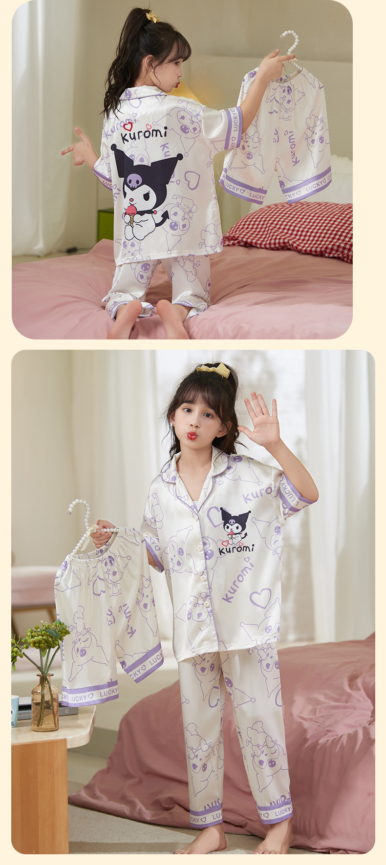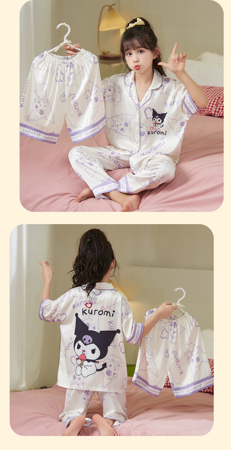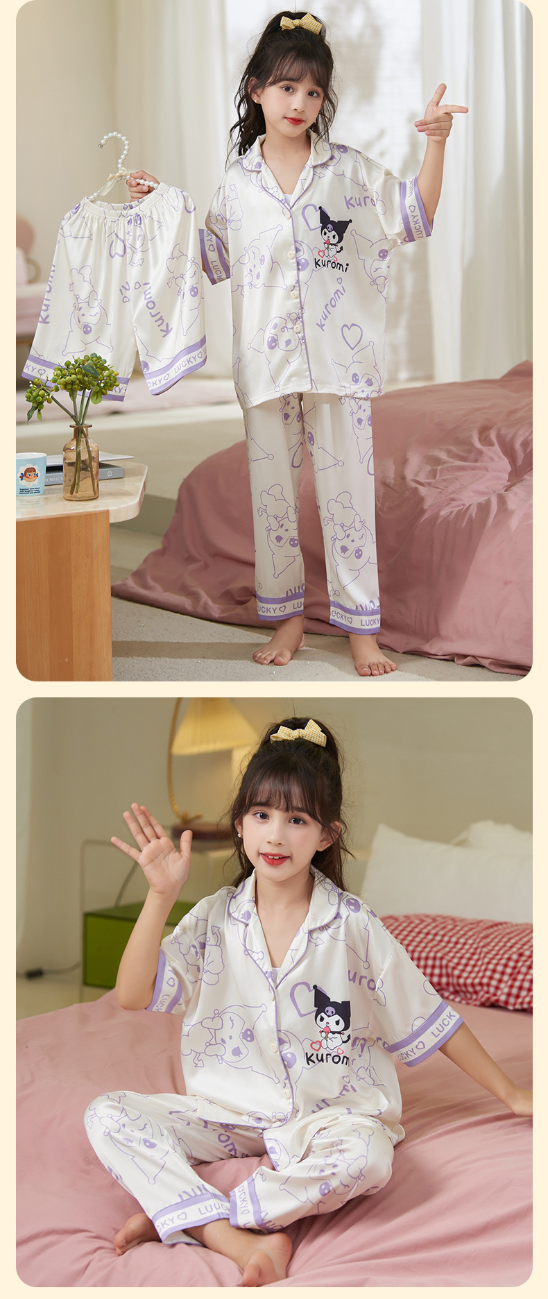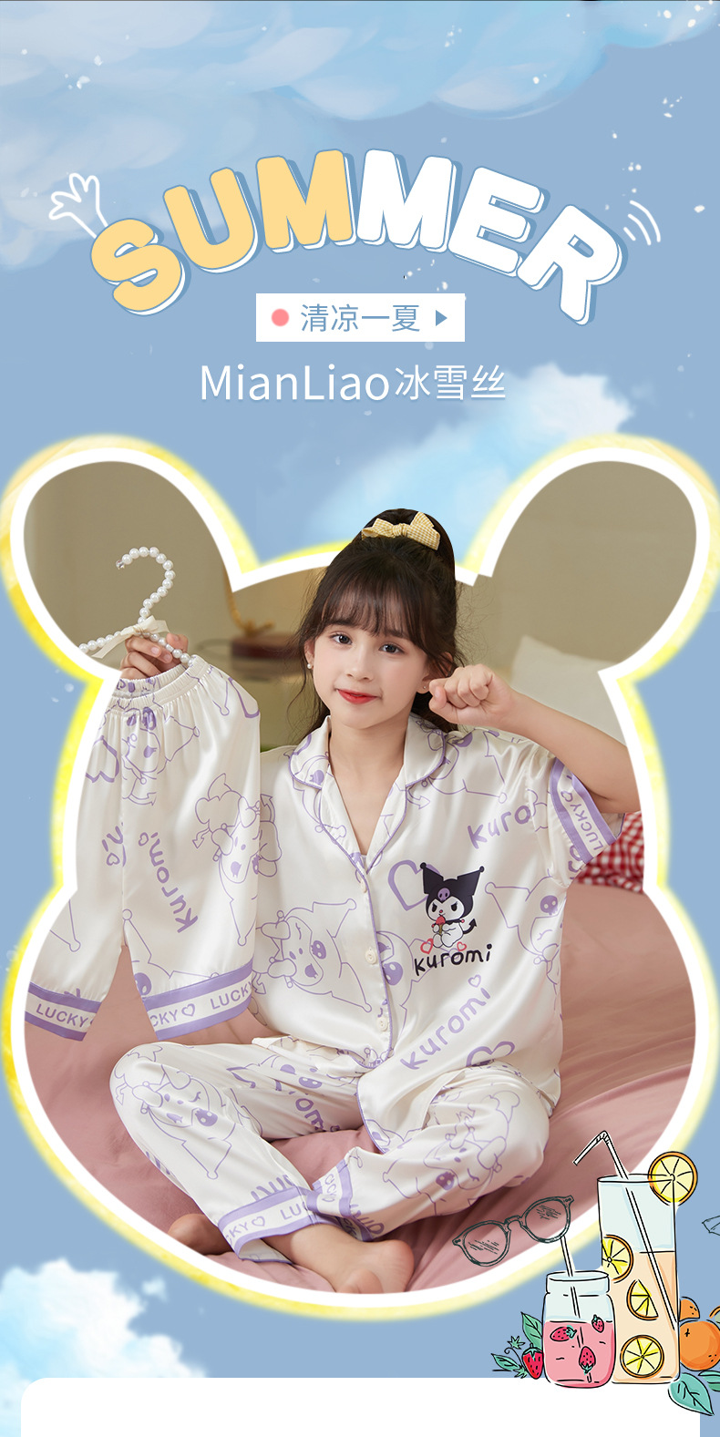 어린이 잠옷 여름 얼음 실크 얇은 3 피스 세트 여아 반팔 바지 큰 아이와 여자를위한 서양 스타일 가정 의류