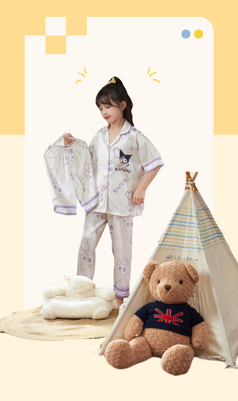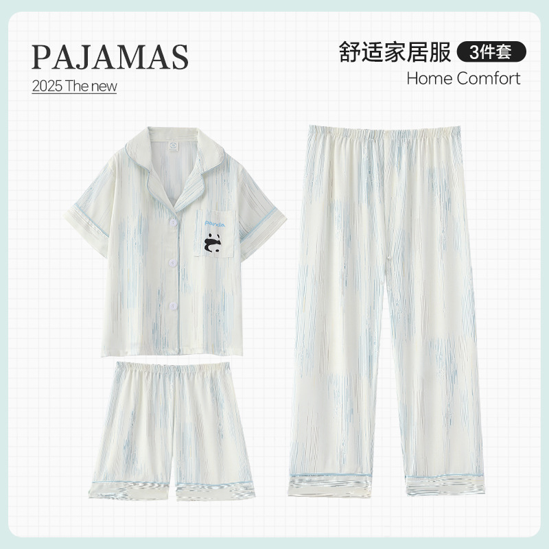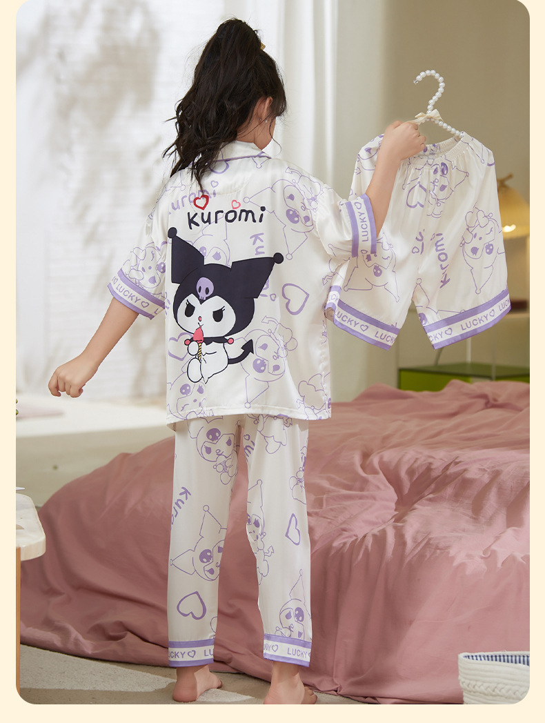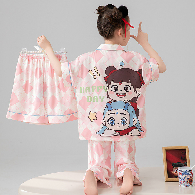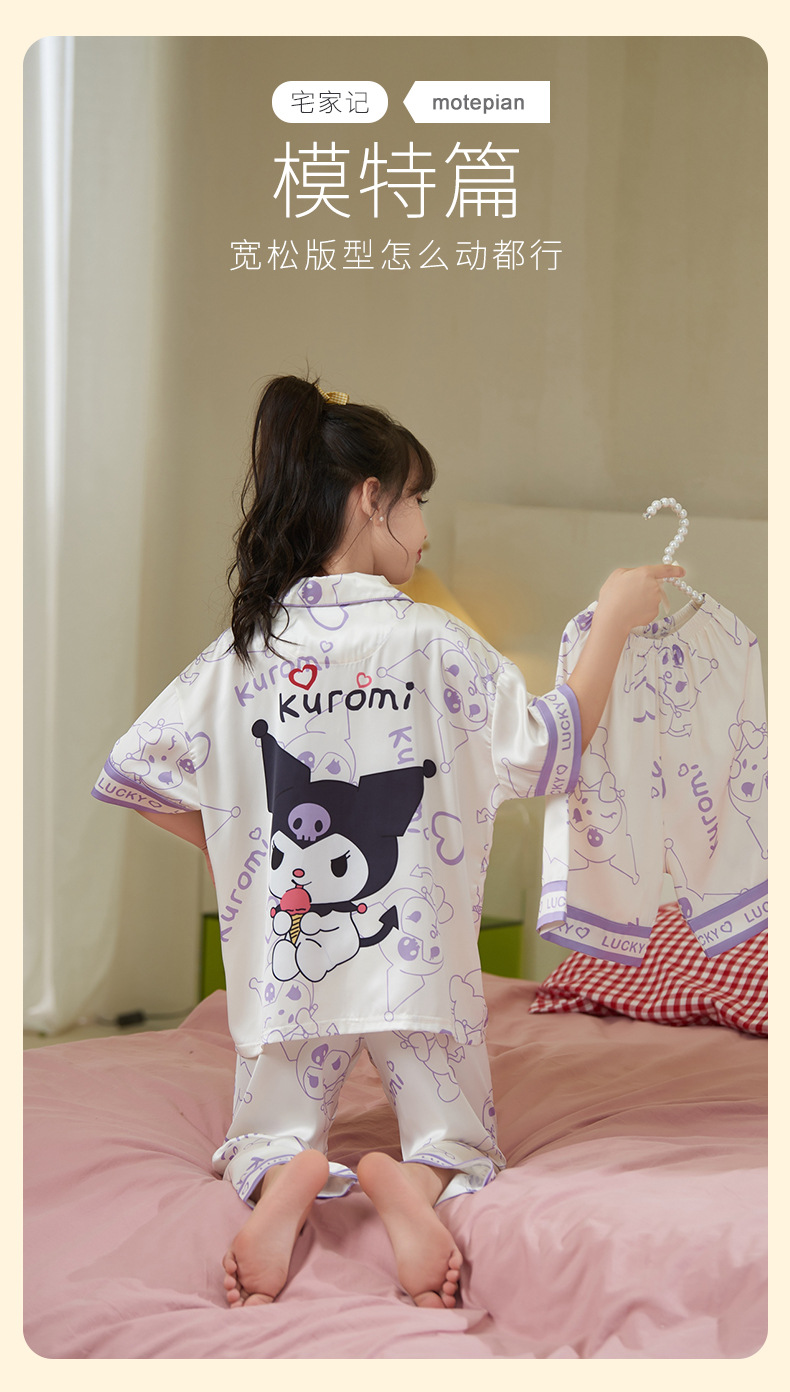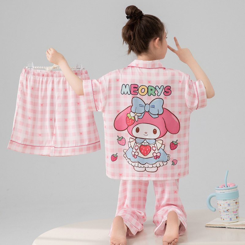어린이 잠옷 여름 얼음 실크 얇은 3 피스 세트 여아 반팔 바지 큰 아이와 여자를위한 서양 스타일 가정 의류