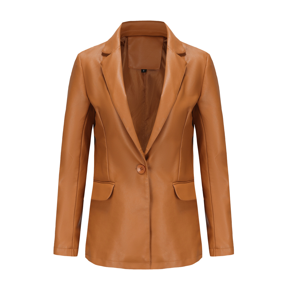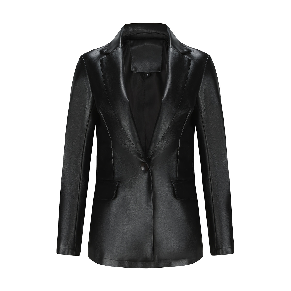 2023 실제 촬영 새로운 유럽과 미국의 작은 세트 크로스 보더 긴 소매 코트 여성의 싱글 그레인 버클 통근 캐주얼 단색 가죽 코트
