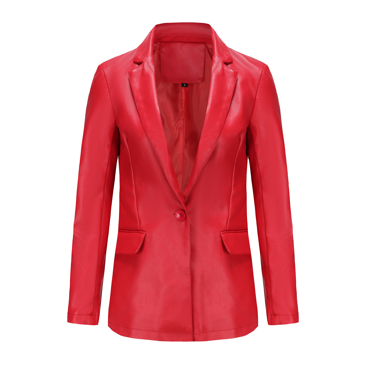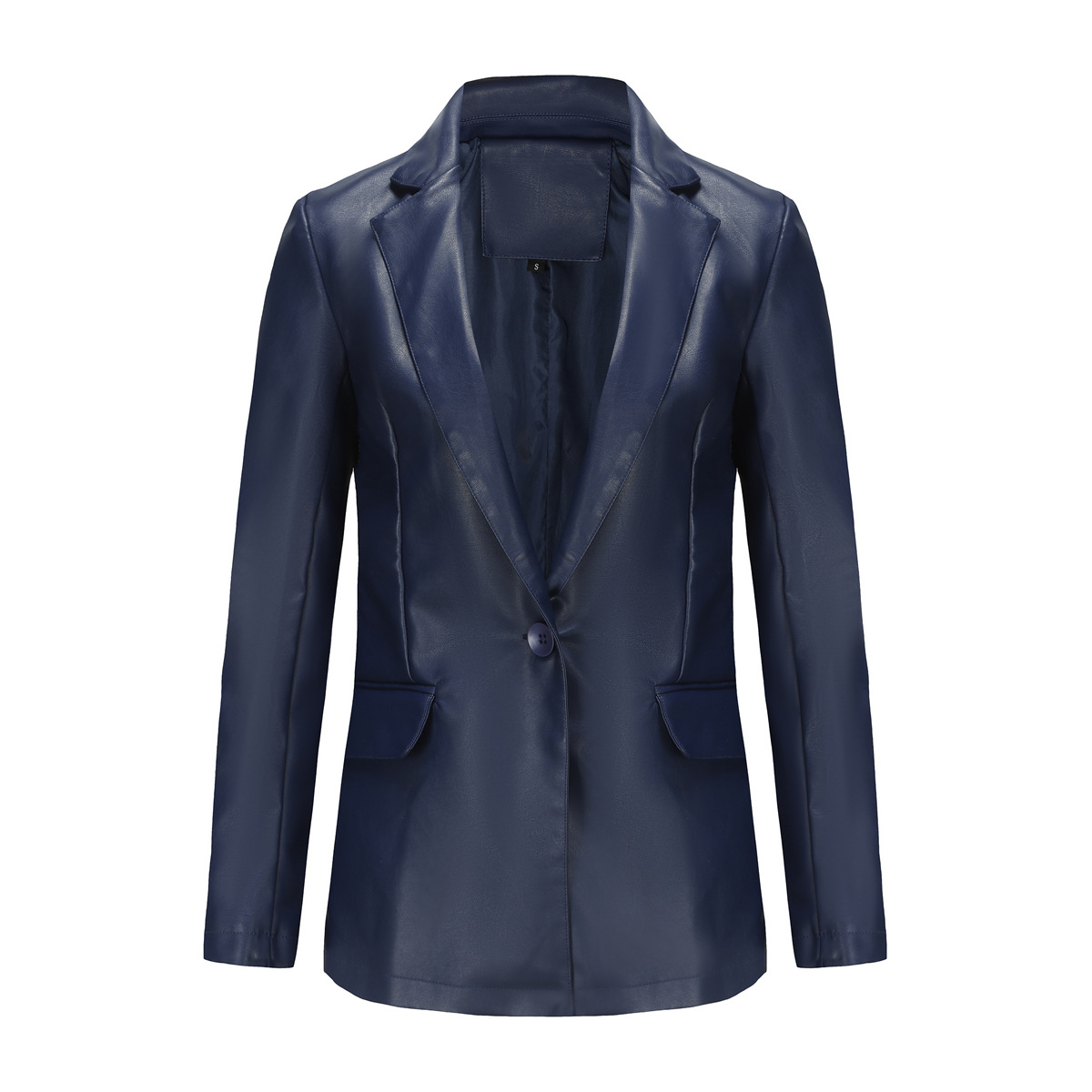 2023 실제 촬영 새로운 유럽과 미국의 작은 세트 크로스 보더 긴 소매 코트 여성의 싱글 그레인 버클 통근 캐주얼 단색 가죽 코트스토어 가기