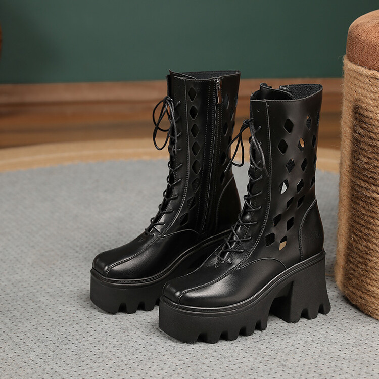 유럽과 미국 대외 무역 가죽 부츠 여성용 하이힐 레이스 업 콜드 부츠 로마 미들 부츠 봄과 가을 두꺼운 밑창 마틴 부츠 34-43