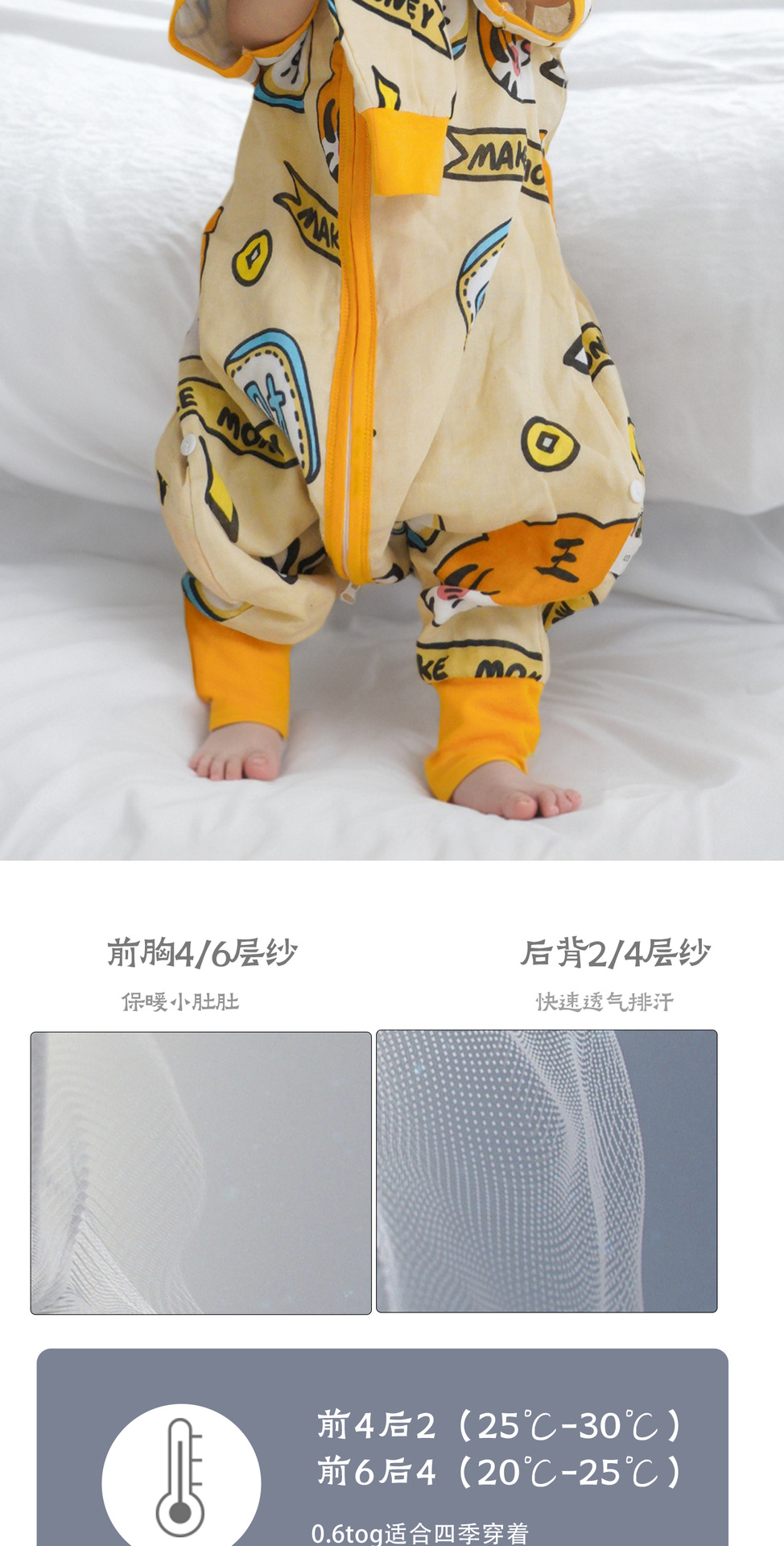 竹棉:70%竹纤维+30%纯棉纱布,S M这两个尺码是腿部扣子设计,L-3XL是后面横拉链的设计