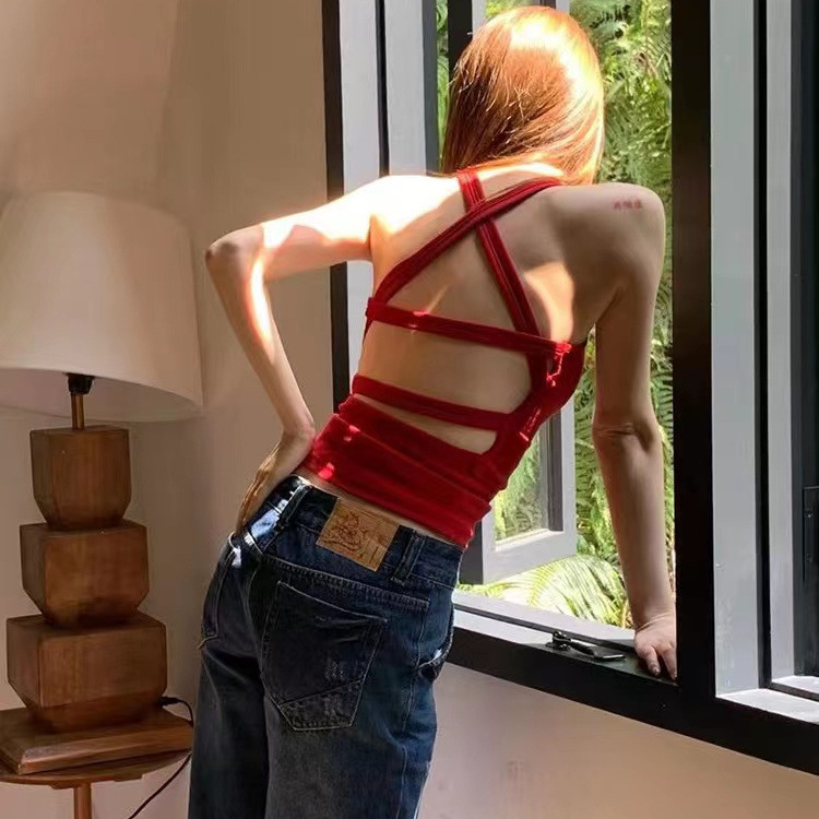 가슴 패드가 있는 홀터넥 캐미솔 여성 여름 디자인 감각 있는 니치 스타일 이너웨어 숏탑 외출복