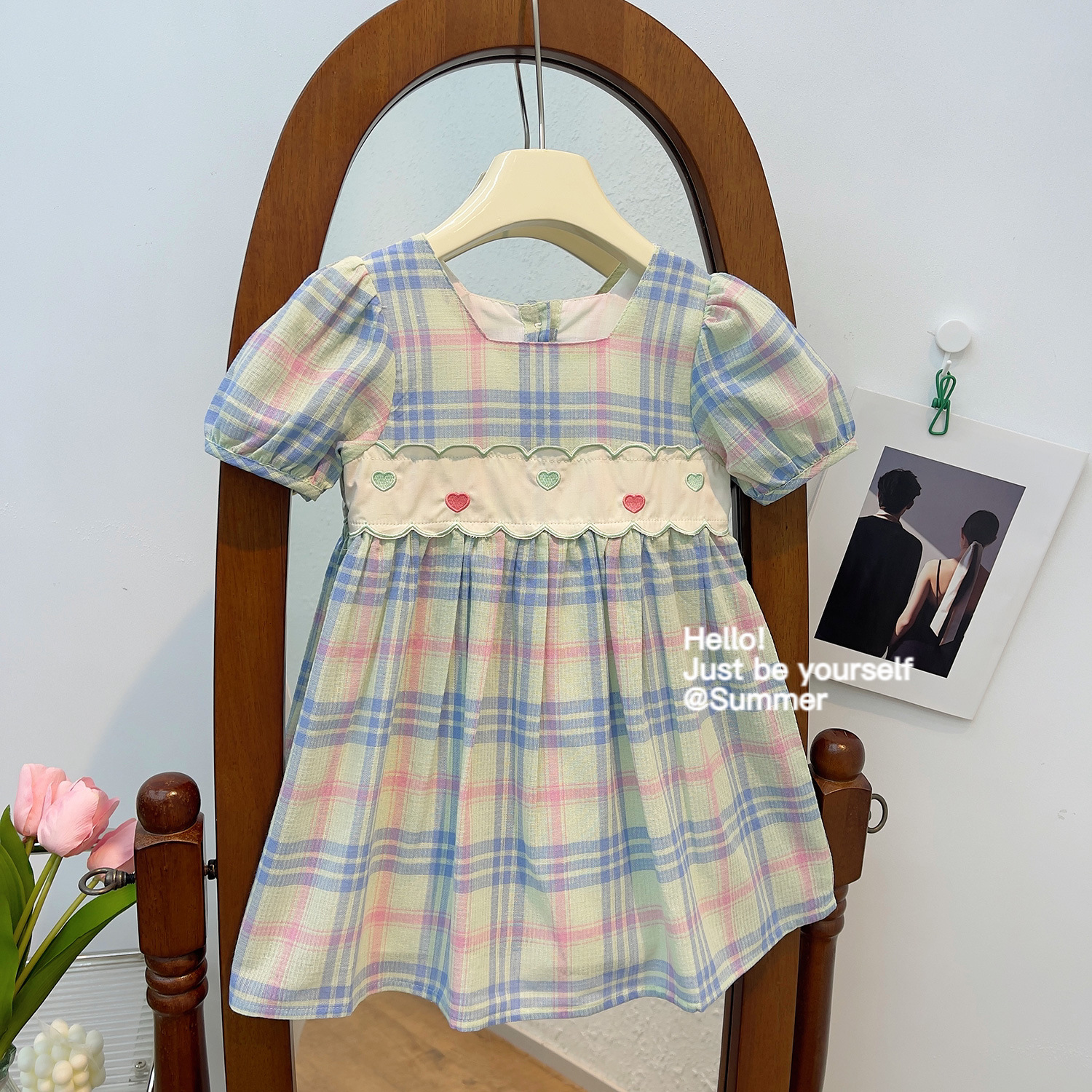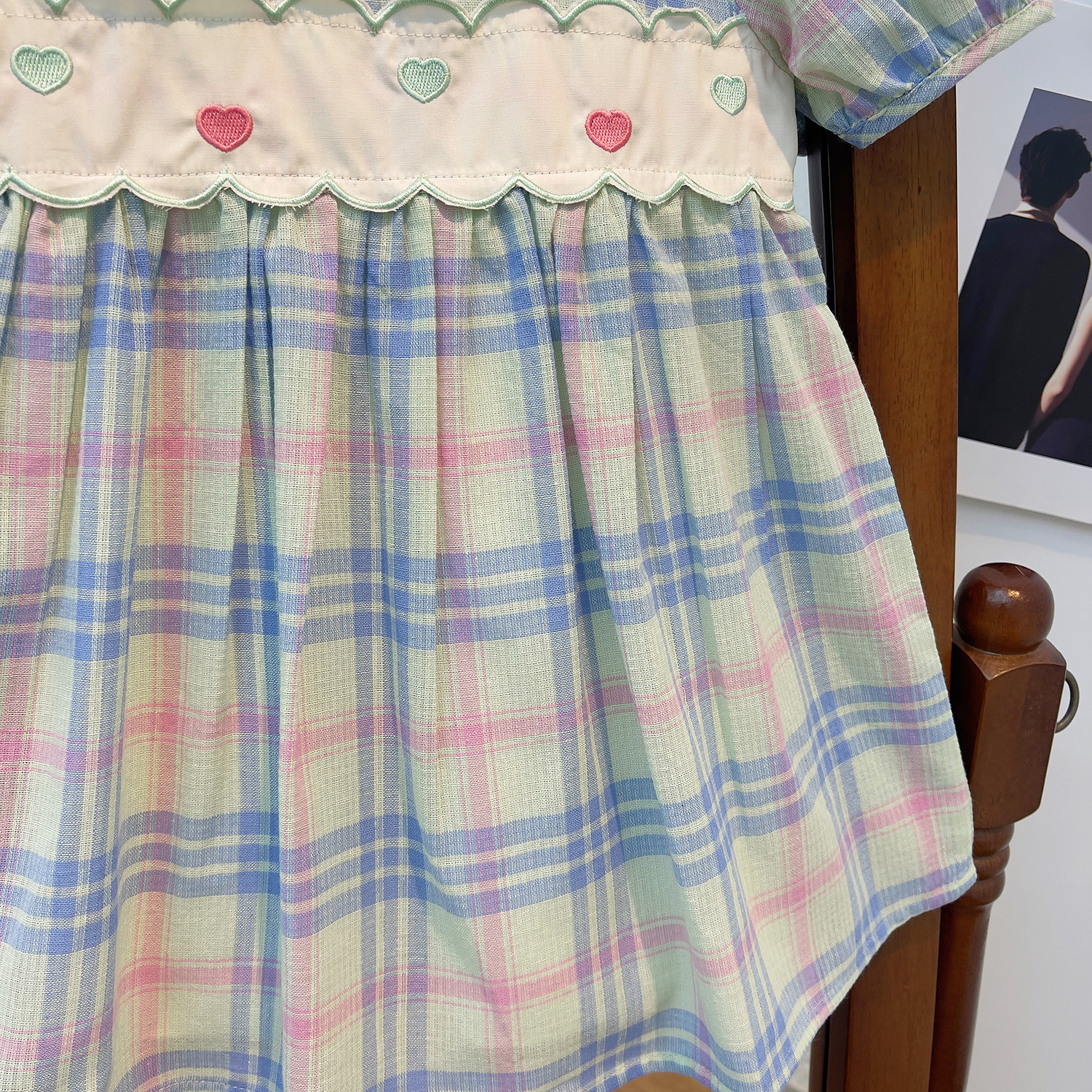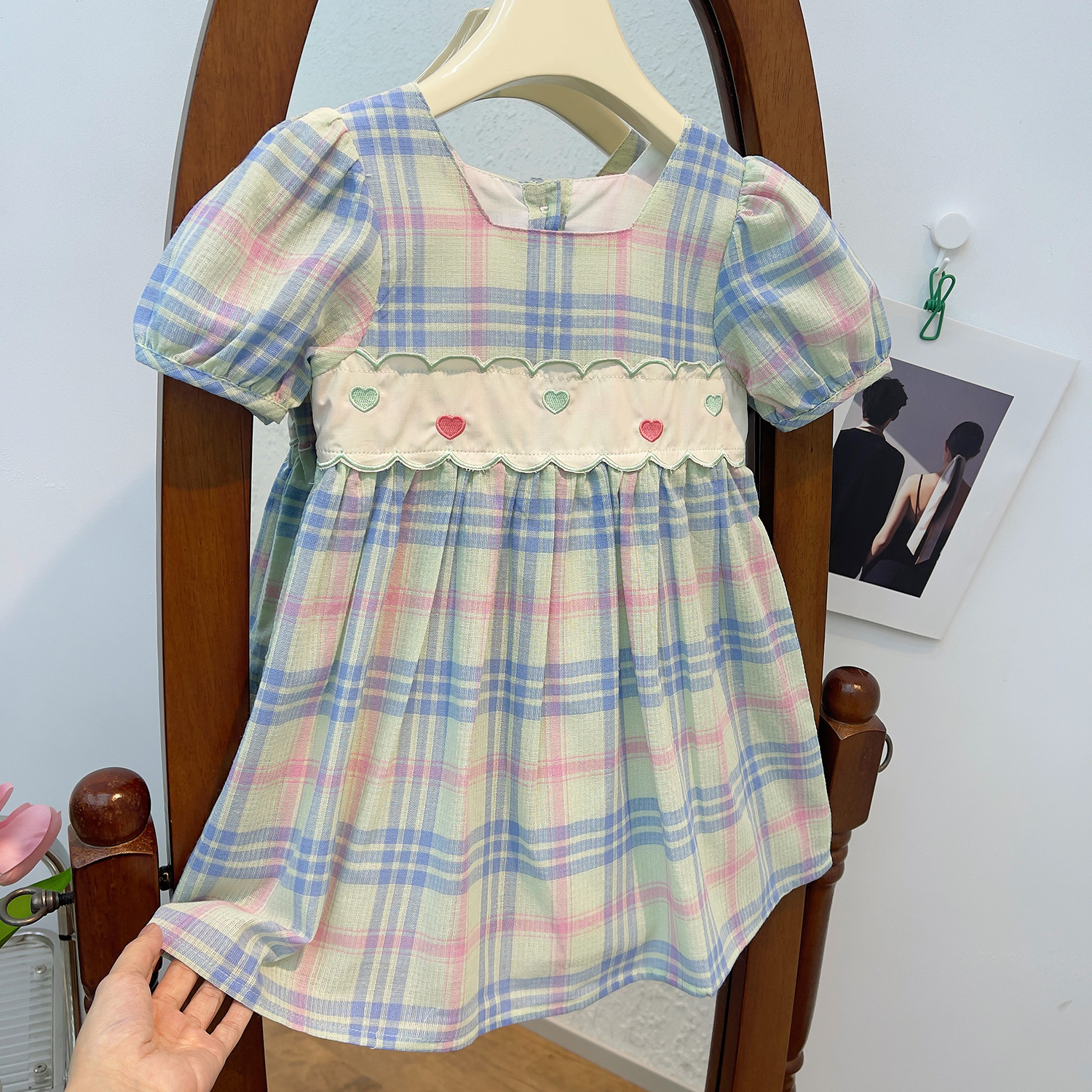 어린이 한국 스타일 유행 스타일 원피스 여름 2023 새로운 스타일 소녀의 사랑 자수 사각 칼라 격자 무늬 레이스 어린이 치마스토어 가기