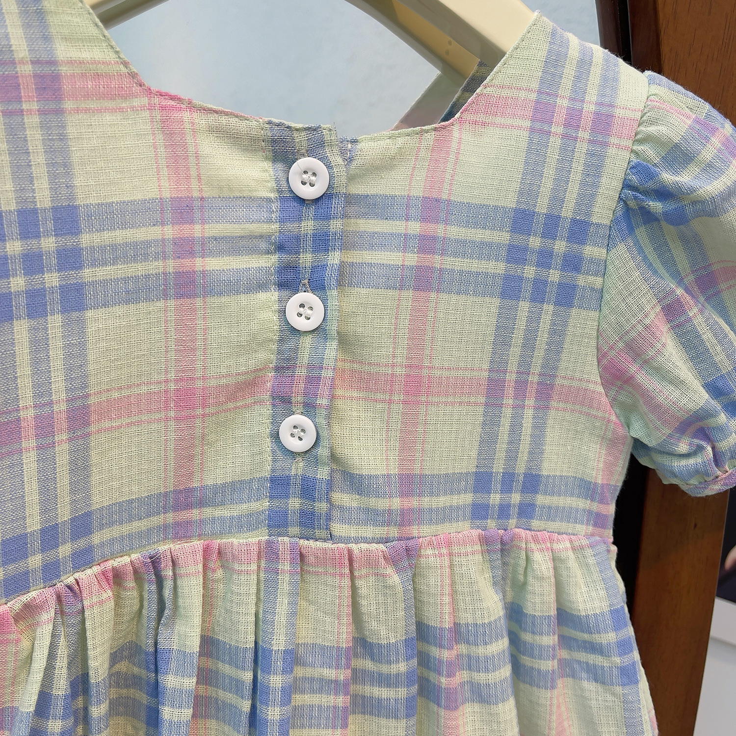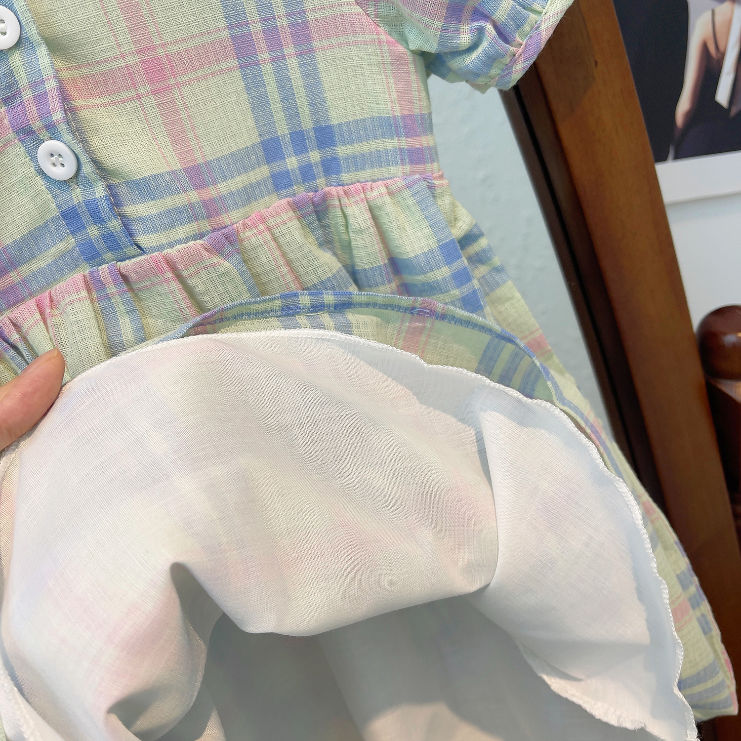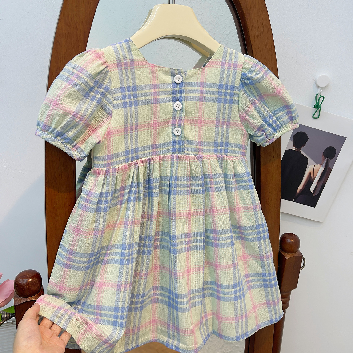 어린이 한국 스타일 유행 스타일 원피스 여름 2023 새로운 스타일 소녀의 사랑 자수 사각 칼라 격자 무늬 레이스 어린이 치마스토어 가기