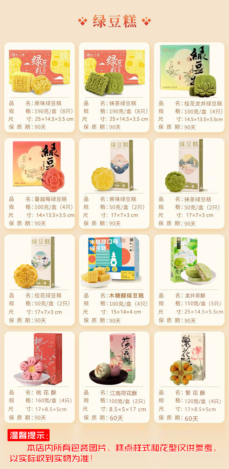 商品图片仅供展示使用(包装和糕点图案、形状样式工厂会不定期更新),以实际收到的实物为准,本店不接受指定包装和糕点样式,谢谢理解和支持!