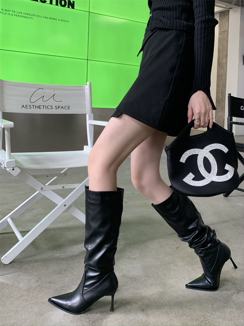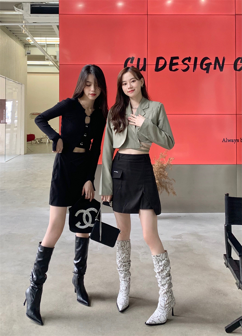 2024 봄과 가을 새로운 하이힐 뱀 패턴 주름 파일 부츠 뾰족한 발가락 스틸레토 미드 힐 부츠 무릎 높이 이하스토어 가기