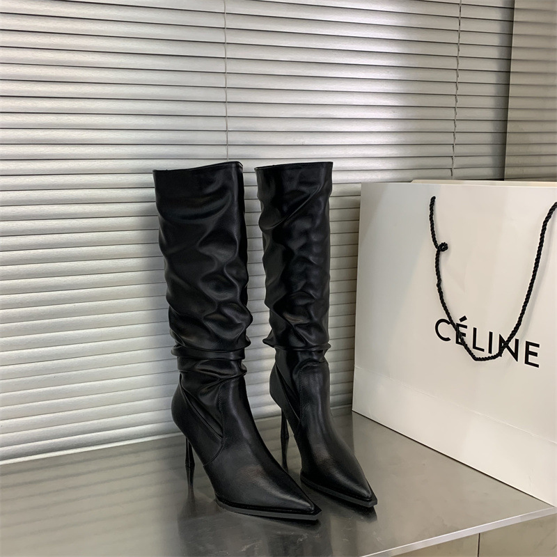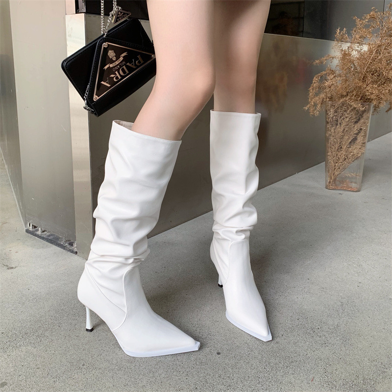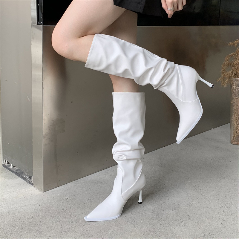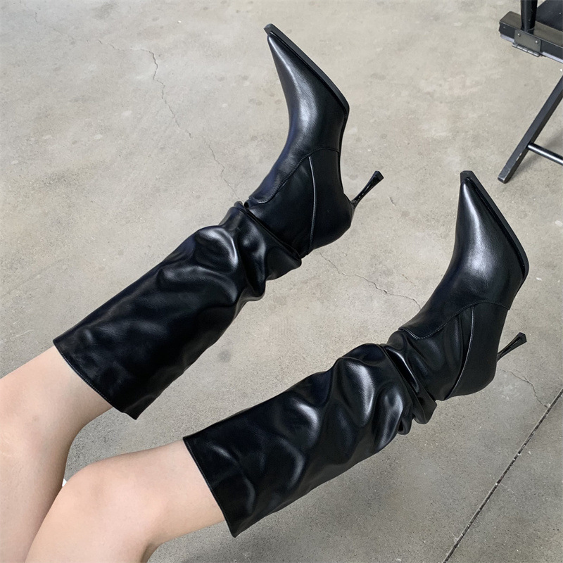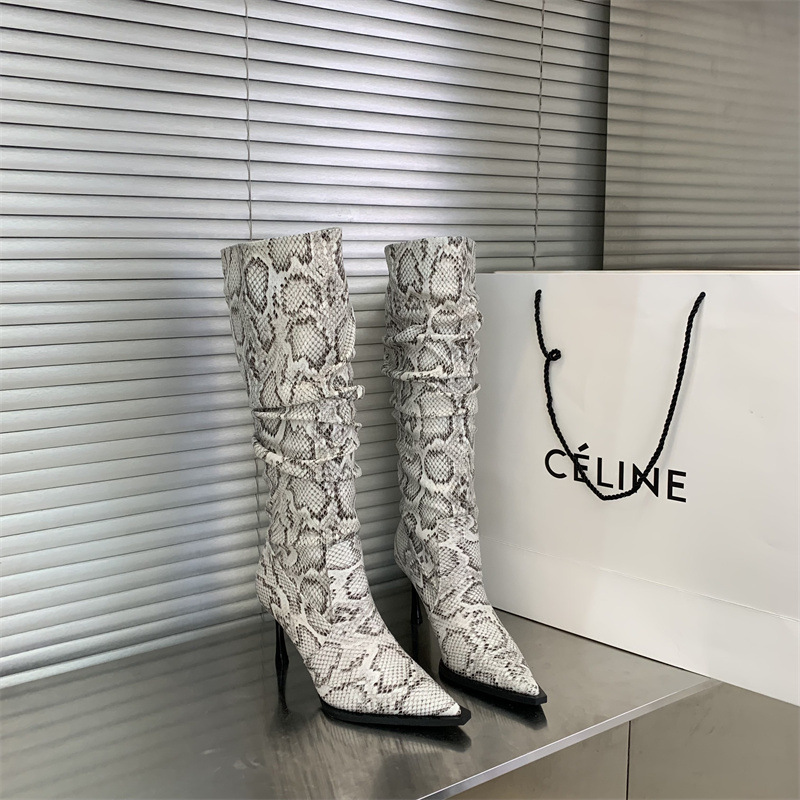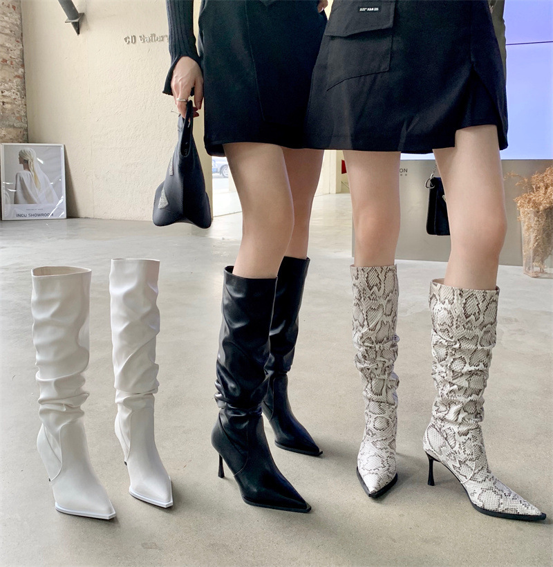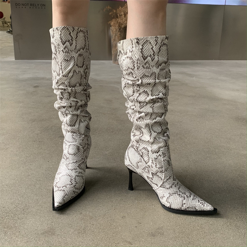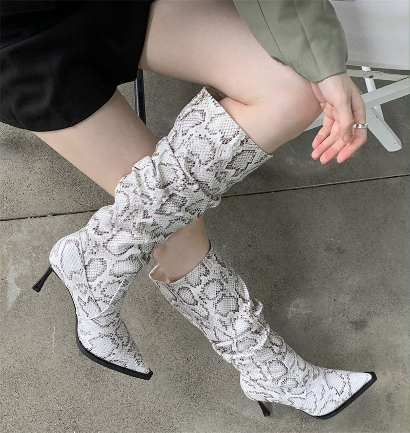 2024 봄과 가을 새로운 하이힐 뱀 패턴 주름 파일 부츠 뾰족한 발가락 스틸레토 미드 힐 부츠 무릎 높이 이하