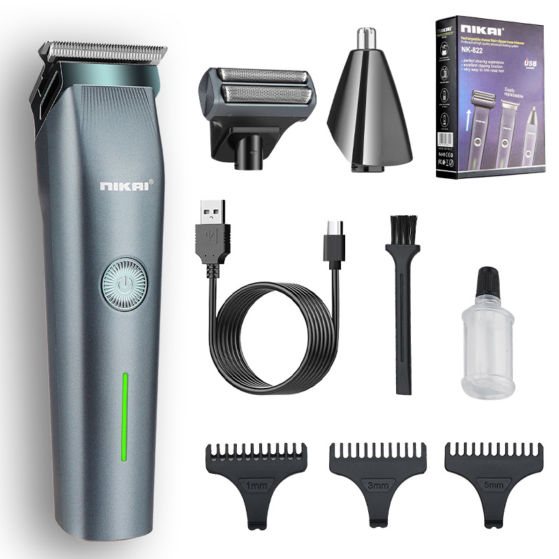 产品配件:理发器+鼻毛刀头+剃须刀头+USB充电线+限位梳*3(1 2 3mm)+清洁刷+英文说明书+油瓶.