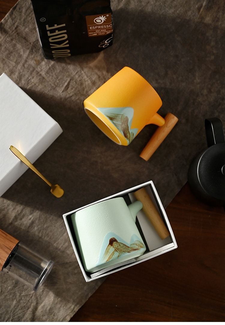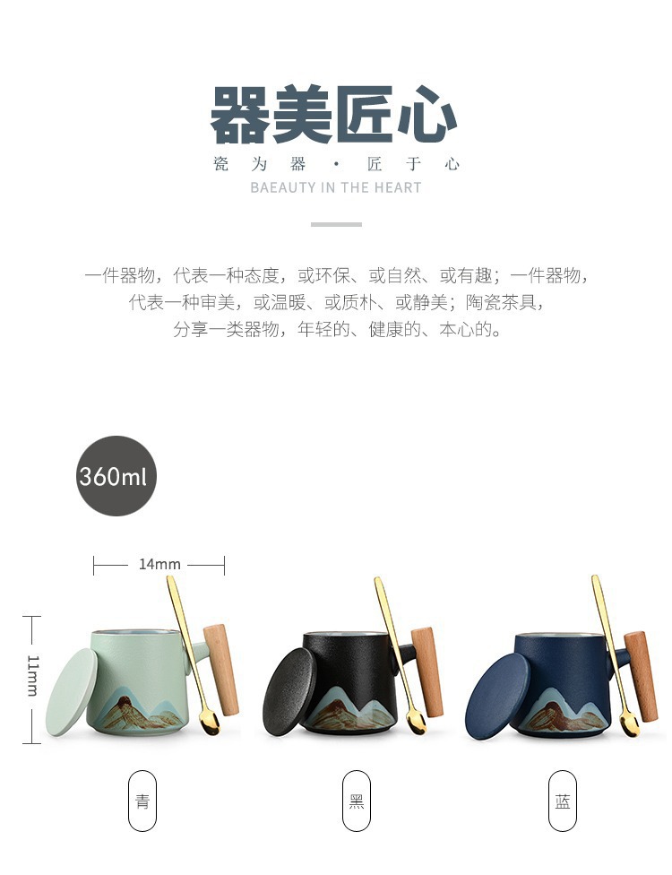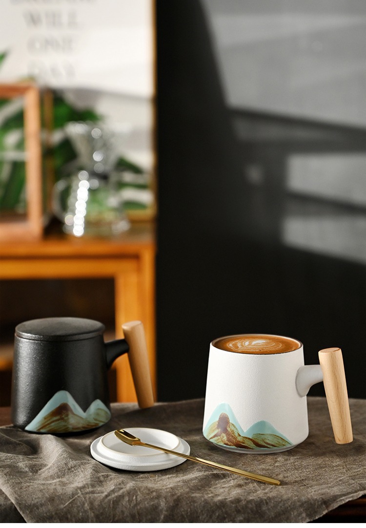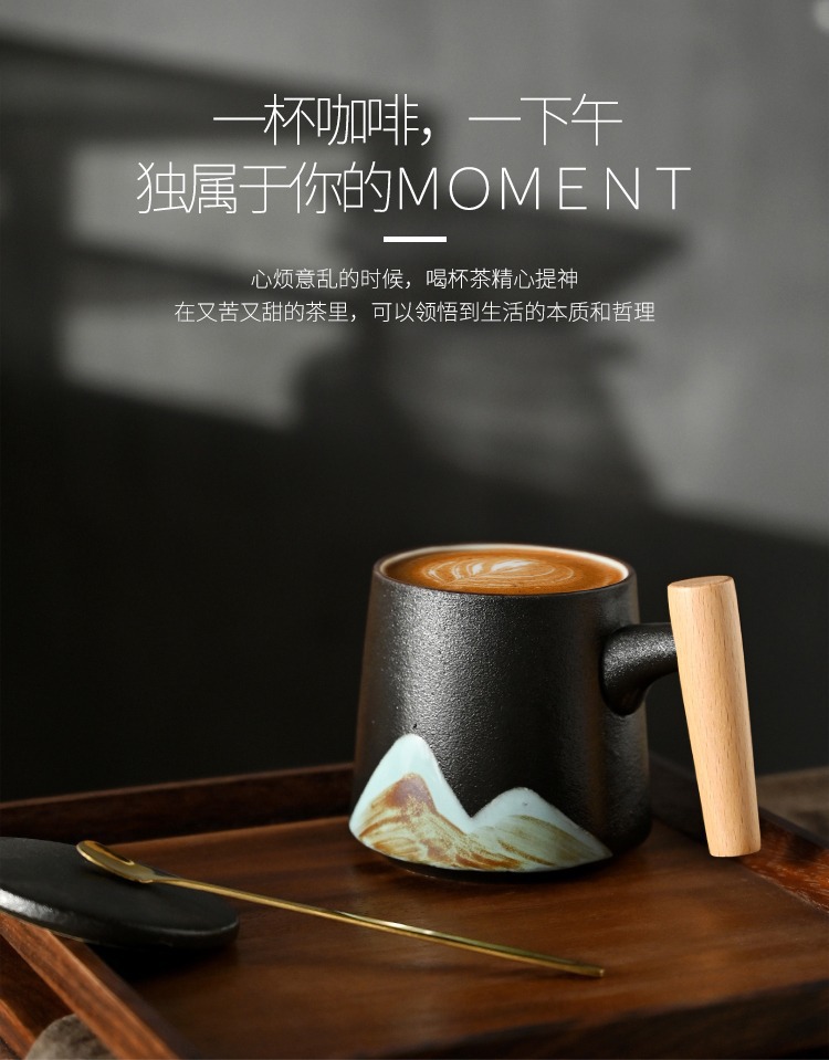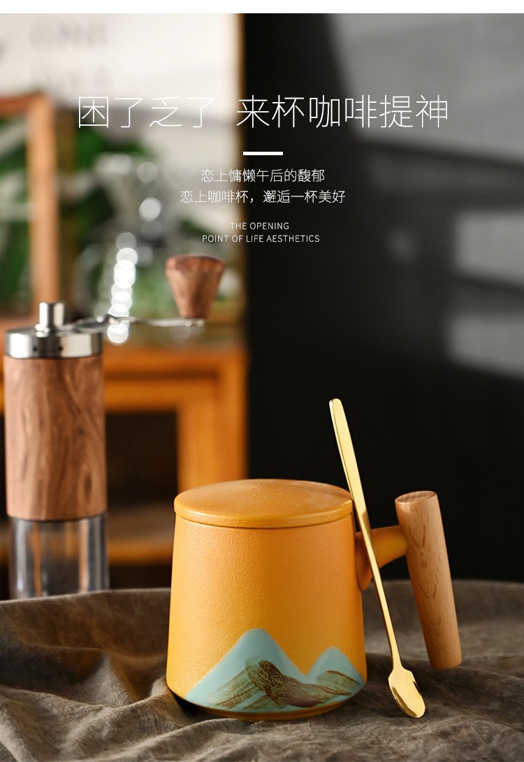 手绘远山木柄陶瓷咖啡马克杯带盖勺粗陶杯子办公水杯茶水带盖勺杯